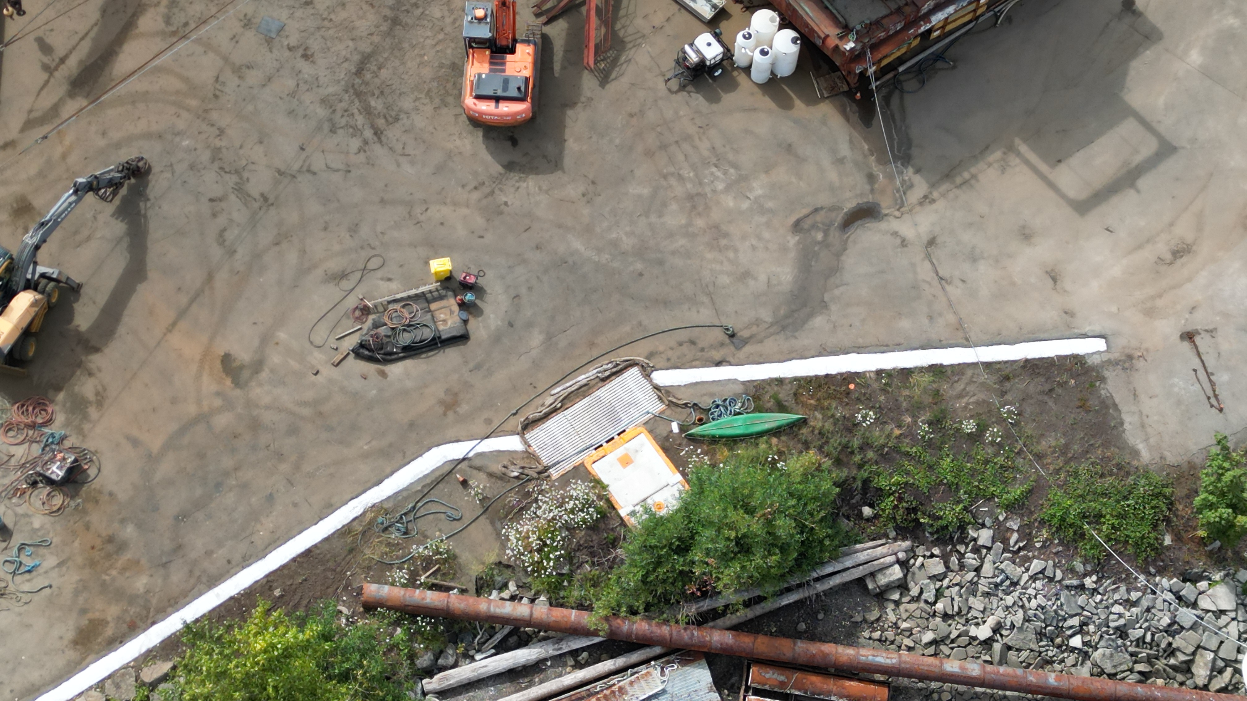 Oh look, they have cleaned up part of the area to the right and left of the “filtration system”. Why is there liquid coming from that barge on the right?