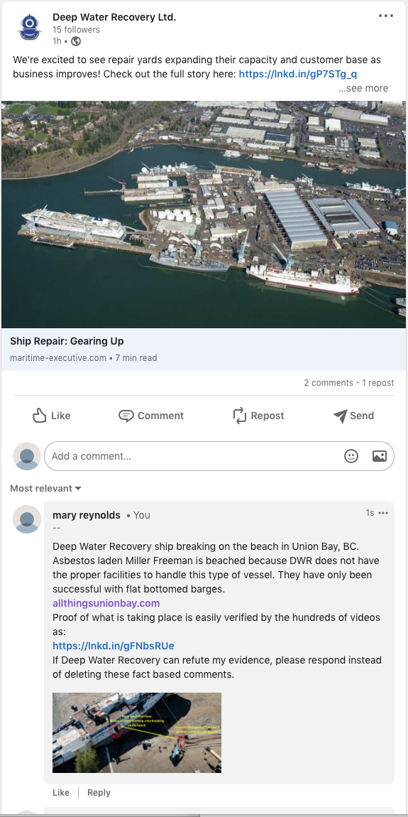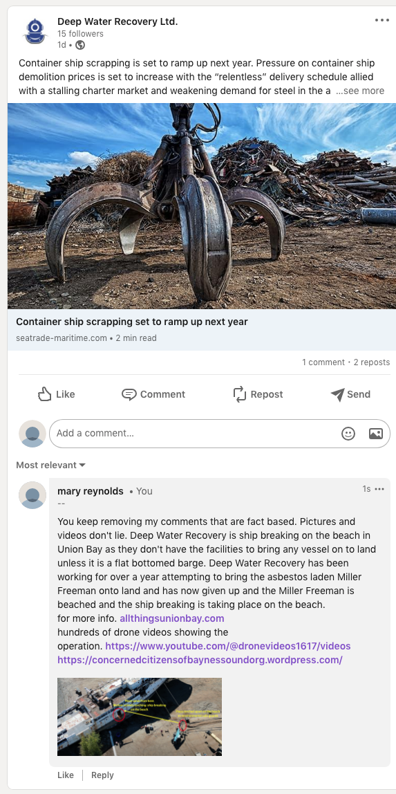 I’ve been leaving comments and pictures on DWR Linked In page and they are always trying to delete them so no one knows what a shitty company they are. https://www.linkedin.com/showcase/deep-water-recovery-ltd/posts/?feedView=all No problem – I just keep posting.