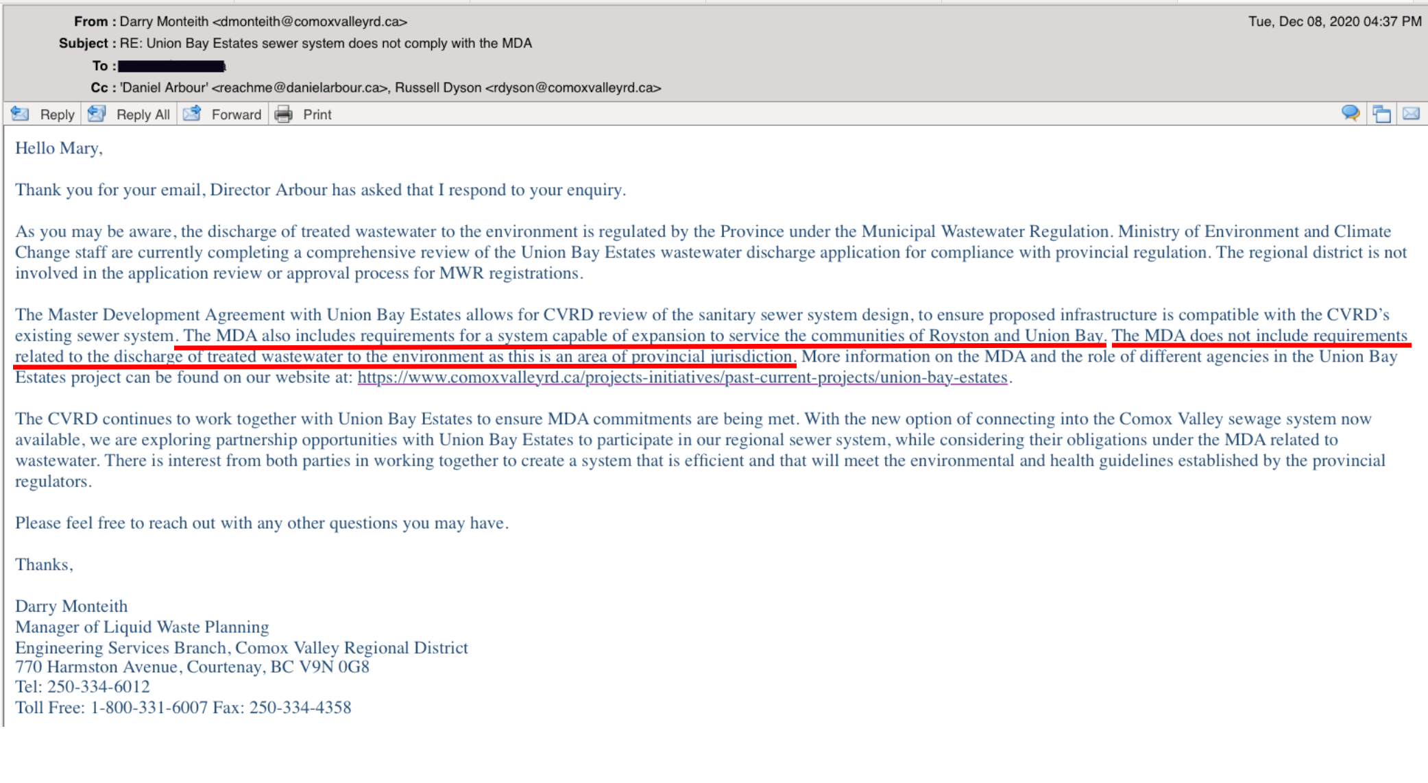 NOTE: Dyson was in charge and made decisions we are left with now – but he’s gone. No one is ever held responsible for what has transpired over the years leaving the landowners to ensure KIP has sewage in the future. So the CAO’s that have made changes to the MDA are gone and those … Continue reading Area A Director Daniel Arbour and CVRD Marc Ruttan and Russell Dyson – MDA double talk compliance with KIP aka Union Bay Estates