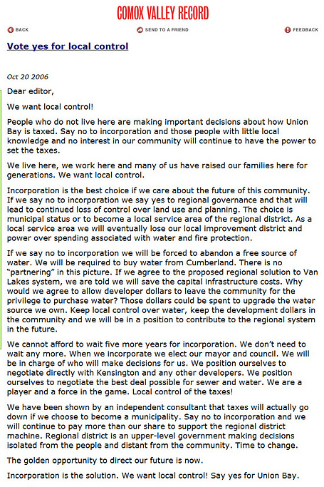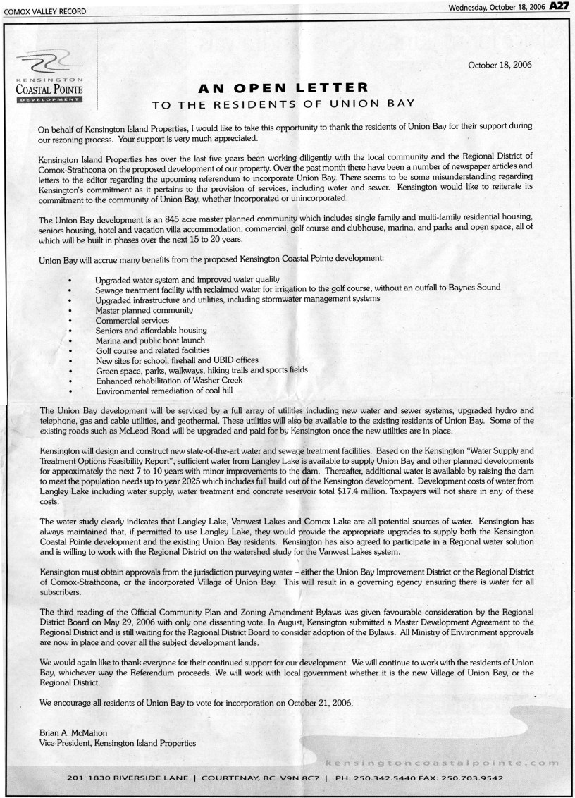 The UBID Board was a big cheerleader for KIP and had committees to answer questions while promoting a YES outcome for the referendum held in Oct. 2006, to become a Municipality. KIP was a big supporter and paid for a full page ad listing all the benefits KIP was offering and encouraging landowners to vote in favour of incorporation.