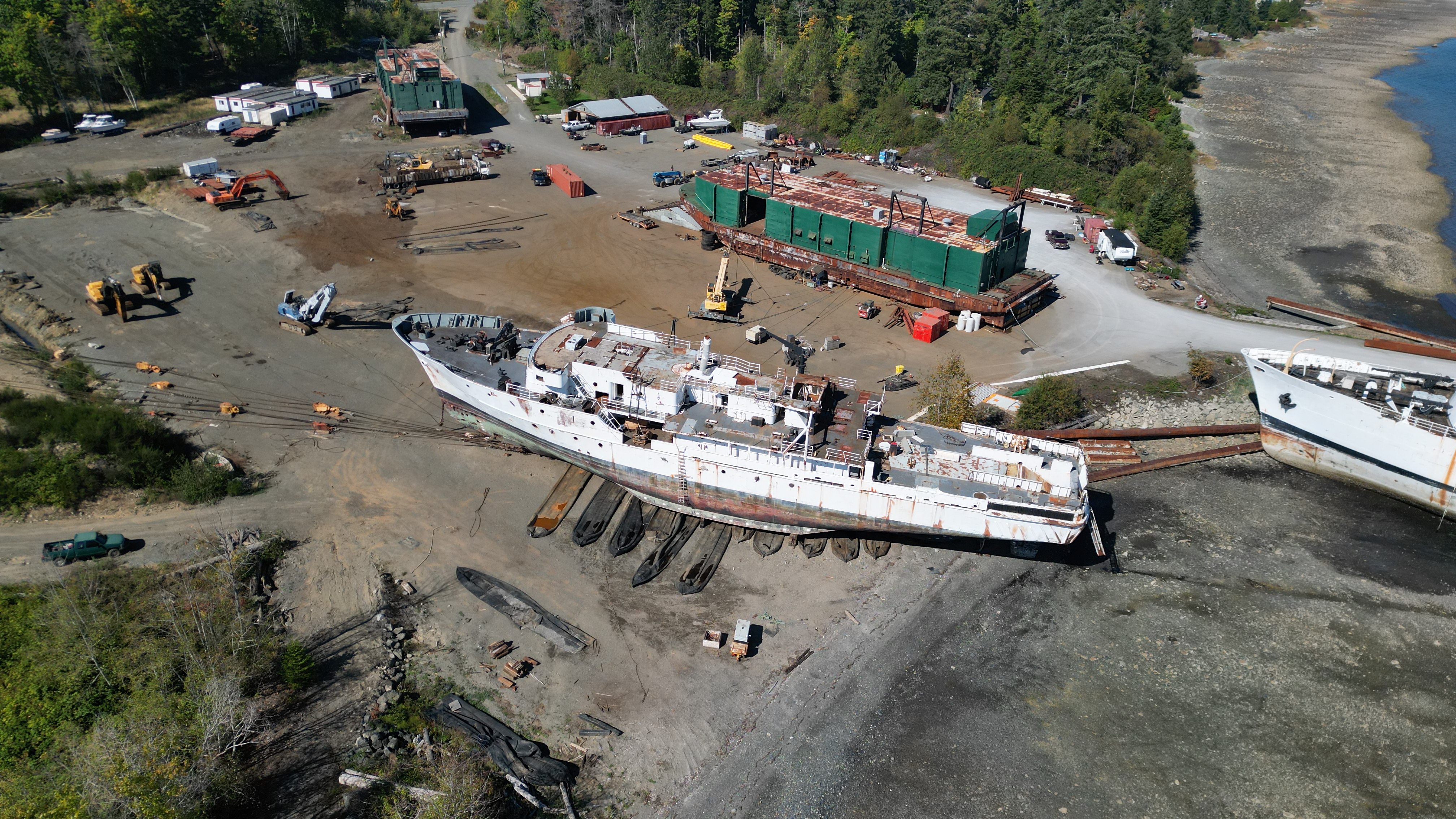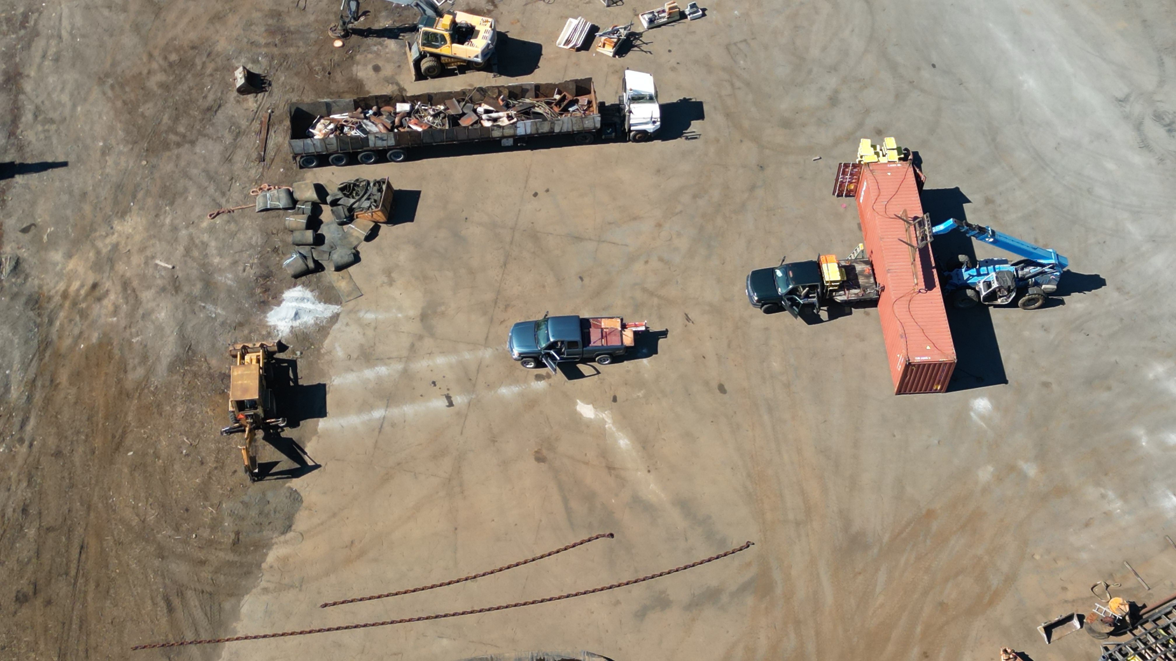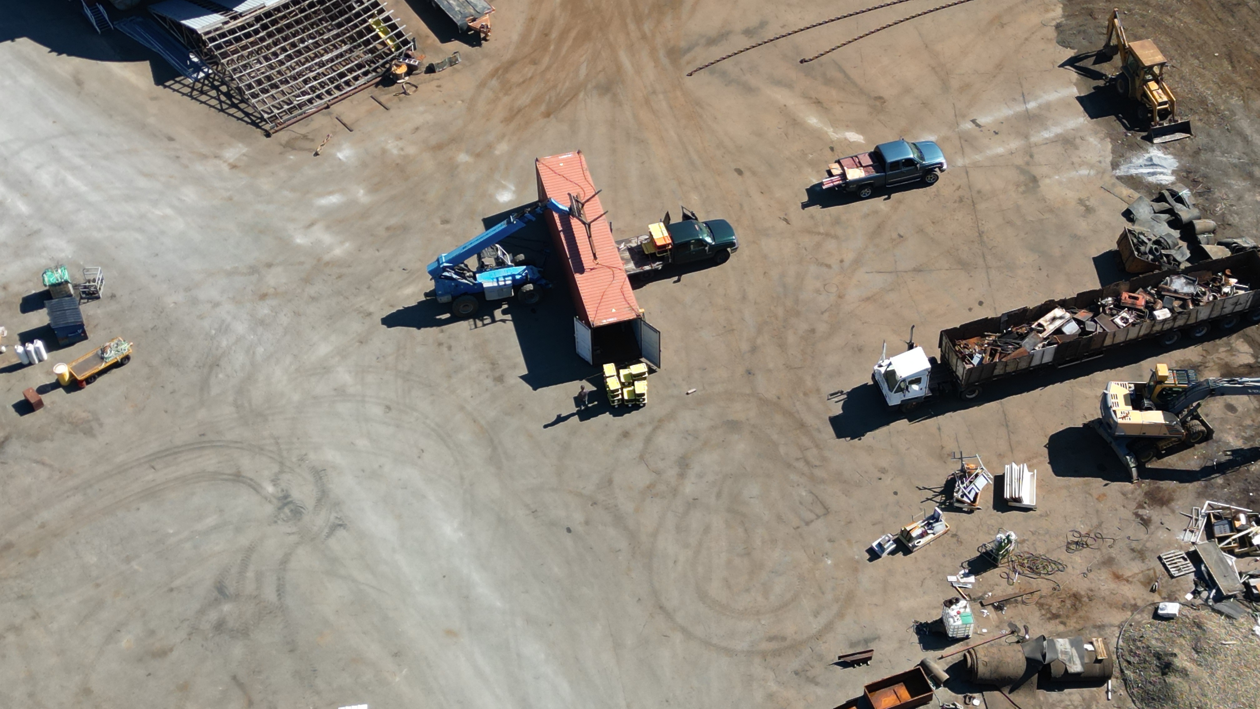 Two trucks arrived with their boxes full today, and the items were stored in the shipping container that was delivered yesterday. Then they moved the Johnny on the Spot and a large truck to the front of the area with the roof from the bunkhouse straddled across other shipping containers, using the large blue piece of equipment.