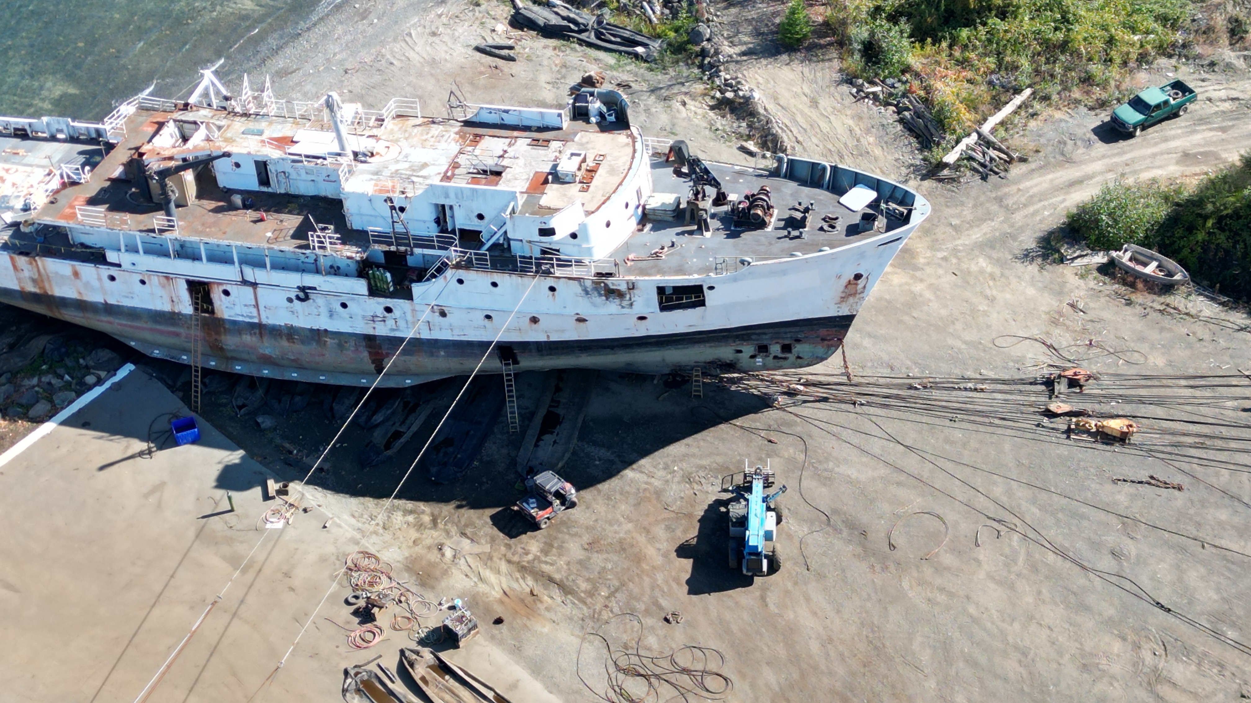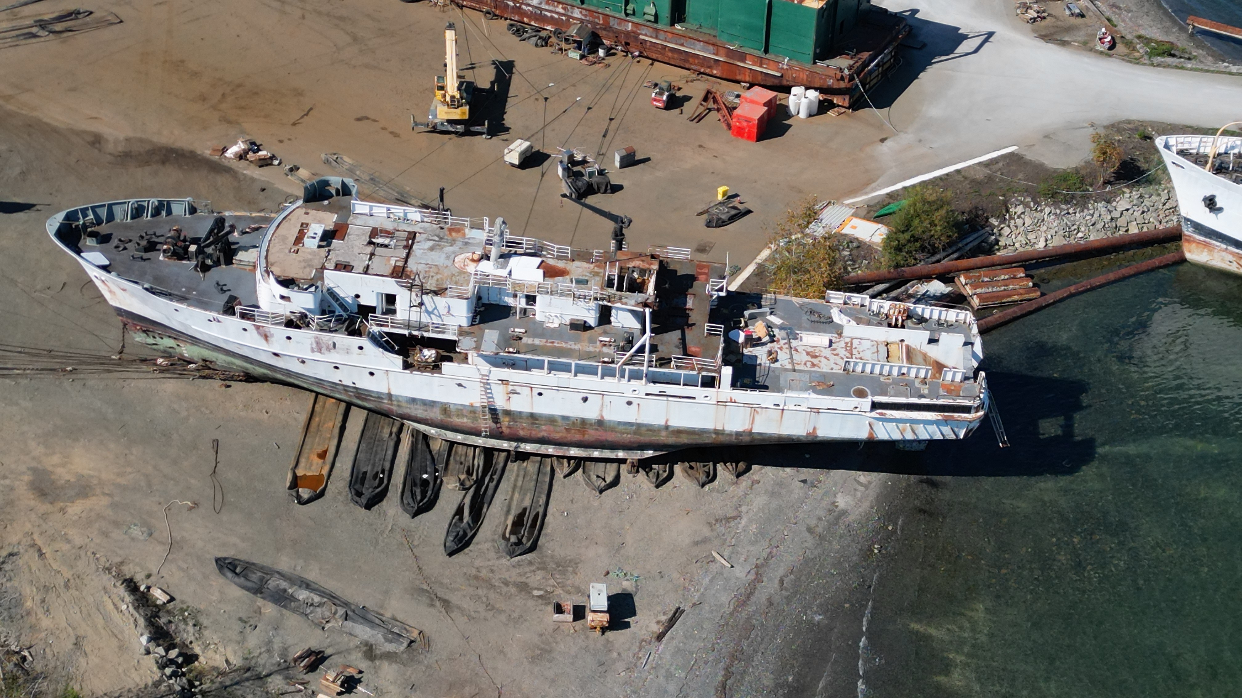 Spotted workers going up the ladder and inside the asbestos laden Miller Freeman today. DWR does whatever they want – ship breaking on the beach and no one to stop them.