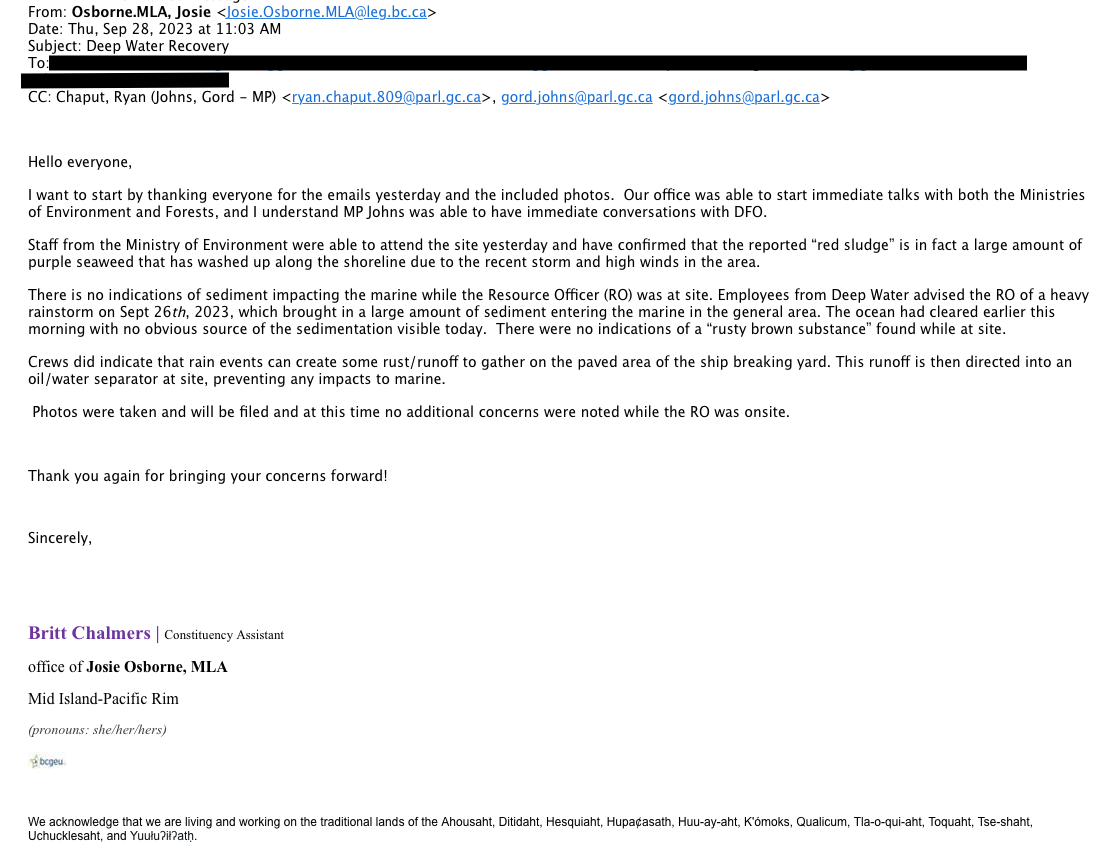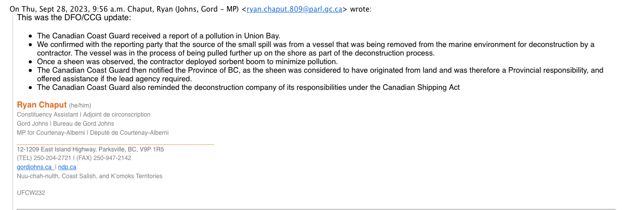 MP Gord Johns office provided an update from DFO. “…the source of the small spill was from a vessel that was being removed from the marine environment for deconstruction…”