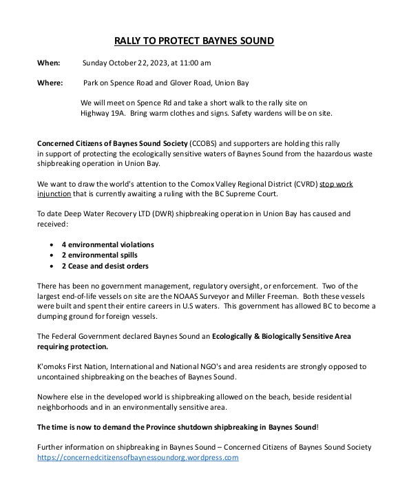 Area A Director, CVRD, Deep Water Recovery LLC Union Bay, Deep Water Recovery Ship Breaking in Union Bay, Government, Union Bay Ship Breaking