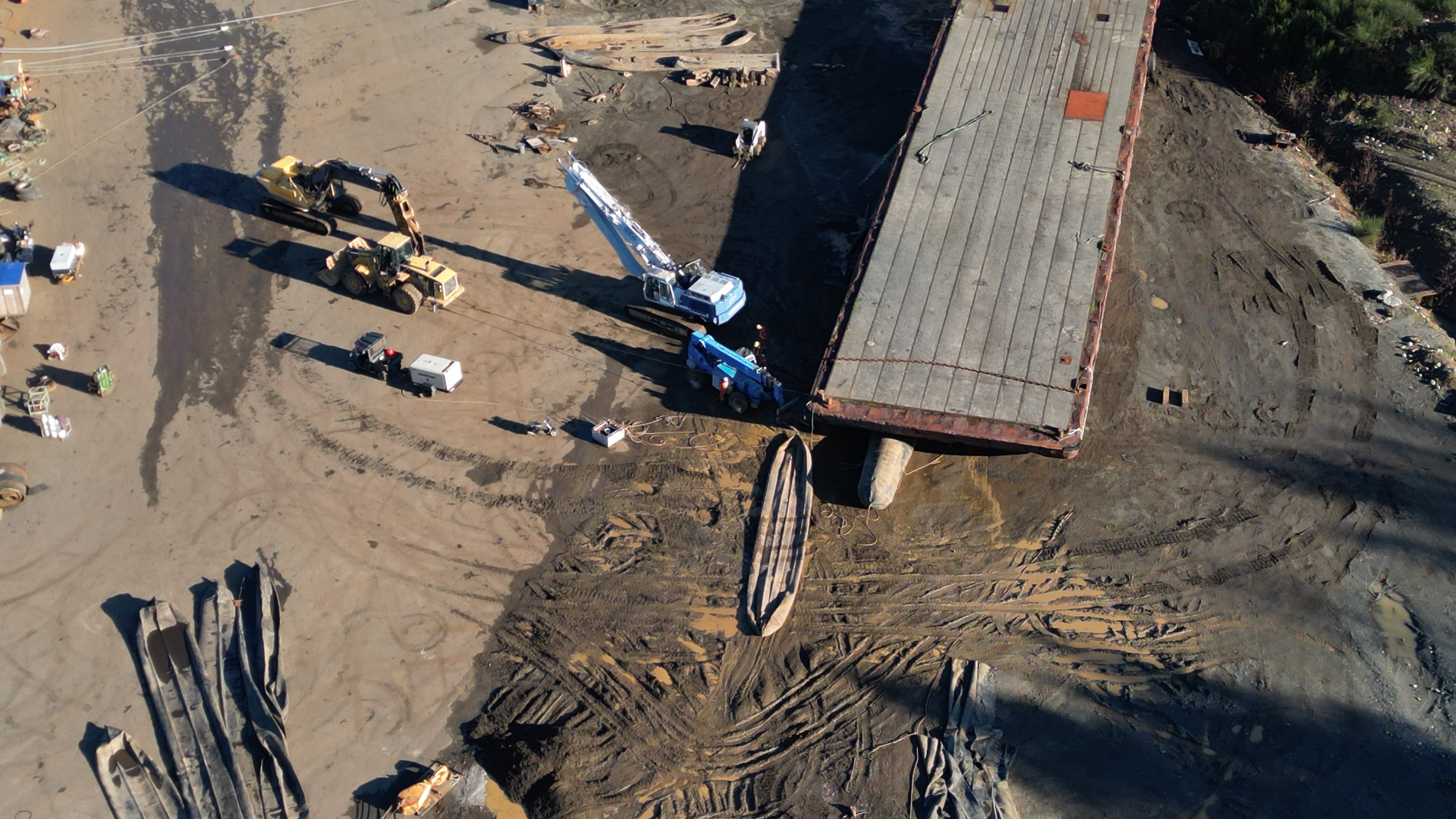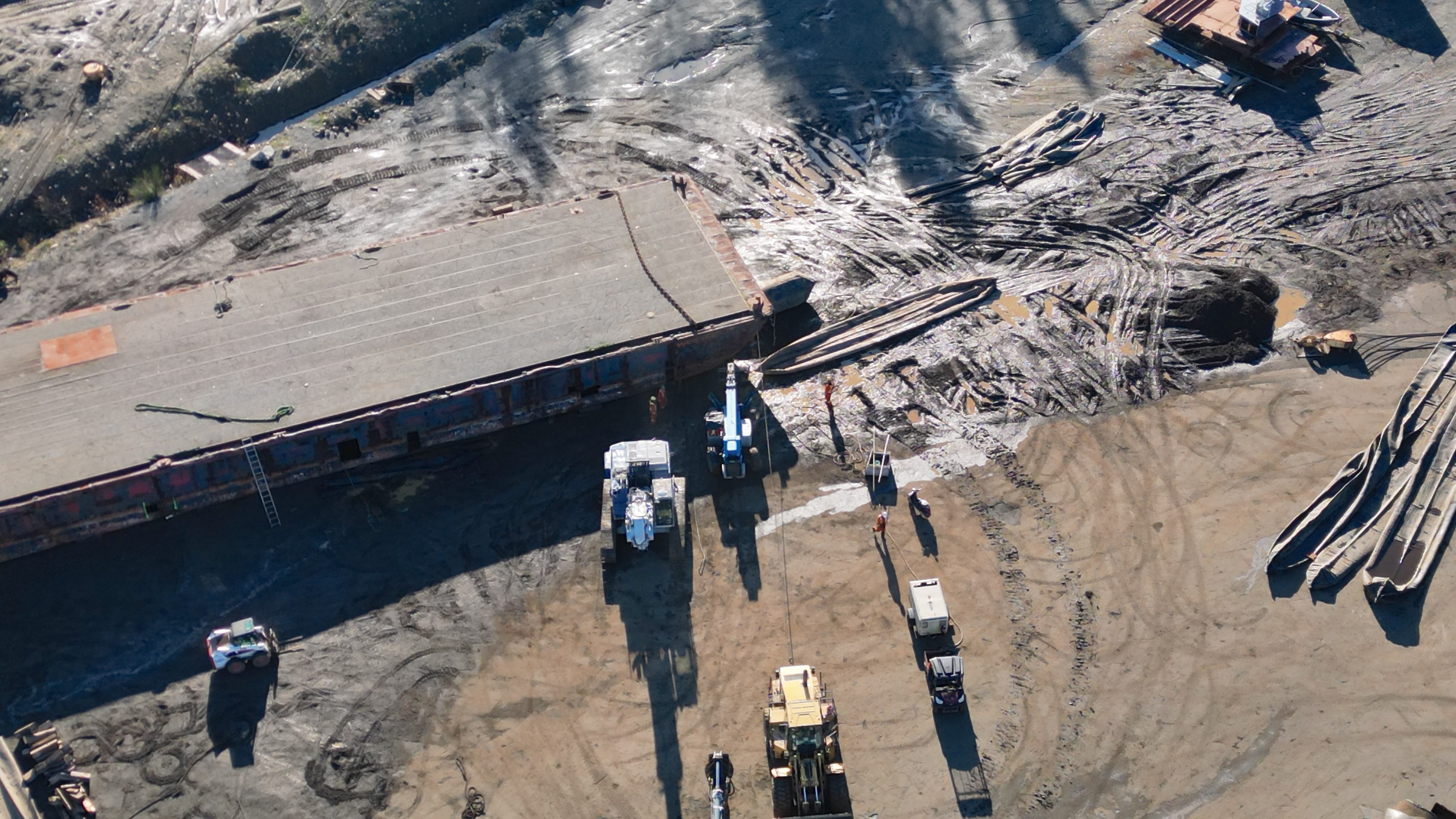 Looks like they put holes in the bottom of the barge to pull the inflatables lengthwise under the barge. Big difference between the diagrams they submitted about the method of bringing barges onto land. Six weeks and still trying to move the barge.