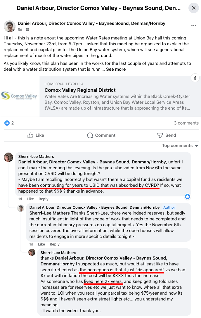 It’s like people are waking up after taking zero interest in what transpired with the Union Bay Improvement District since at least 2005. We’re going to be facing huge infrastructure costs because there was virtually no follow through on any ‘renewal and replacement’ plans/intentions by the boards (exception is the Molstad board). We are screwed if we suffer a major water break. They have been patching the pipes for years and the leaks are more frequent. Hopefully, we won’t suffer a major break before the actions taken by the CVRD puts us in a better position with a clear plan for the future.