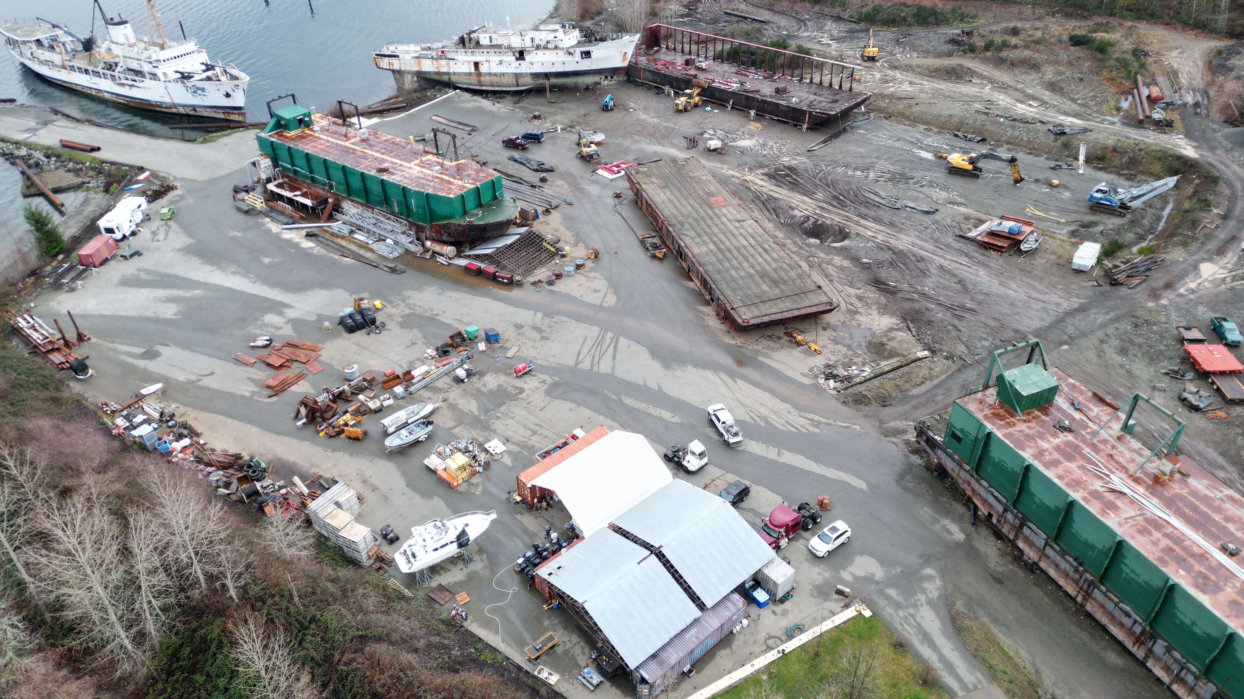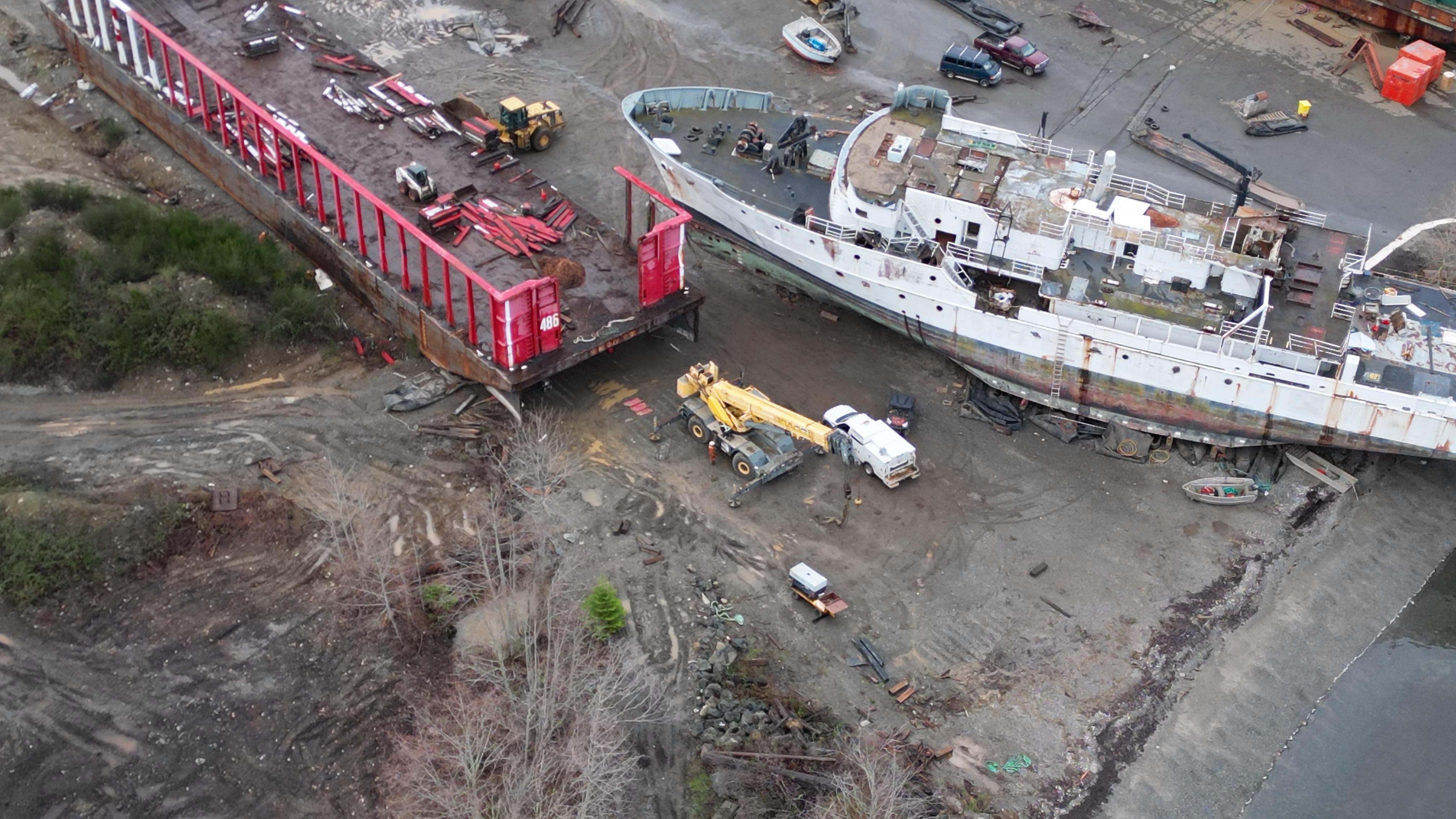 2 guys laying on the ground torching the barge. The yellow piece of equipment they put the contents of blue barrels yesterday appears to be giving them problems.