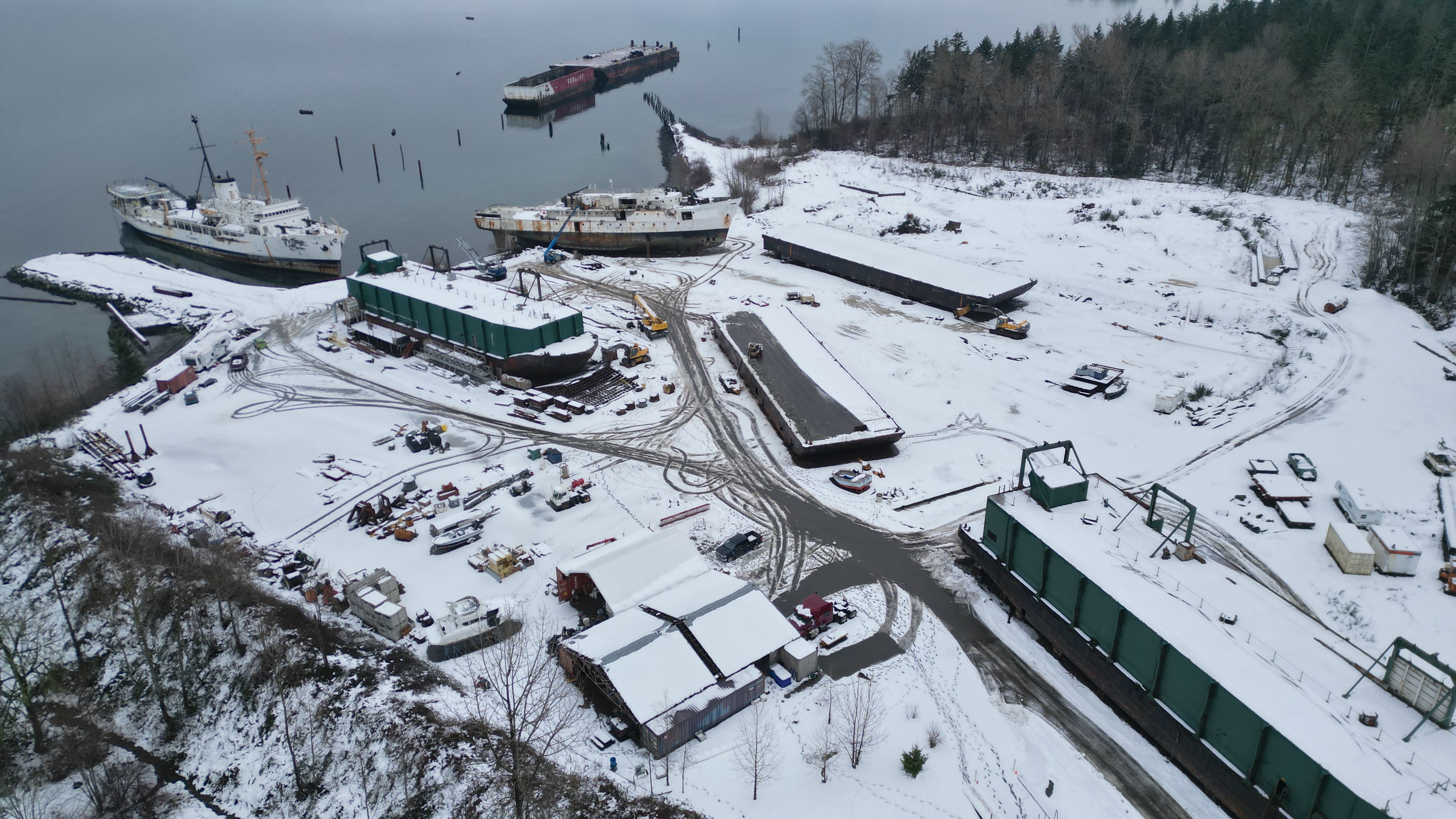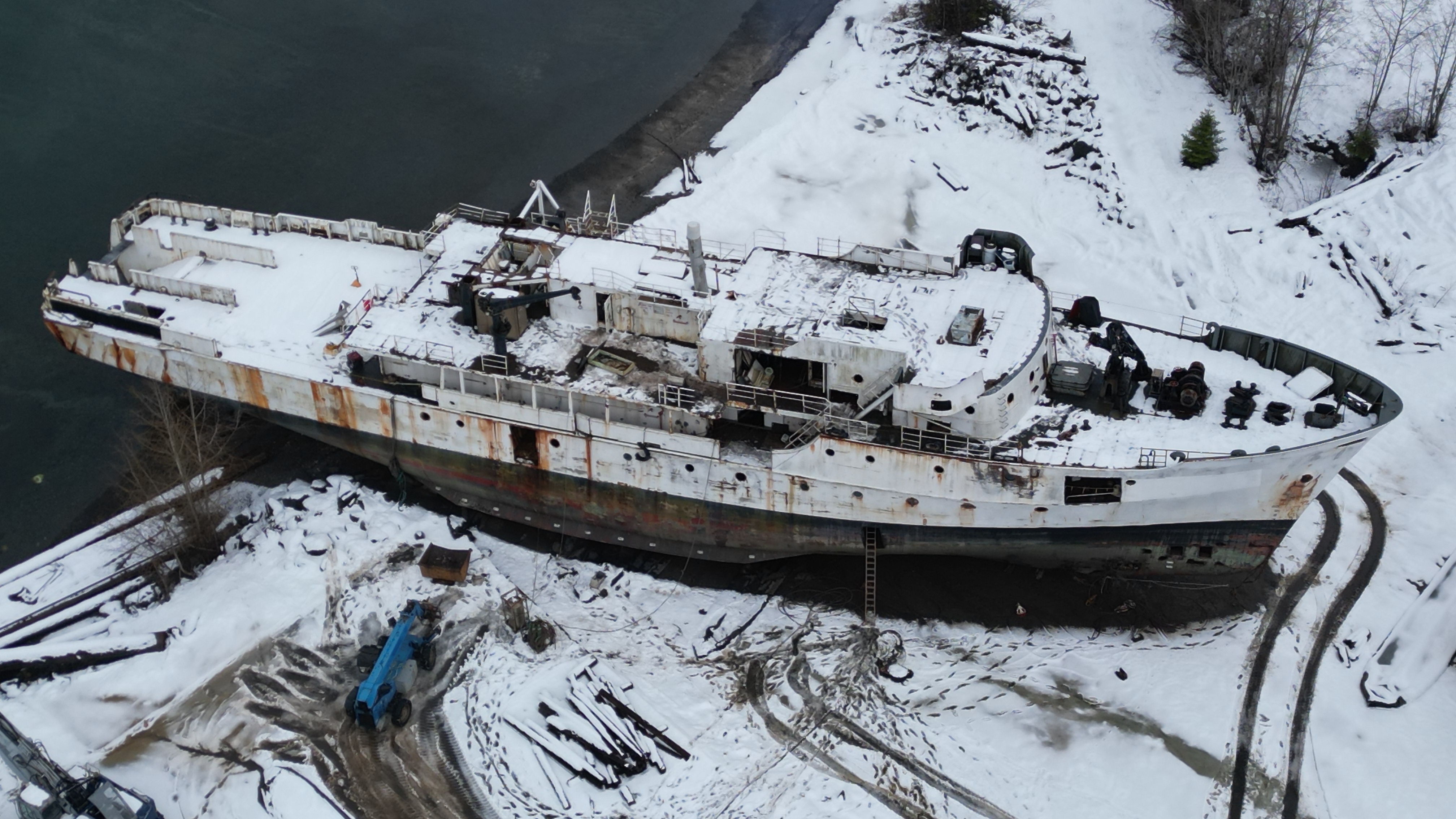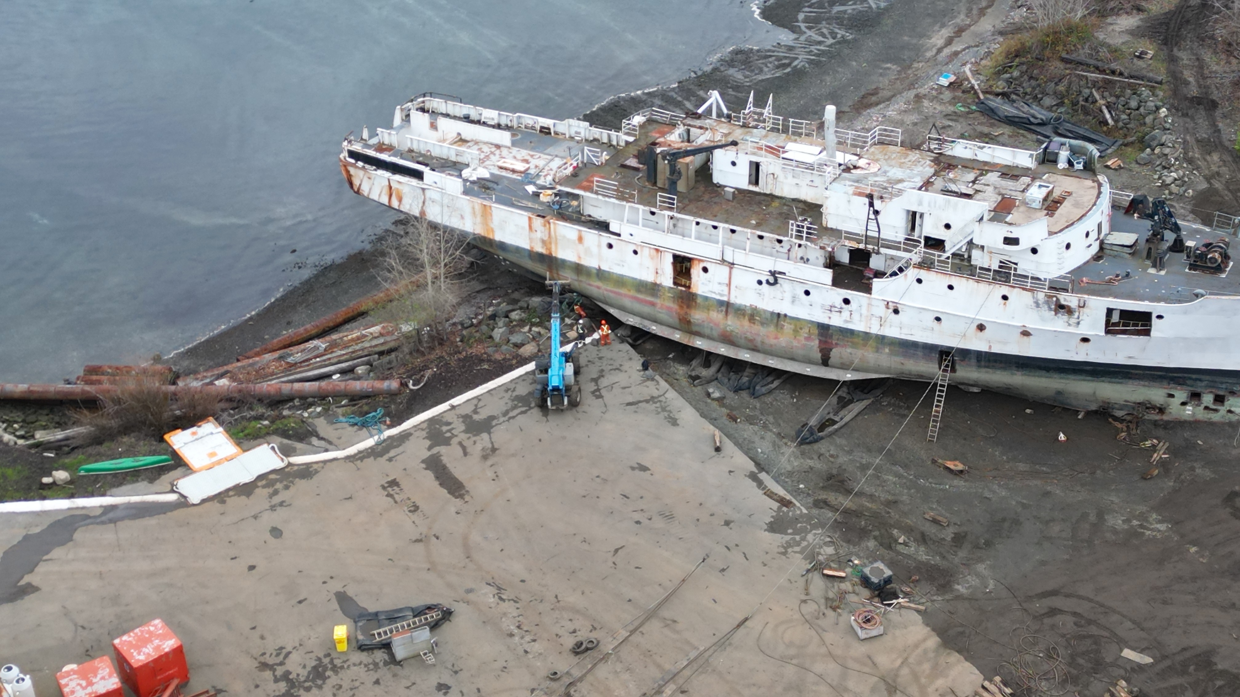 DWR busy dismantling the beached Miller Freeman the last few days right where it sits barely out of the water.