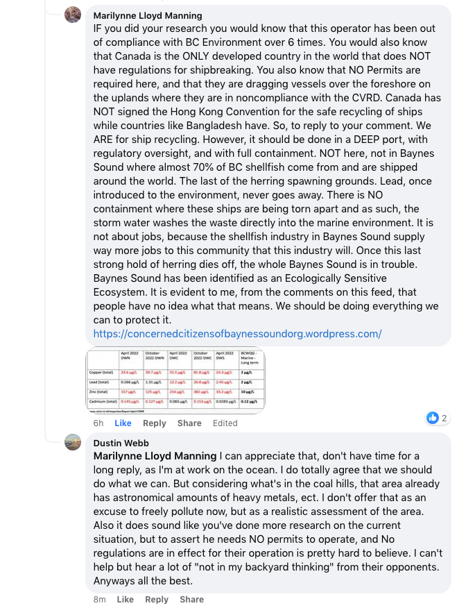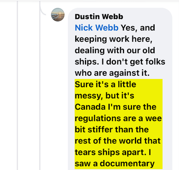 Dustin Webb finds it “pretty hard to believe” there are no regulations for ship breaking in Canada. After all the facts given to Dustin, he admits the person he’s responding to has done more research than him, and yet states this: