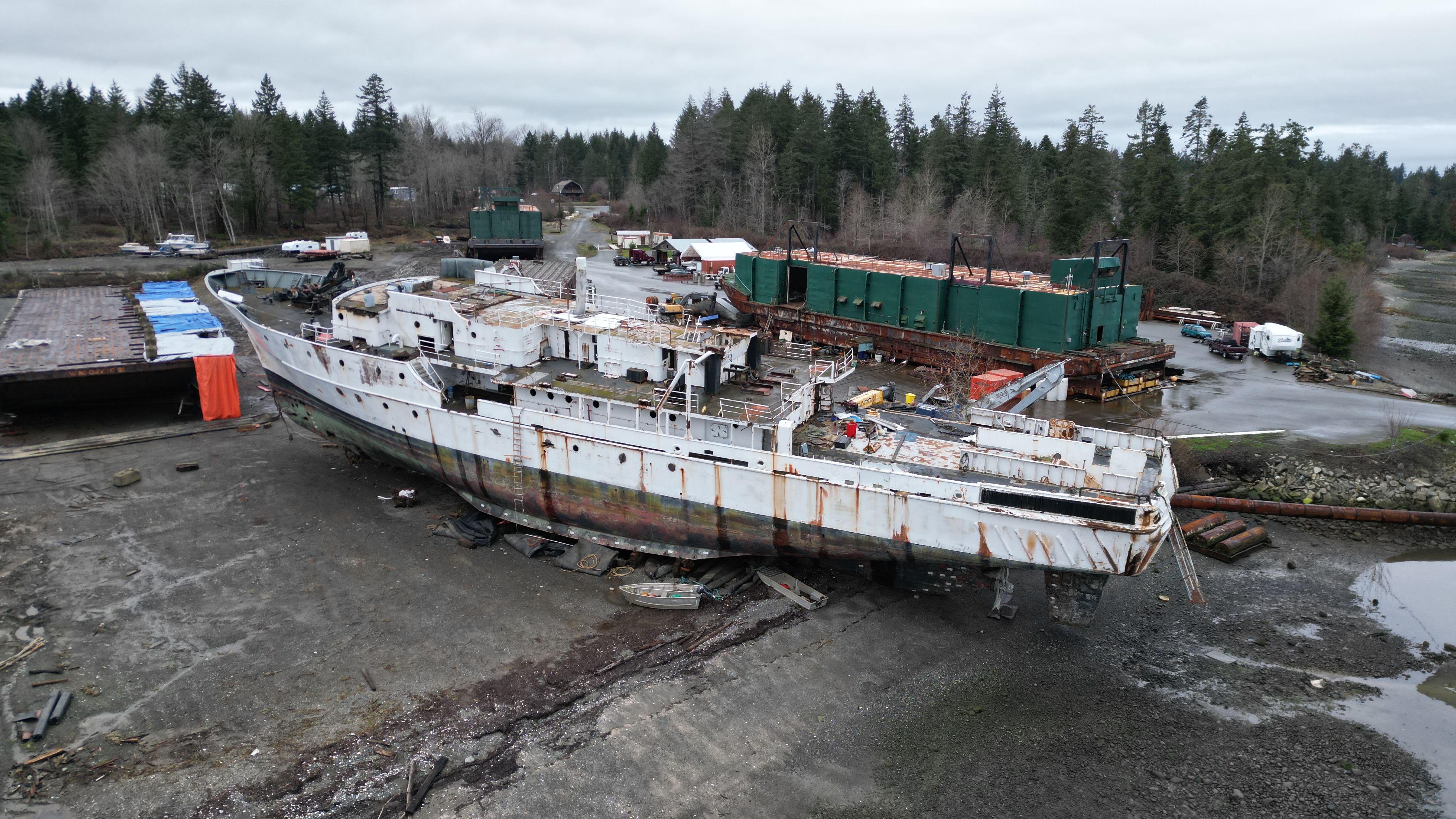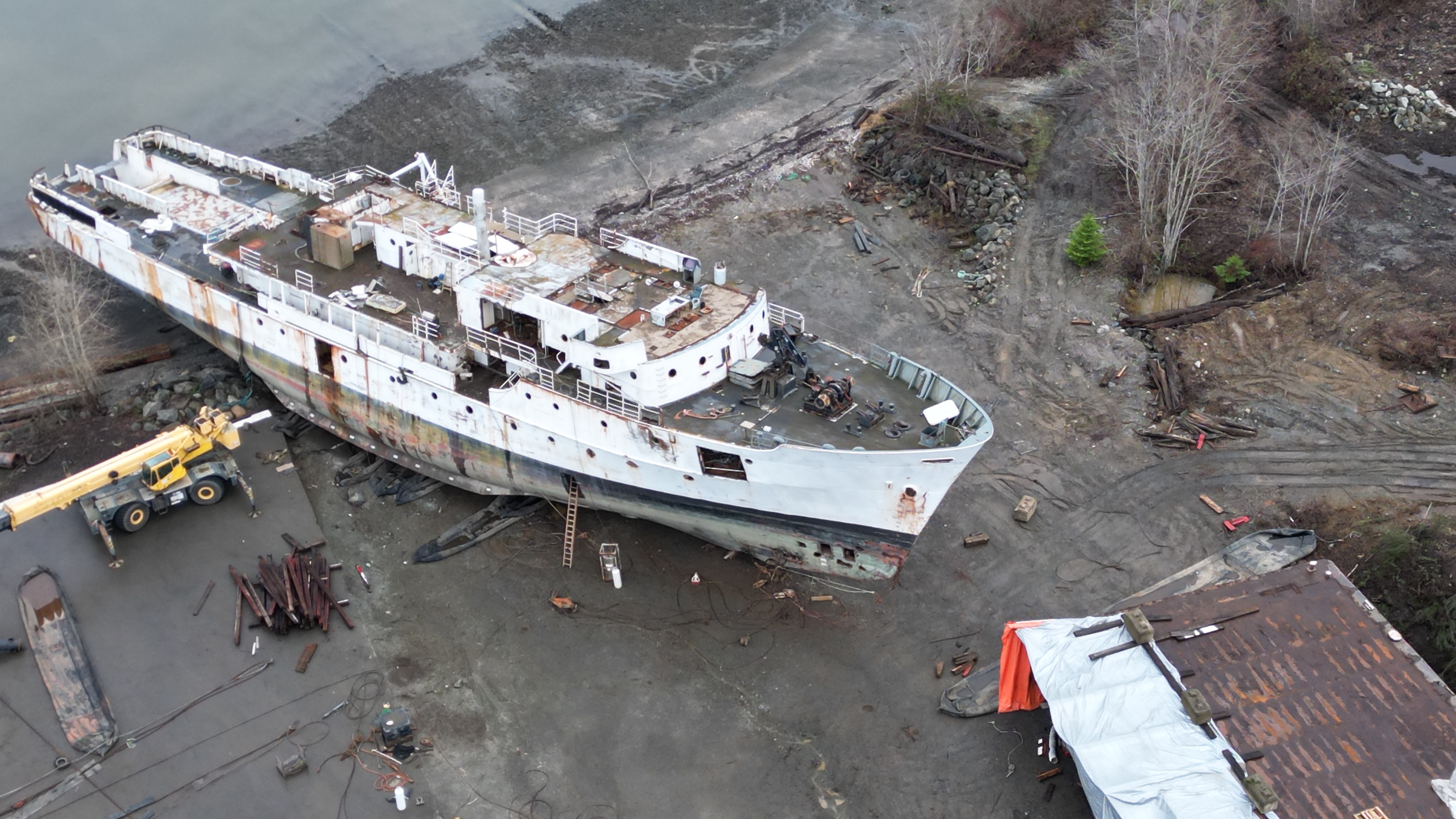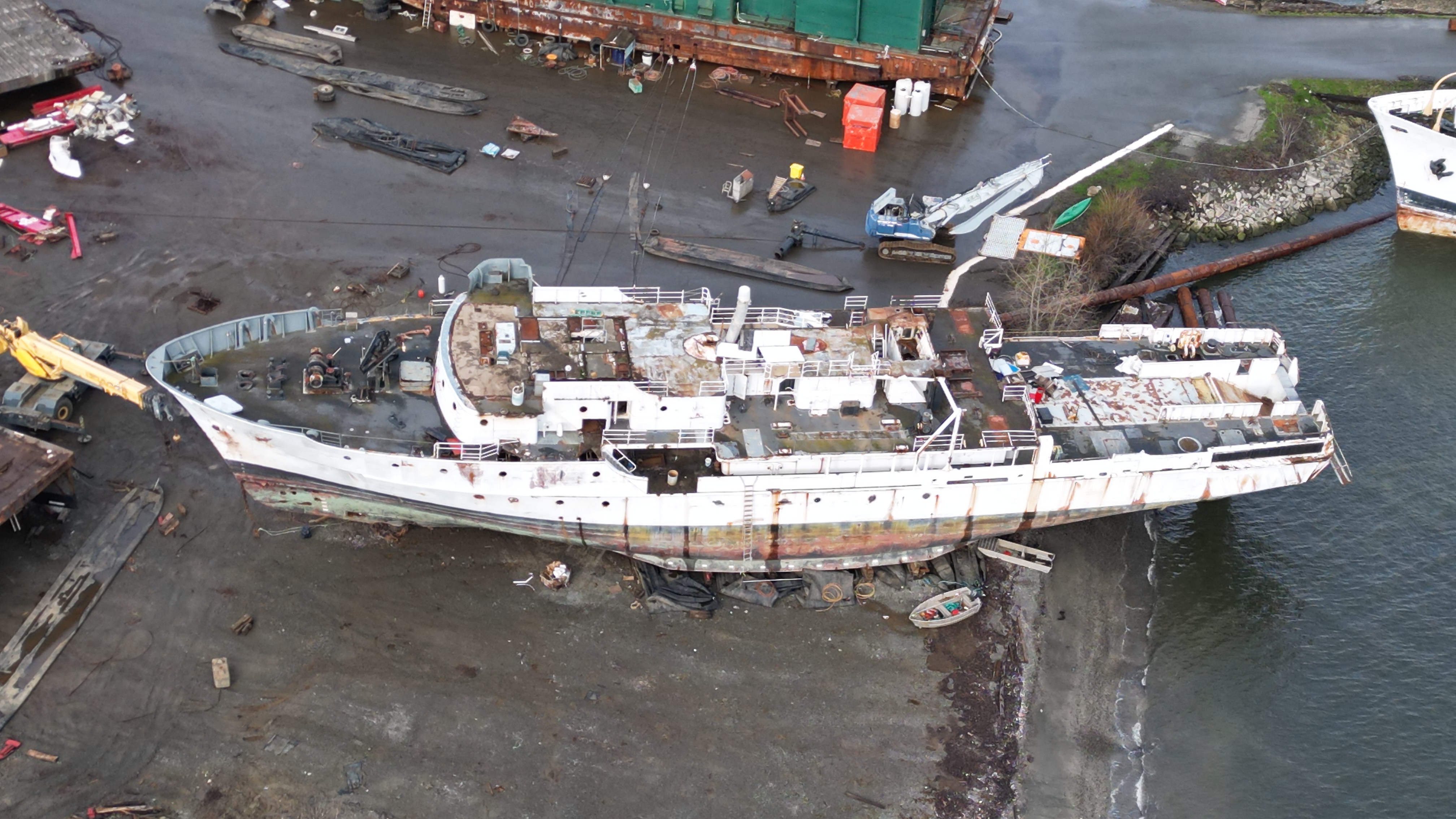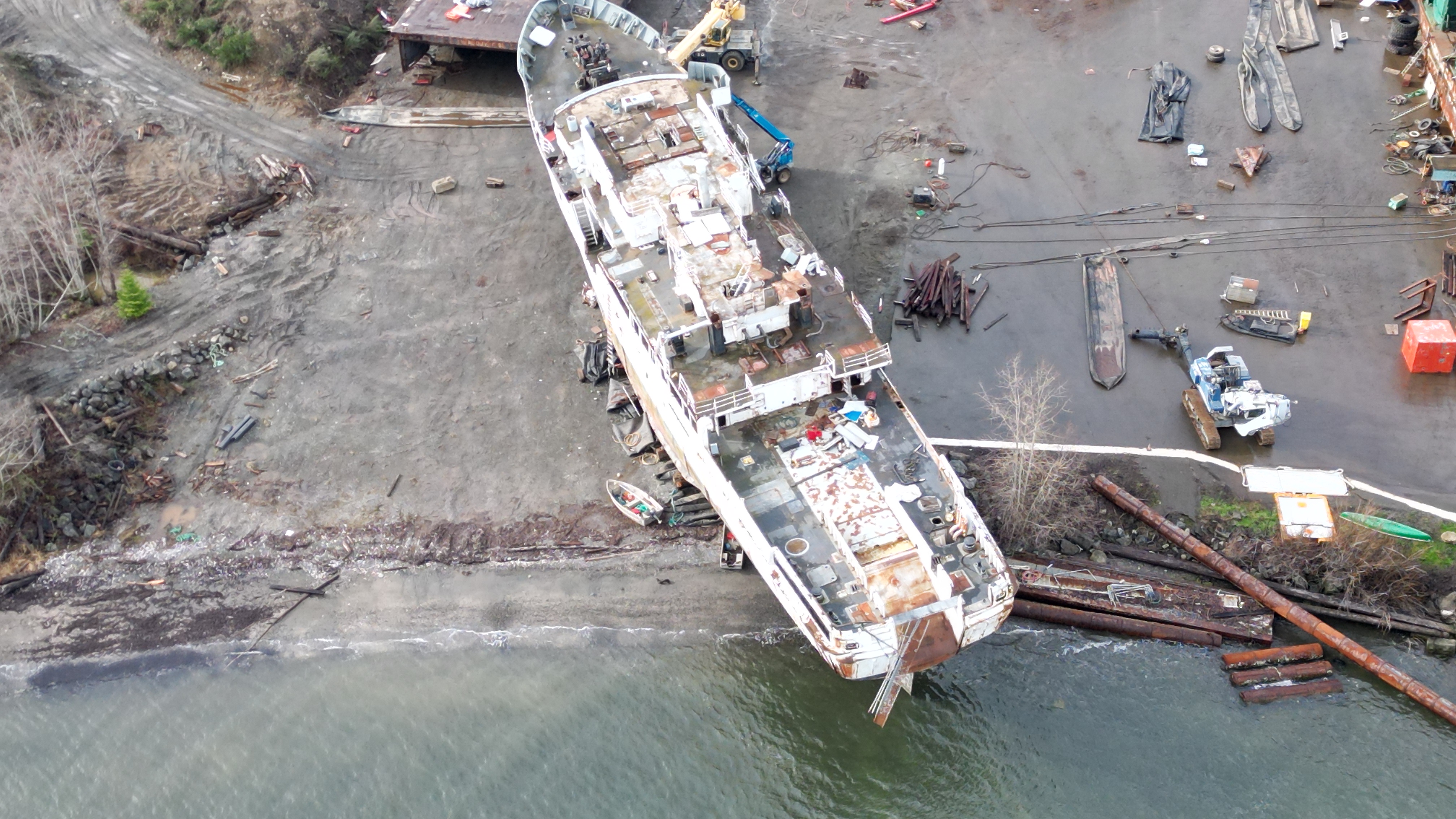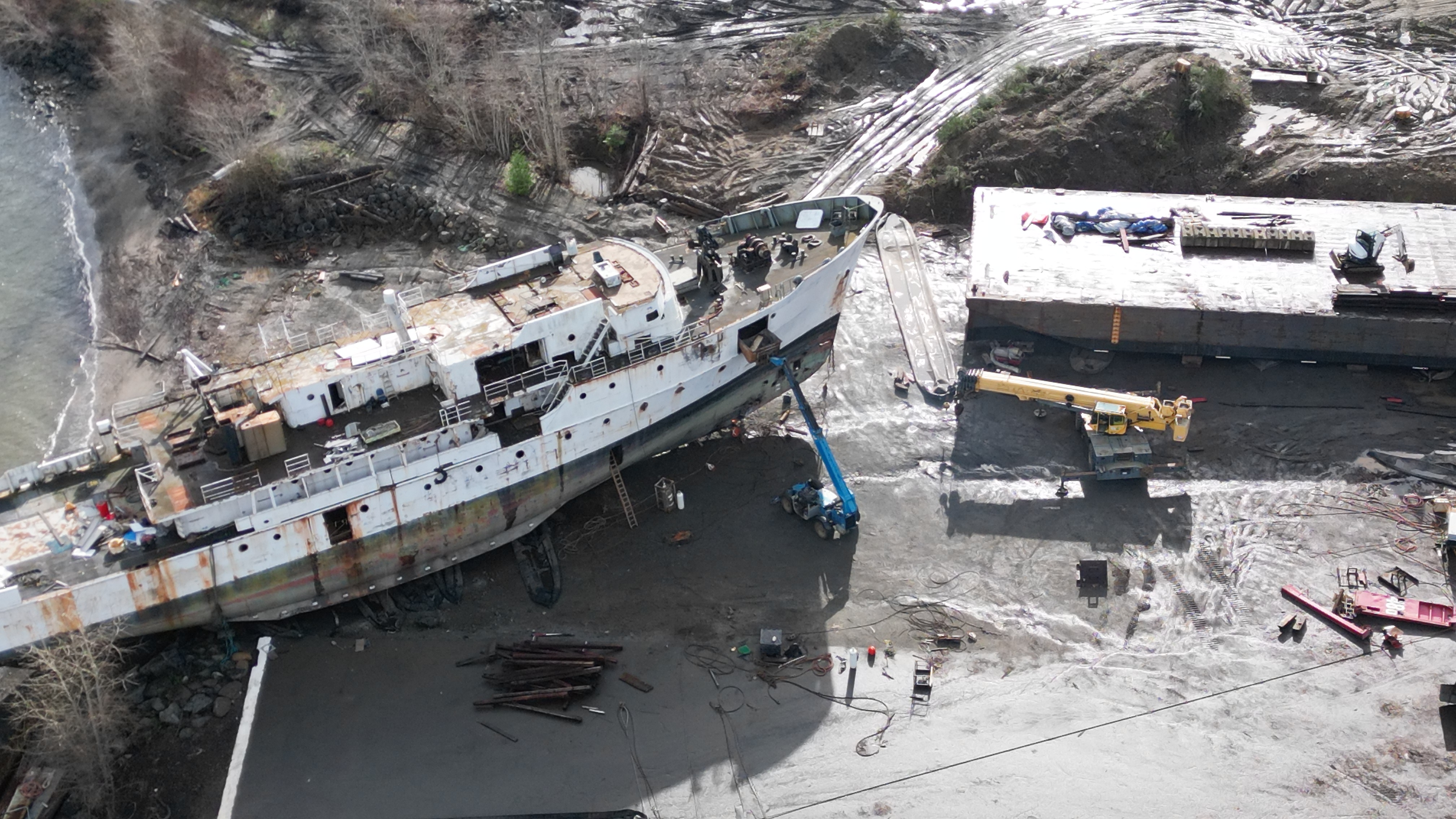 Coming up to the 18 month anniversary of DWR trying and failing to bring the Miller Freeman upland. Now they dismantle on the beach.