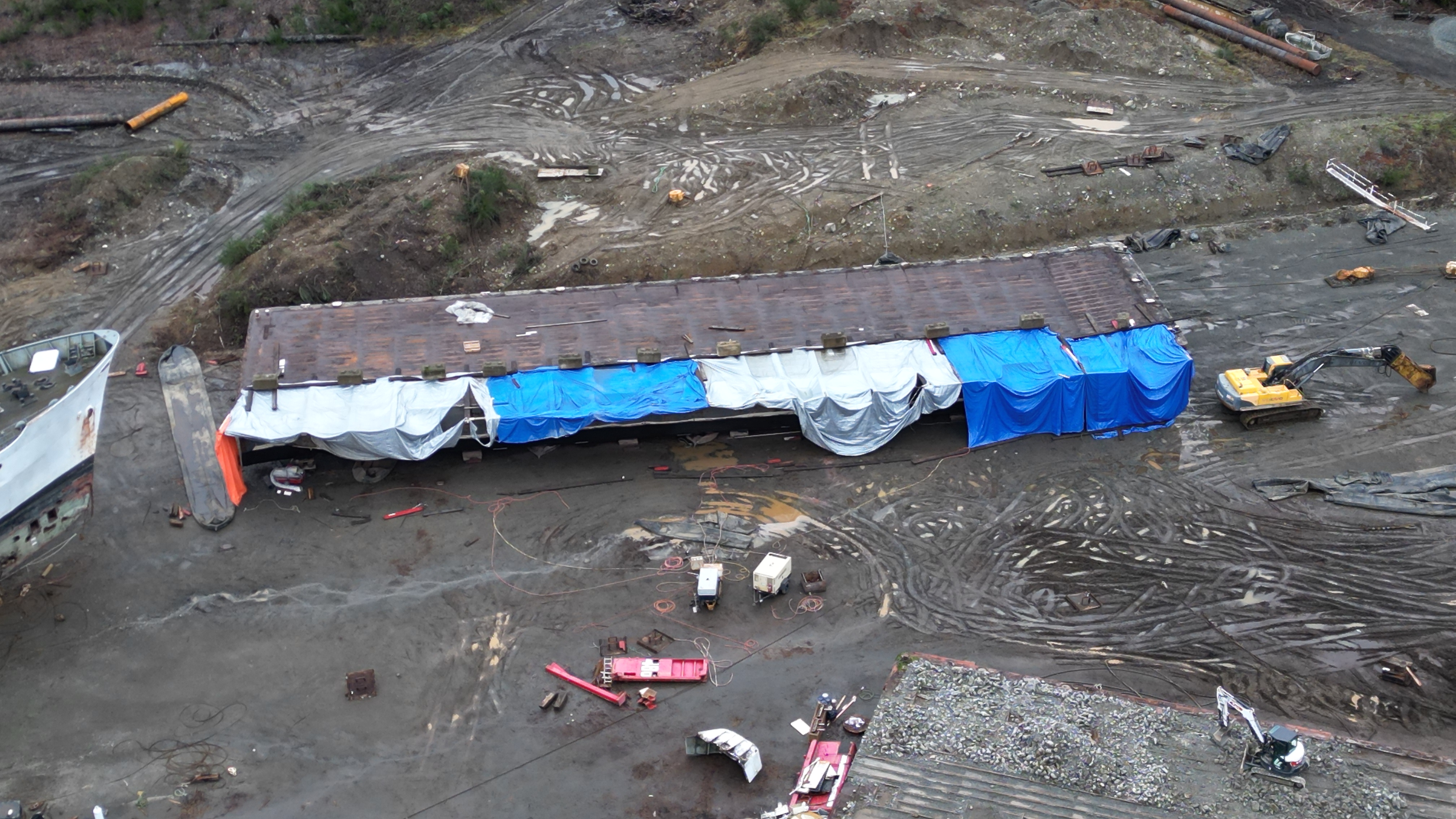 They removed all the tarps they had on the barge next to the Miller Freeman.