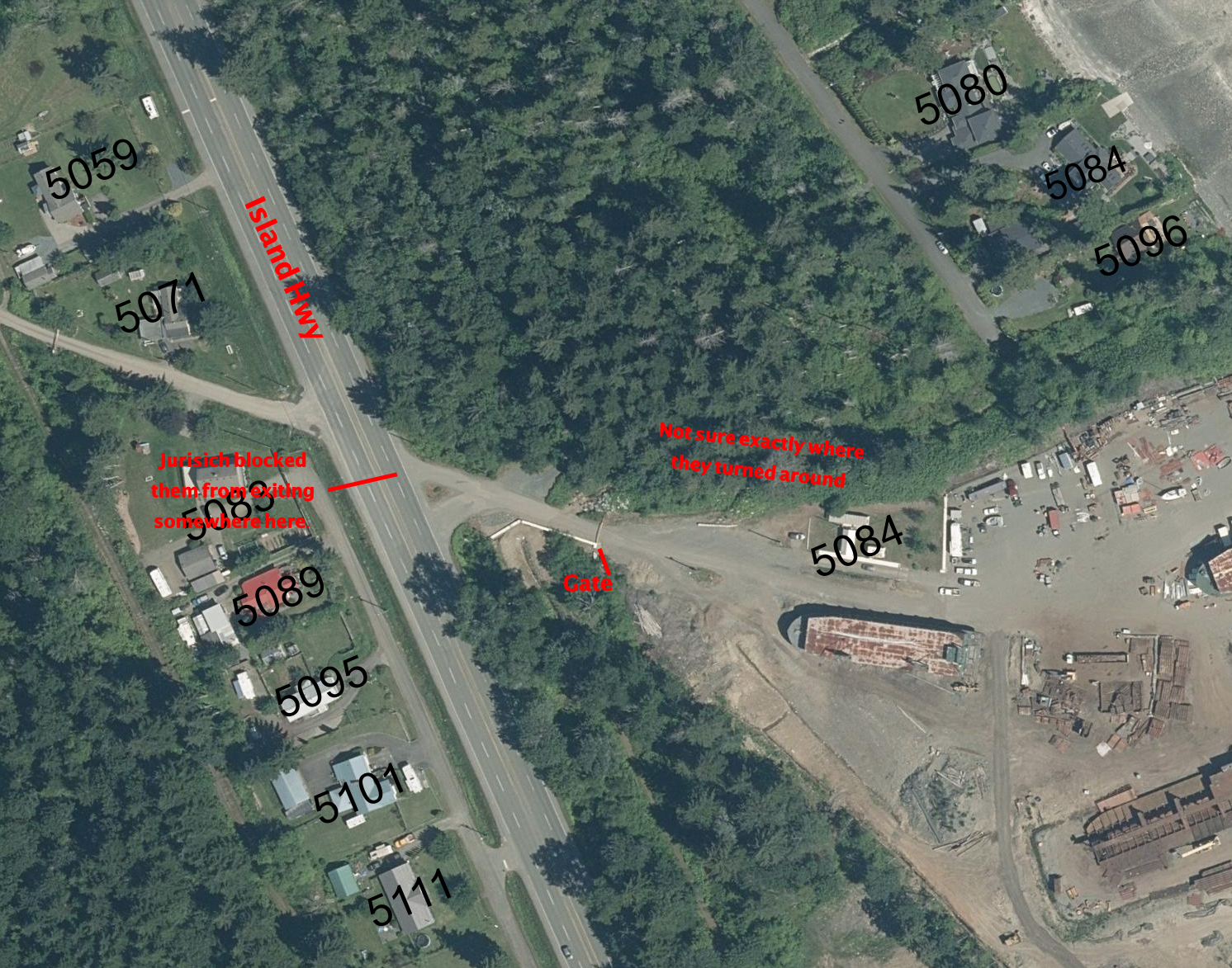 A couple were driving south on the Island Hwy and turned left (towards the ocean) at the entrance to Deep Water Recovery to see what it looked like. There were trucks going in and out, with a truck behind them so they kept going and immediately turned around when they could. They proceeded back to the highway at which point Jurisich (who was entering from the highway) stopped his car at an angle across 2 lanes, preventing the couple from exiting, jumped out and ran towards the couple in their vehicle. The couple, scared, quickly drove away south on the Island Hwy. Jurisich jumped back in his vehicle and followed them on the highway all the way to Buckley Bay where they pulled into the gas station. Jurisich had called the police, who attended and spoke to the couple. Jurisich told them they should have talked to him when he ran to their car. The police said they would be contacting the couple again.