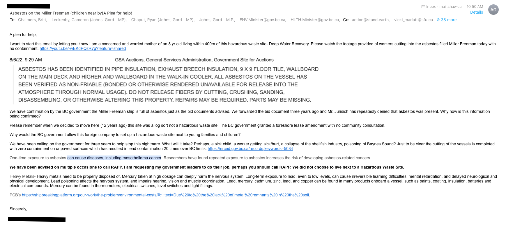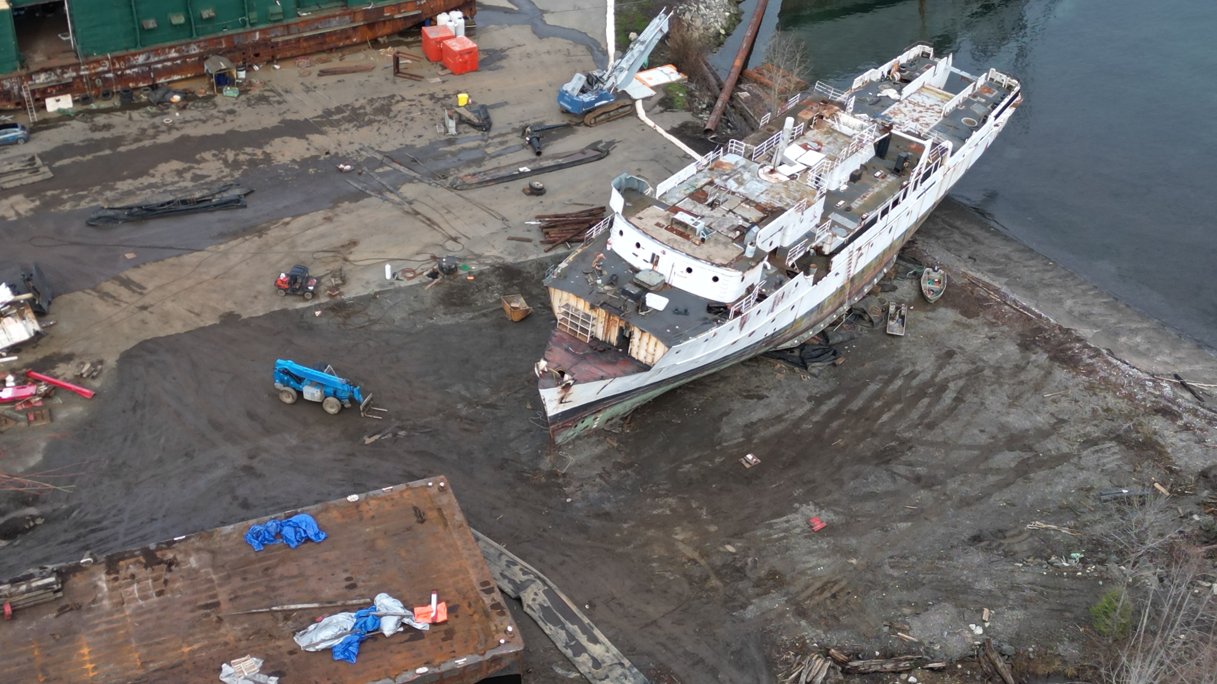Authorities charged with protecting and enforcing existing rules and regulations continue to fail the Canadian citizens in favour of this foreign owned company to ship break on the foreshore. Supposedly gave permission for a hole to be cut, and of course to DWR that means the green light to do what they want.