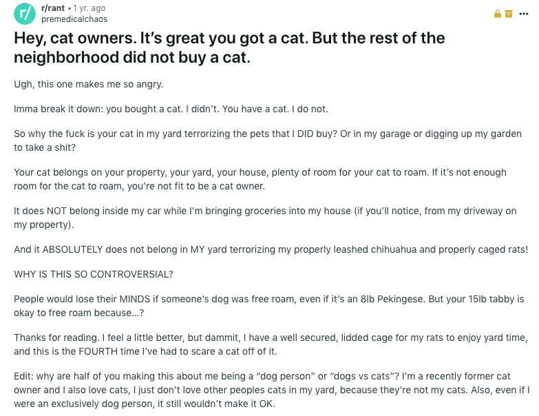 What member of your family do you allow to disappear, never knowing what they are getting into or what dangers there are? If you own a cat and you allow it to roam, you don’t give a shit about that animal. Plus, you don’t give a shit about anyone else since you think it’s perfectly fine to let your pet enter the property of others, shit in their gardens, kill the birds at feeders, use your cedar siding as scratching posts, spray their bloody scent everywhere, etc.