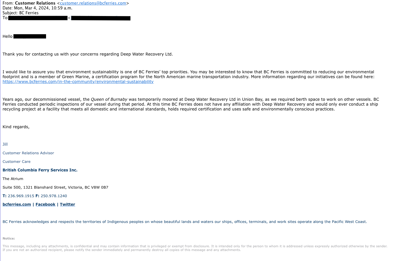 … BC Ferries does not have any affilitation with Deep Water Recovery and would only ever conduct a ship recycling project at a faciltiy that meets all domestic and international standards, holds required certification and uses safe and environmentally conscious practices.