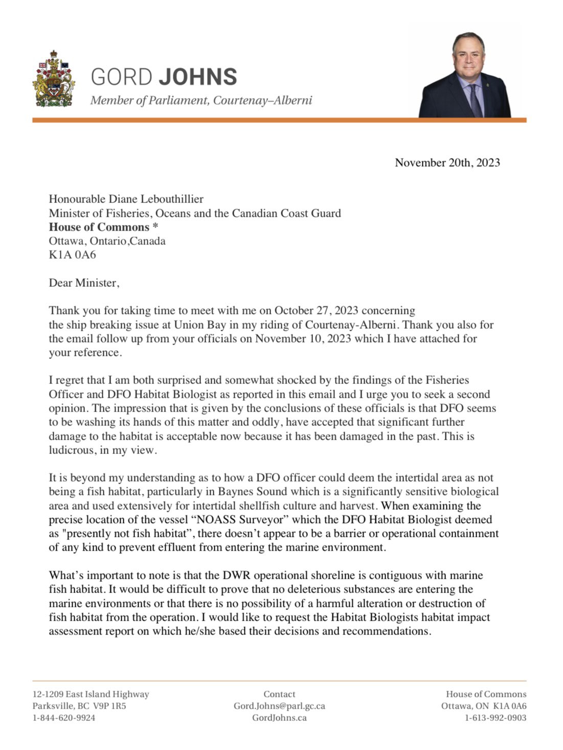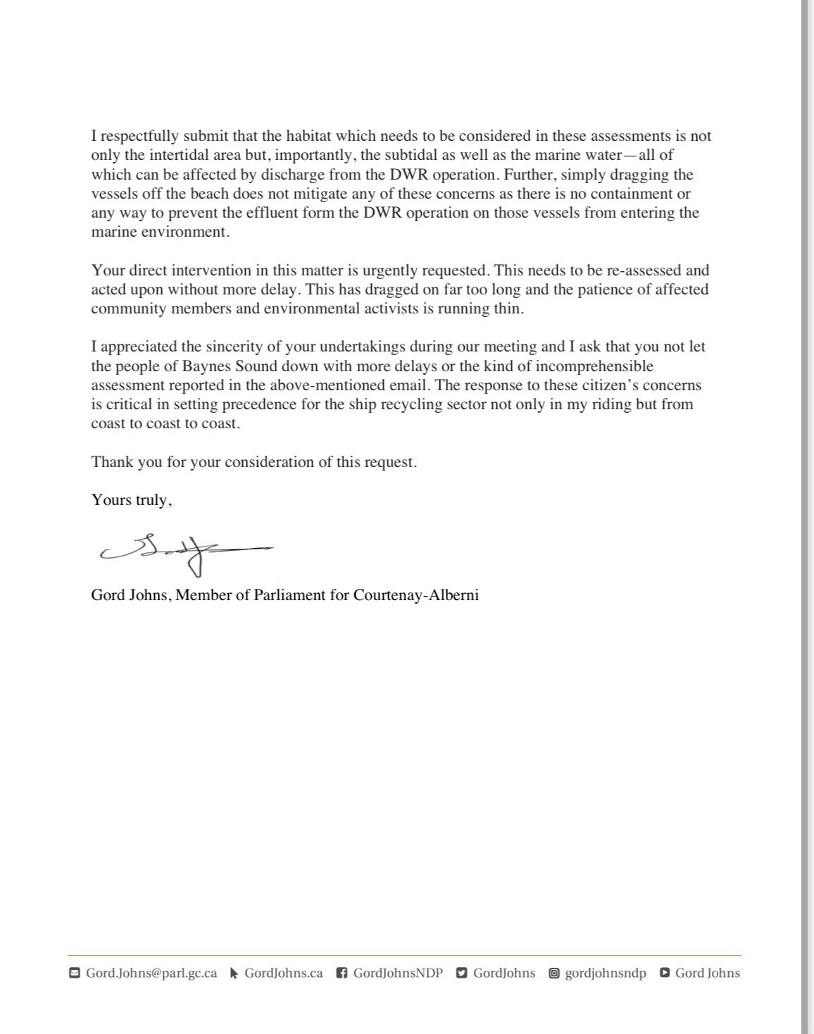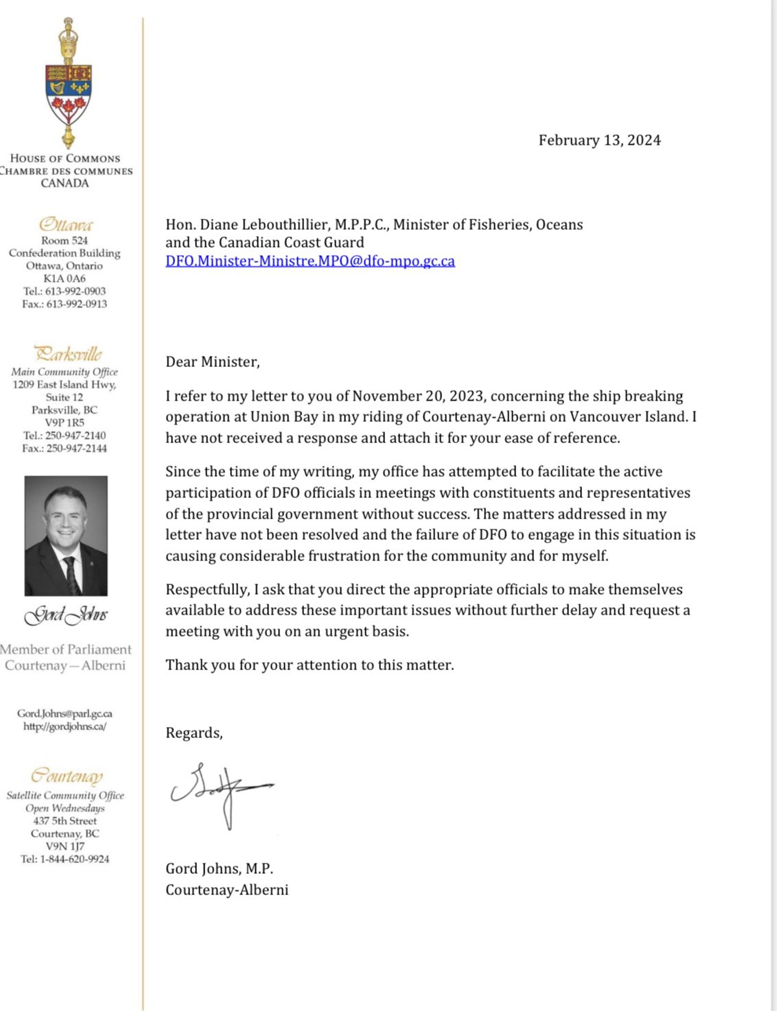 Thanks to MP Gord Johns who has been trying to get some movement on this problem – he’s not going to be ignored and neither are we.