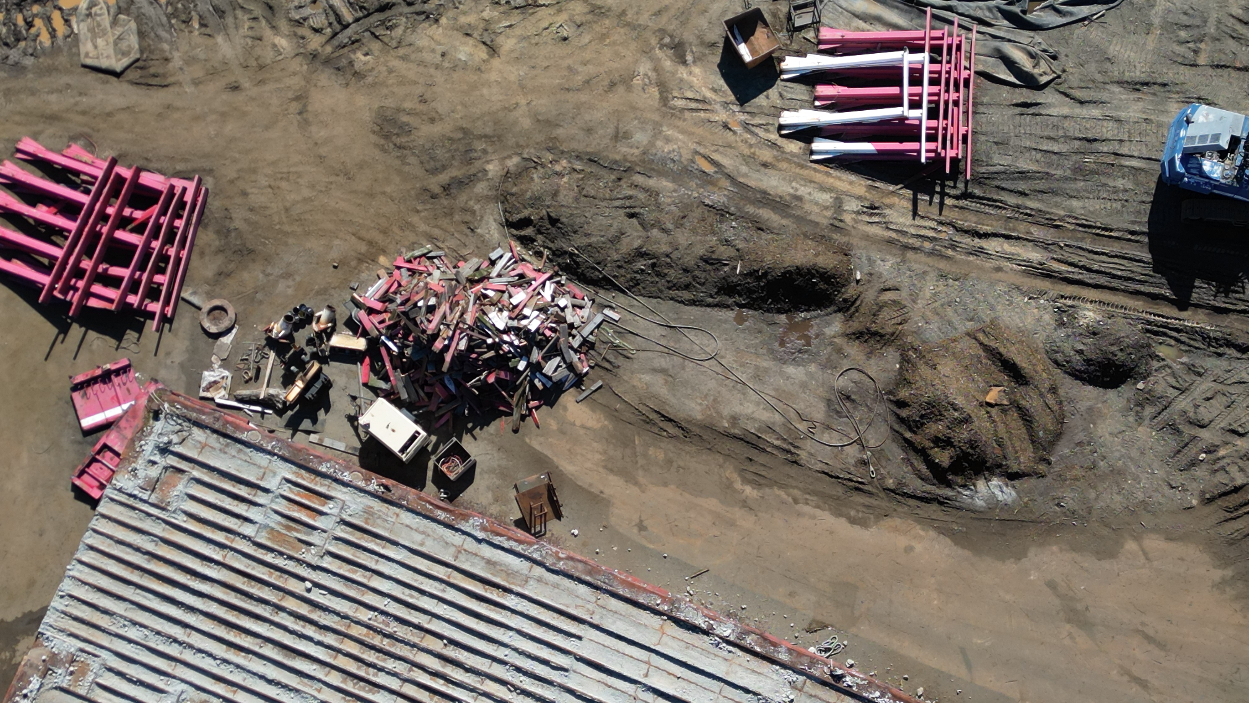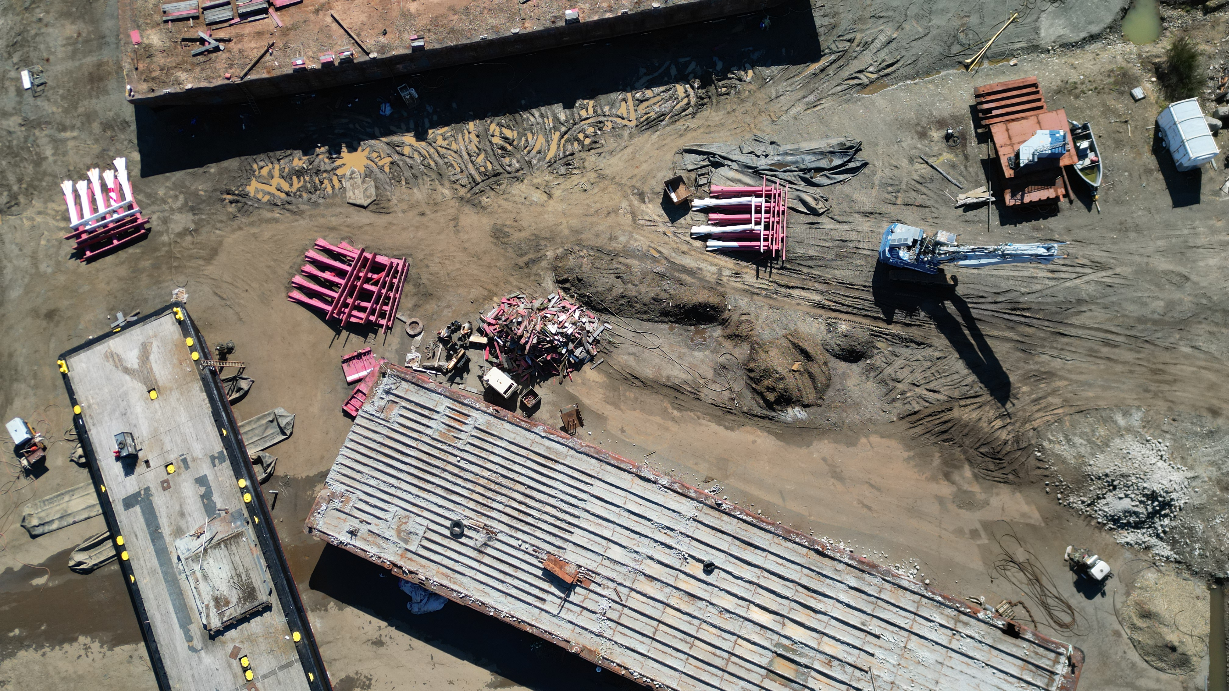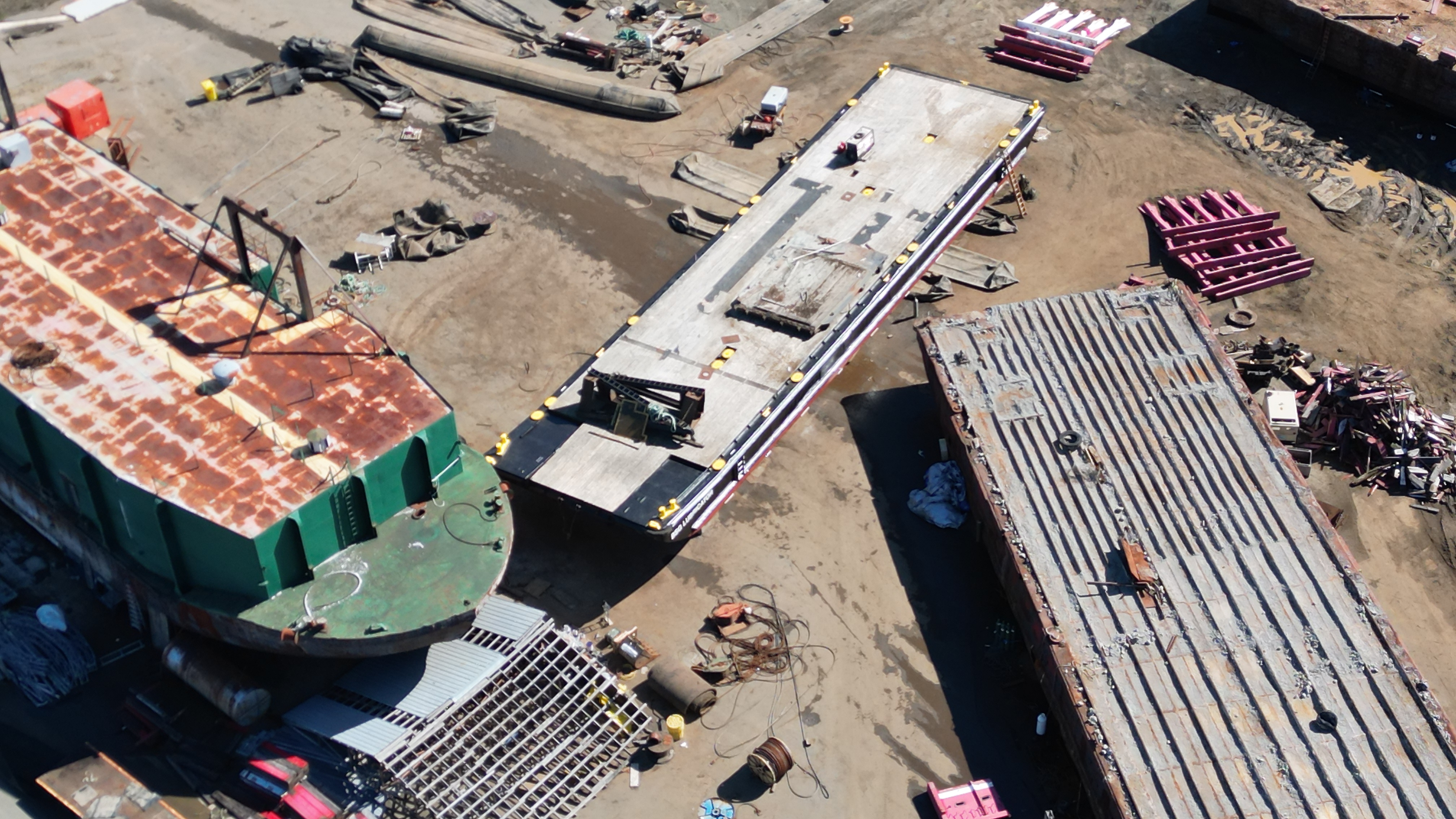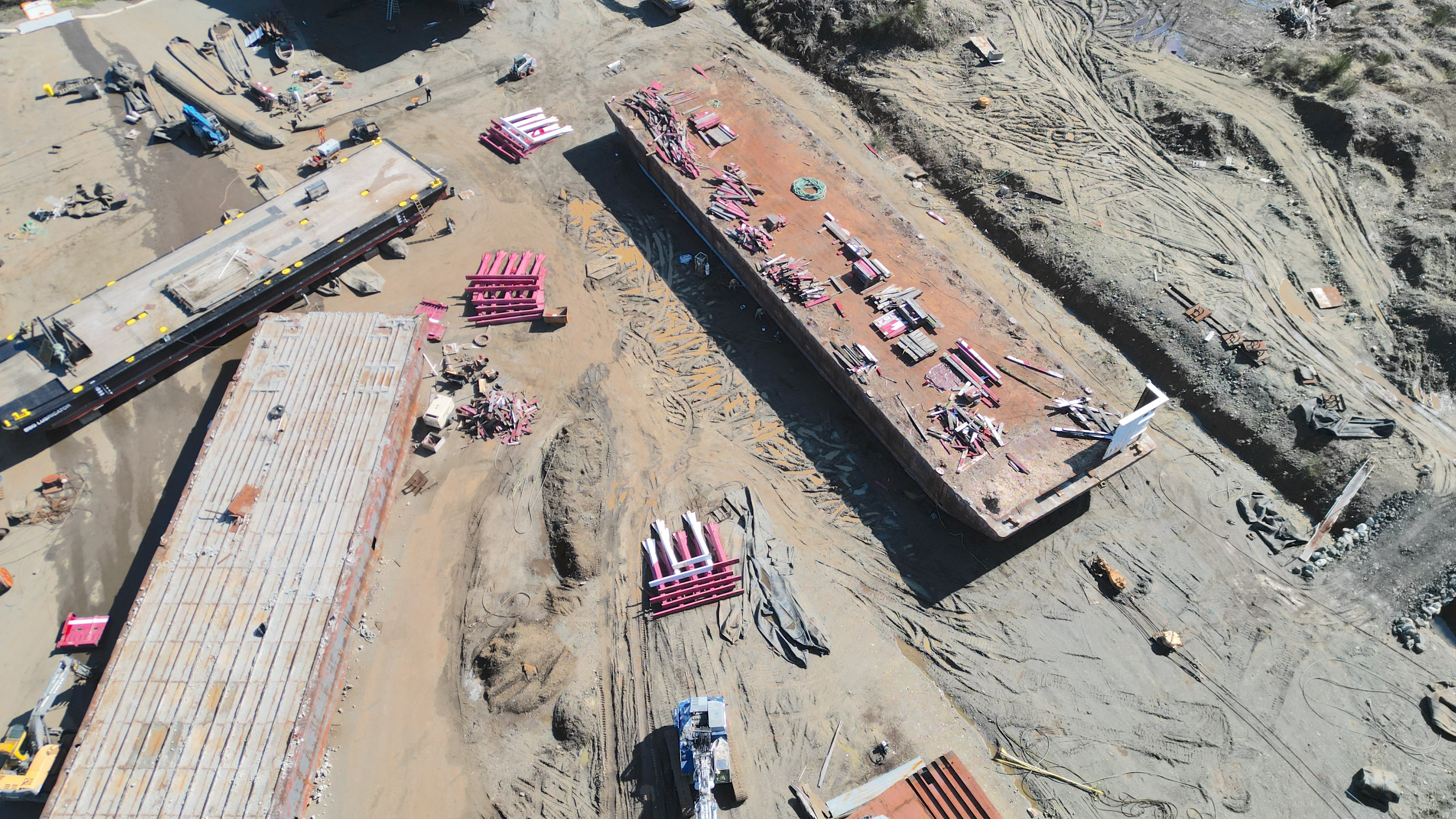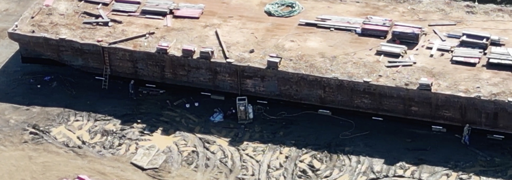 Lightened video to show what the 2 workers were doing in the shade. Colour has changed from grey yesterday to black today. Other barge has stripes now.