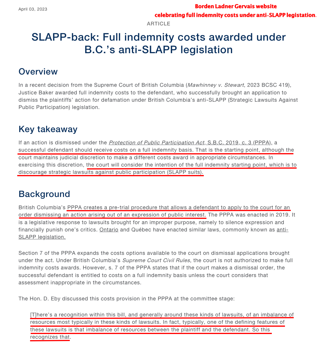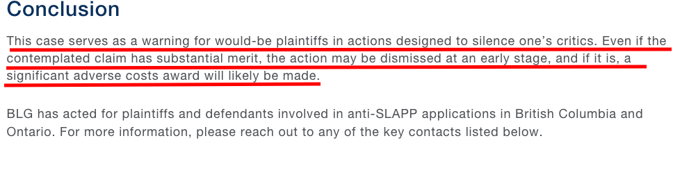 The Protection of Public Participation Act is very good, it needs to address this blatant disregard of the purpose of the Act. After submitting ‘over-the-top-rhetoric’ in pleadings, it’s disrespectful to the courts to allow a well established National law firm stoop to such depths without making an example of them in order to send a firm message that these antics won’t be tolerated.