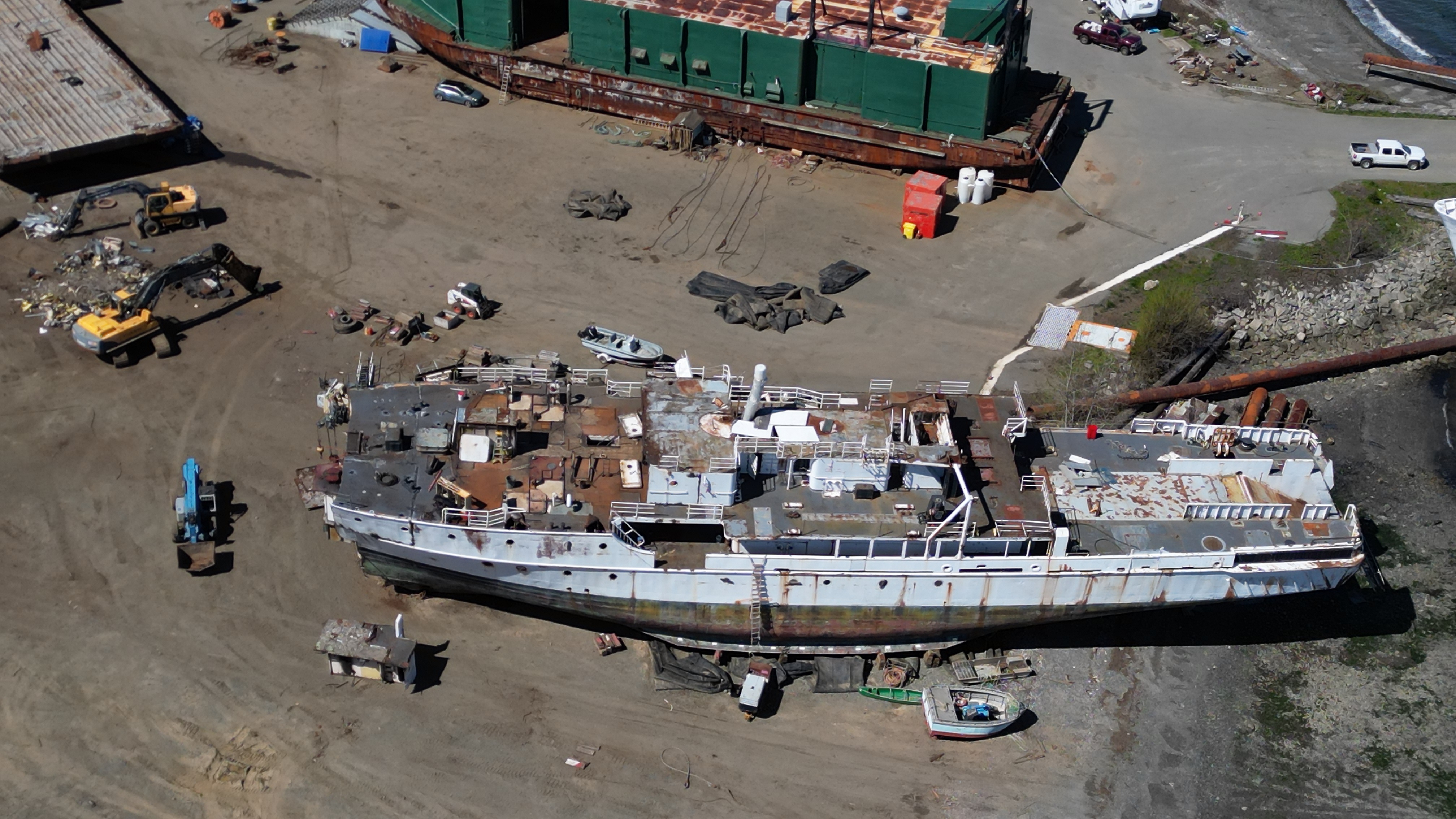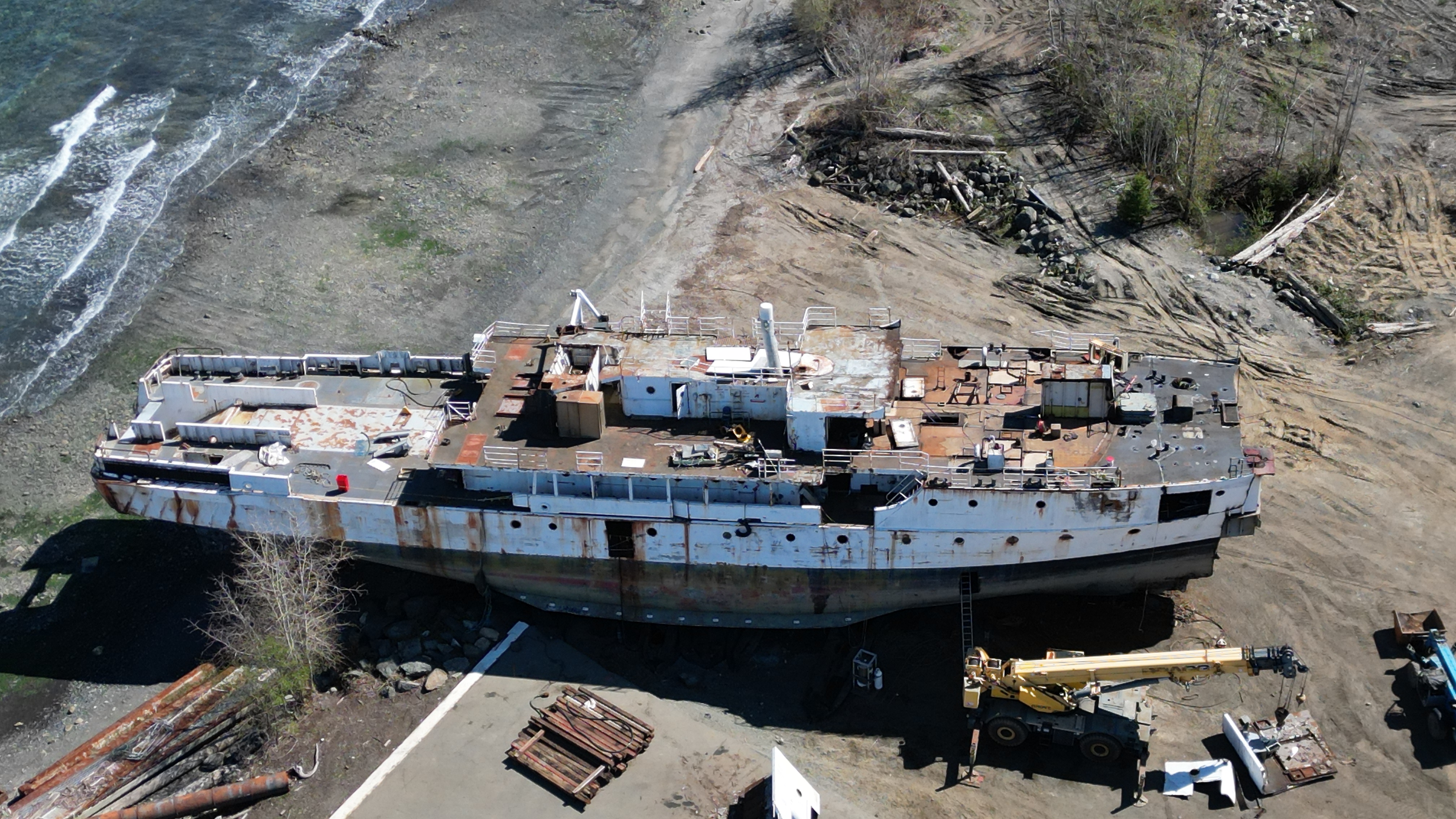 Short flight. Hoses running into Miller Freeman. Workers probably down in the asbestos packed hull.