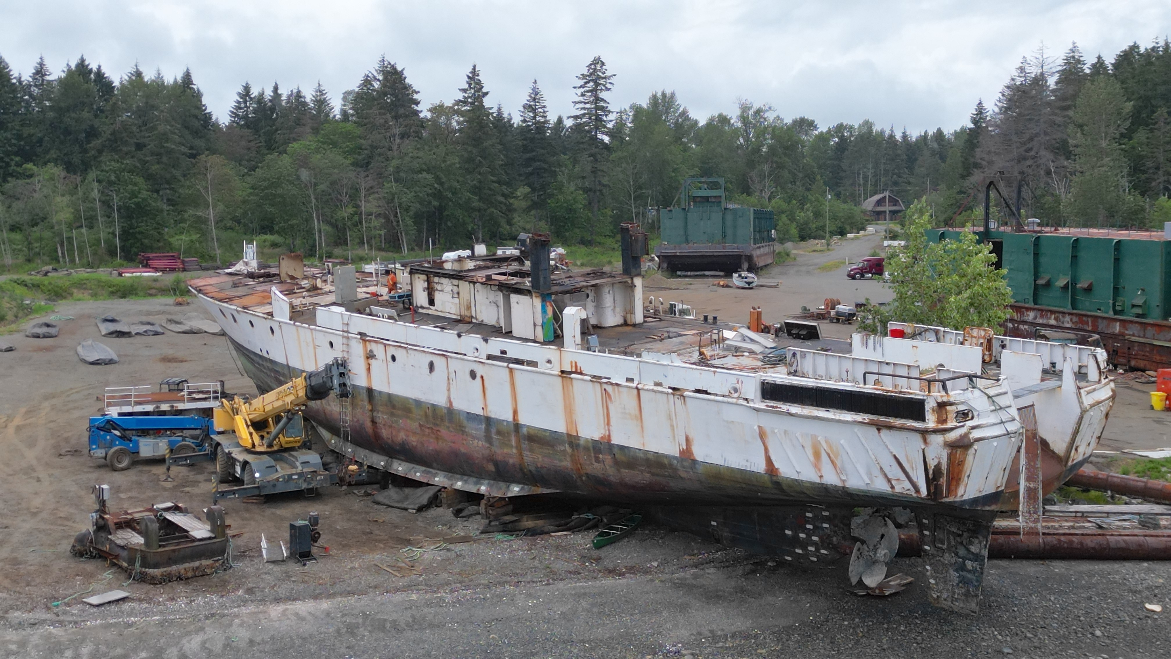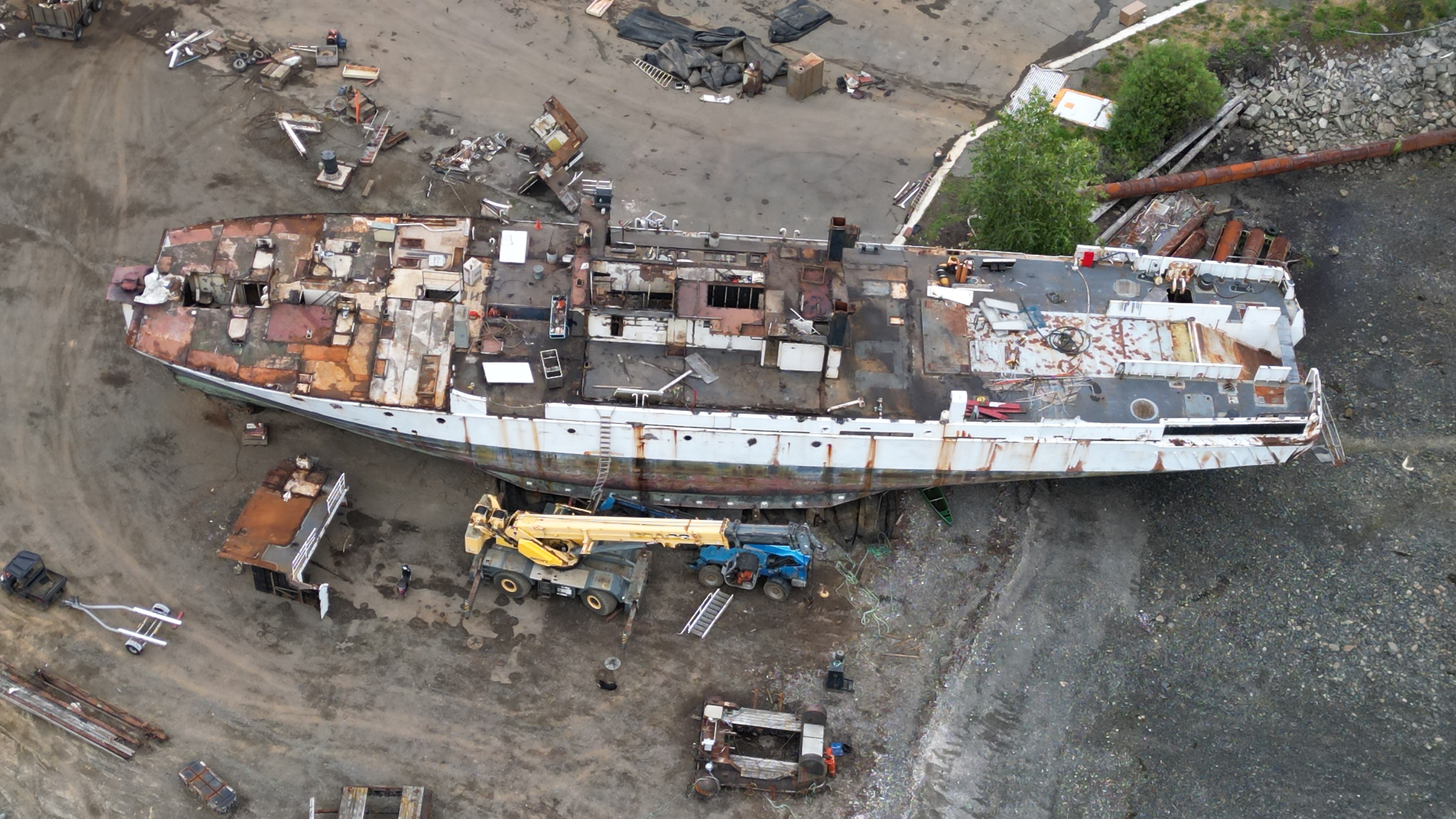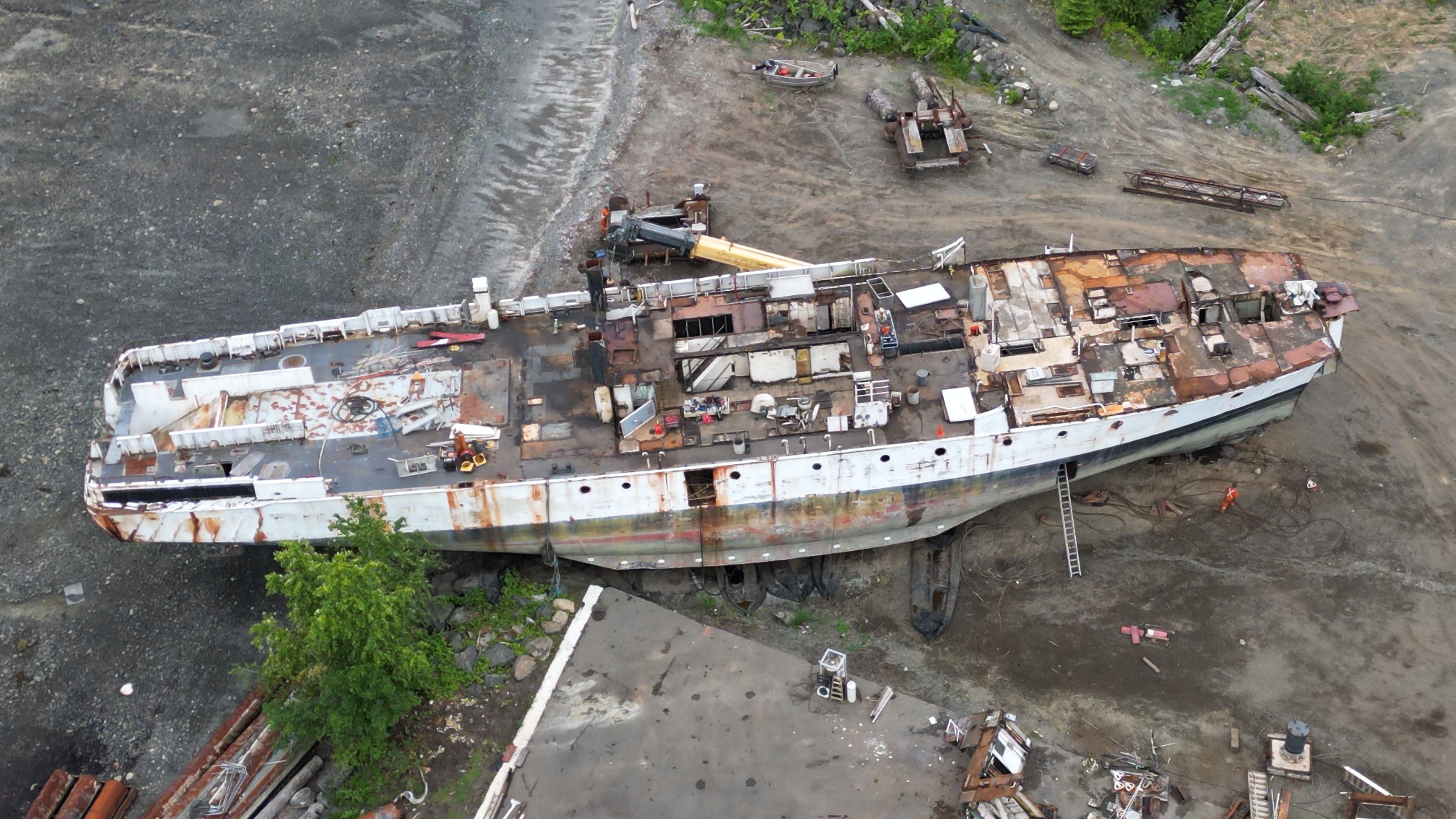 The Miller Freeman was 215 ft long before they removed a portion on the front. It’s a good scale to show I’m much further away than 100 ft (per drone rules) from any workers.