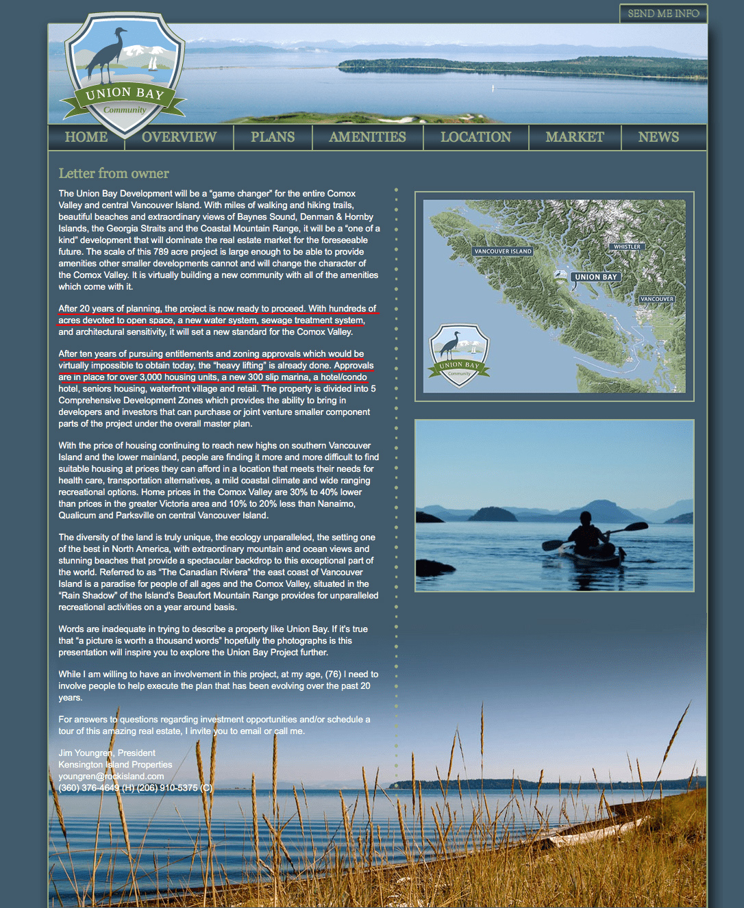 Cleared Argyle area and promised the landowners the mounds of debris from the clearing would not be burned and that they would be advised. KIP aka Union Bay Estates burned them with no notice or reason. Also reinvents KIP every few years – look at all the different name changes trying to hide the fact this is a sleazy developer who never produces. For a few years KIP actually named the development “The Union Bay Community”. Screenshot below.