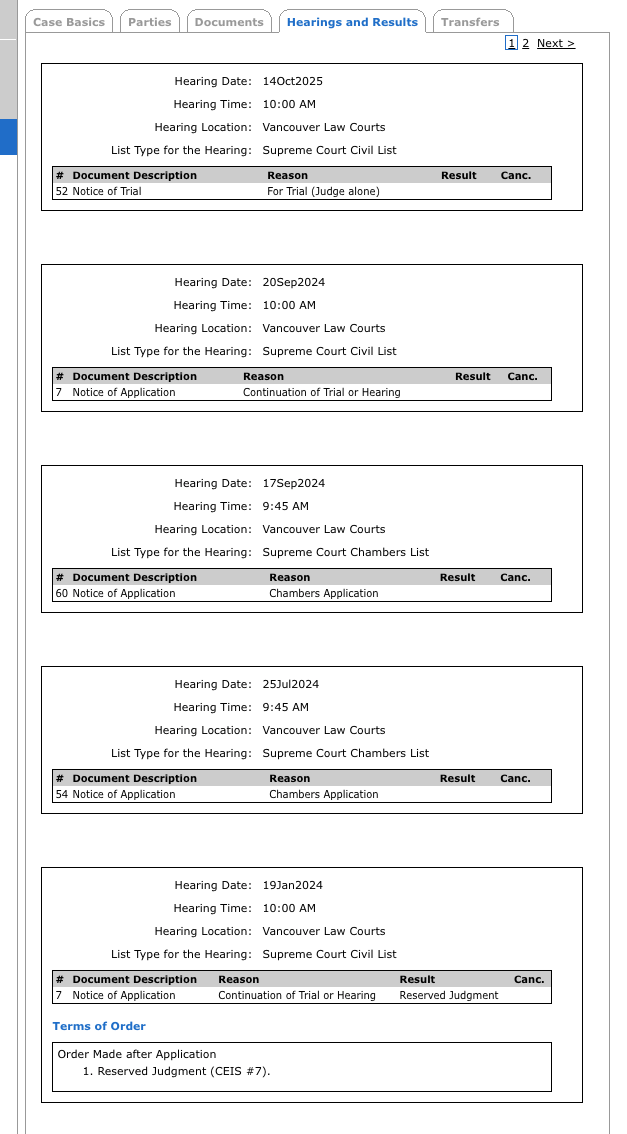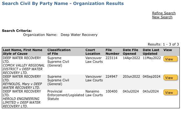 Check out the Supreme Court website to see the difference in activity between my lawsuit and the CVRD’s against DWR – nothing on theirs since May 2022. Compare that to the activity in my lawsuit. https://justice.gov.bc.ca/cso/esearch/civil/partySearch.do.