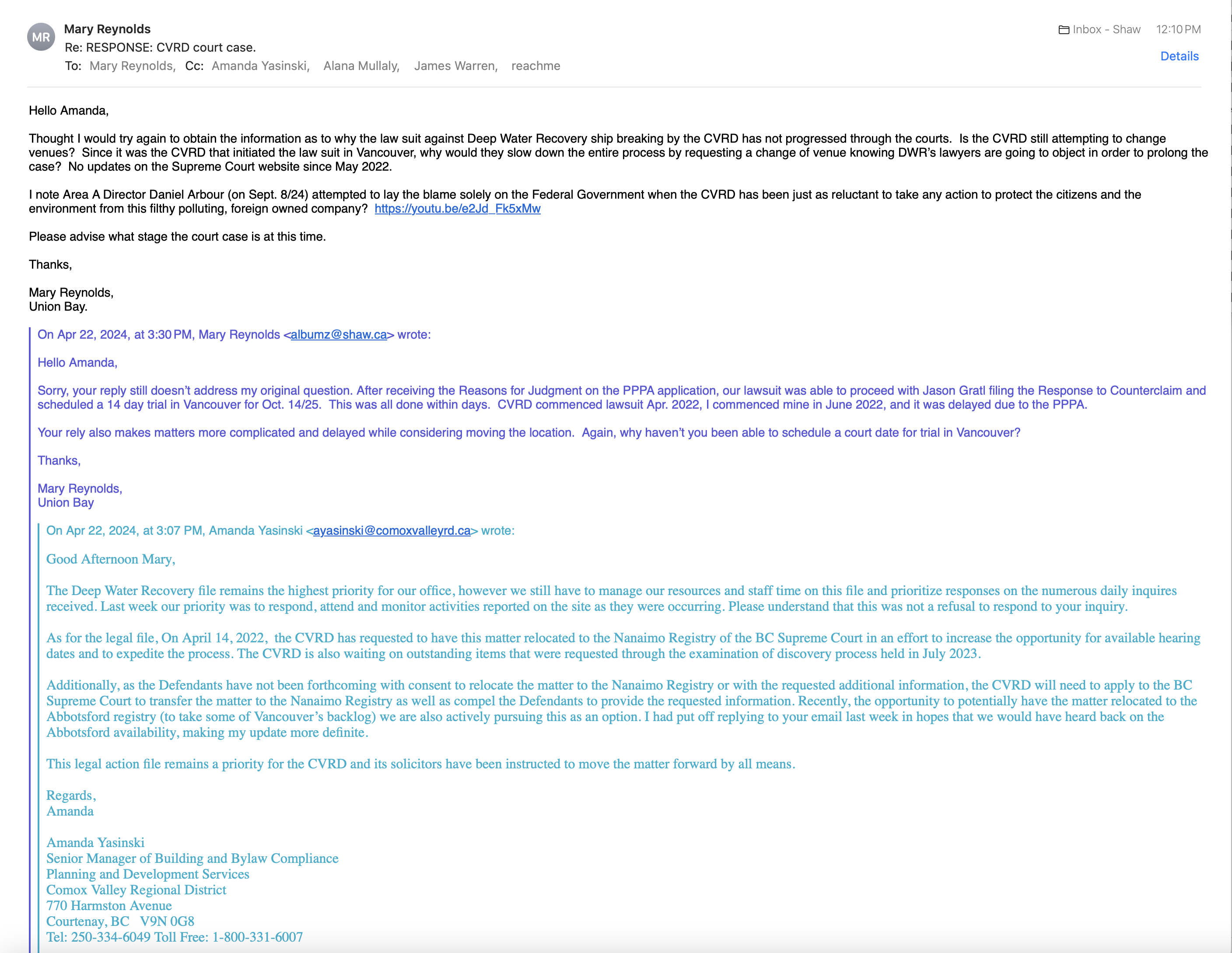 ALL in Vancouver, including scheduling a trial date immediately after the Justice ruled in the Protection of Public Participation Act in May 2024. And yet the CVRD claims they haven’t been able to secure a trial date since 2022 – something stinks.