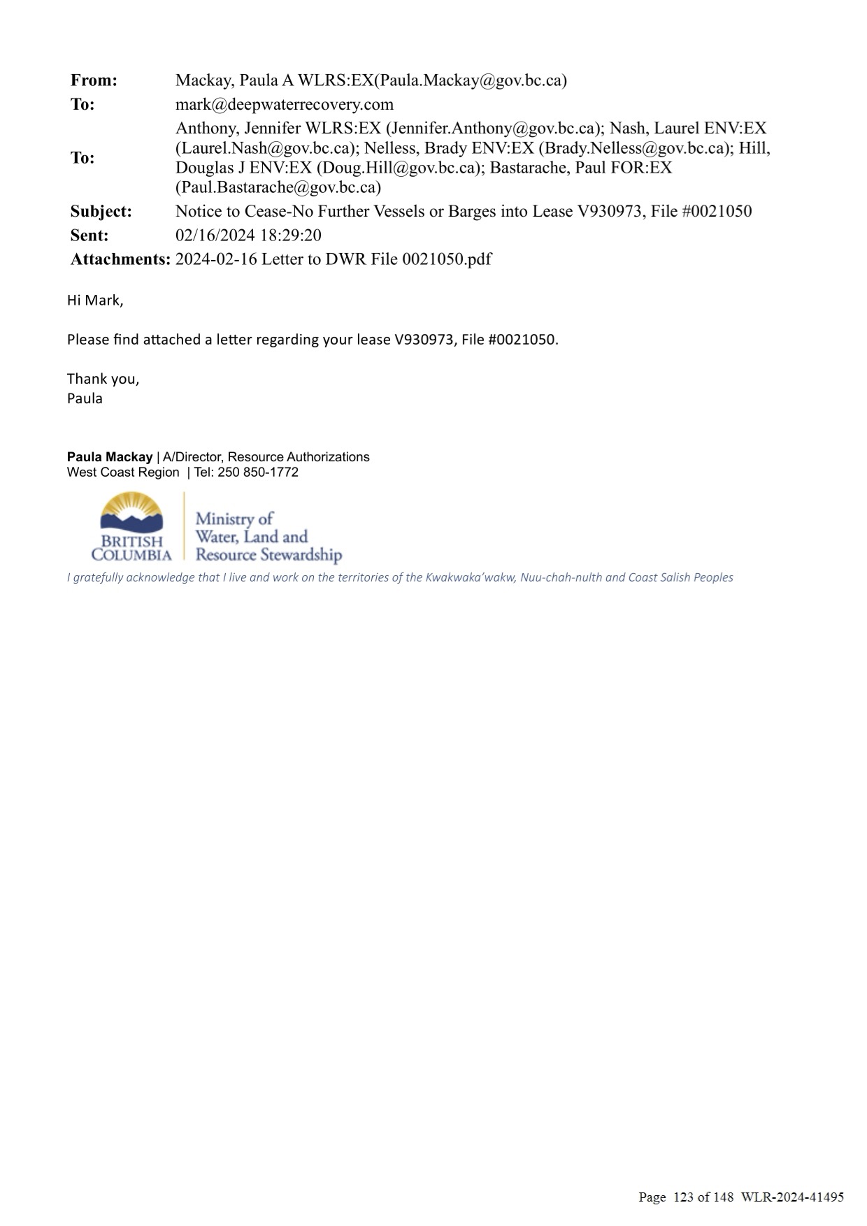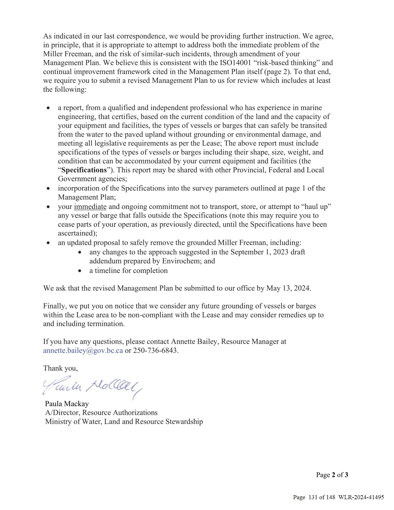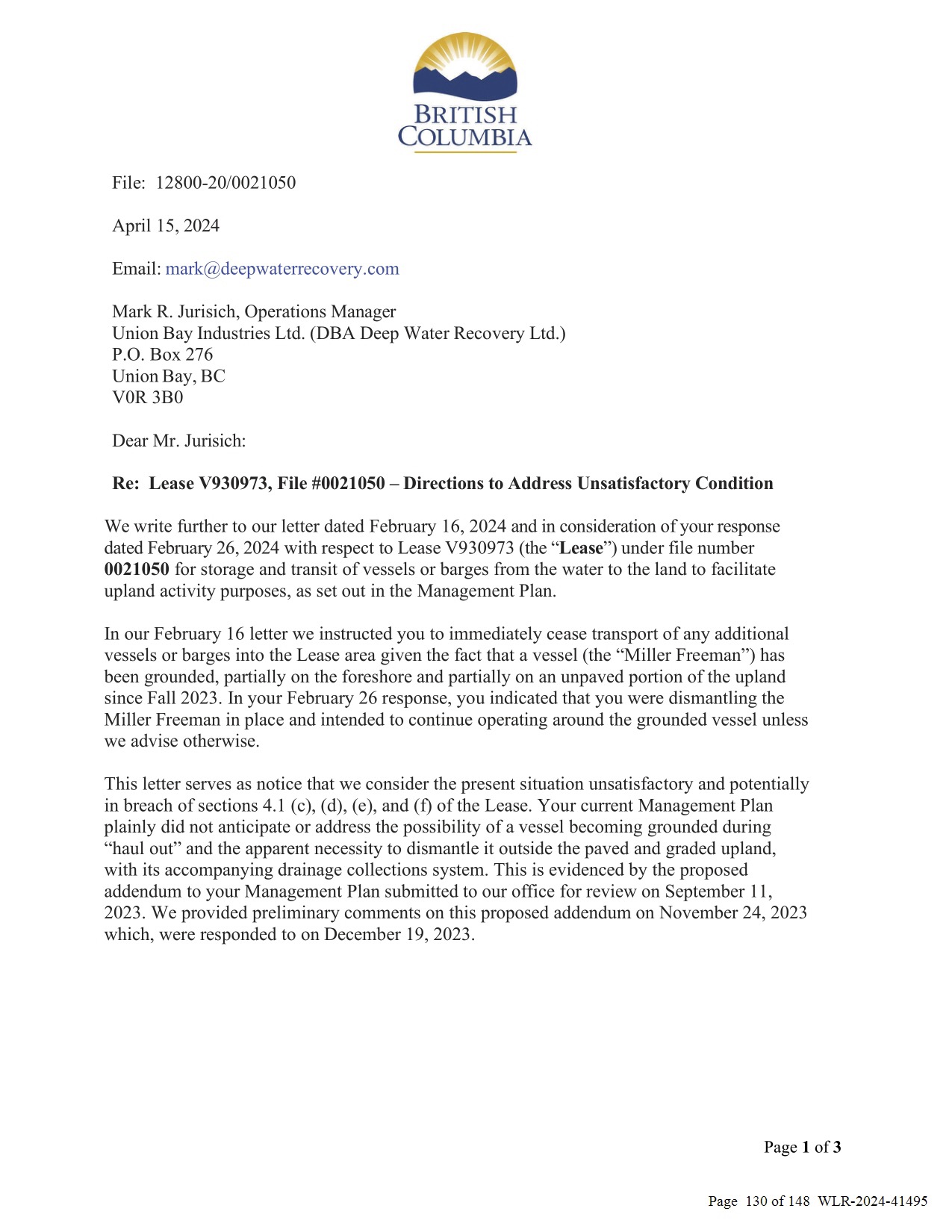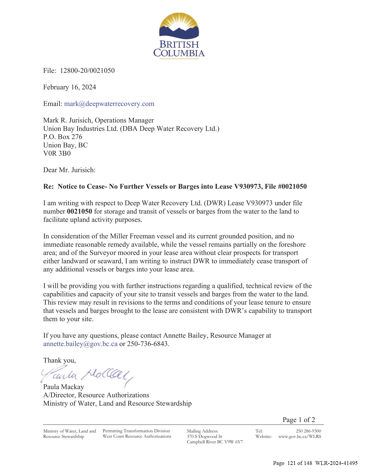 Thug Jurisich has been bull shitting the CVRD, the Provincial and Federal gov’ts about this filthy, polluting, foreign owned company and none of them have the spine to take action. Jurisich just denies everything and continues doing whatever he wants. Look at the response to a bloody Cease and Desist Order – Jurisich brought up another rust bucket barge after specifically being advised not to.