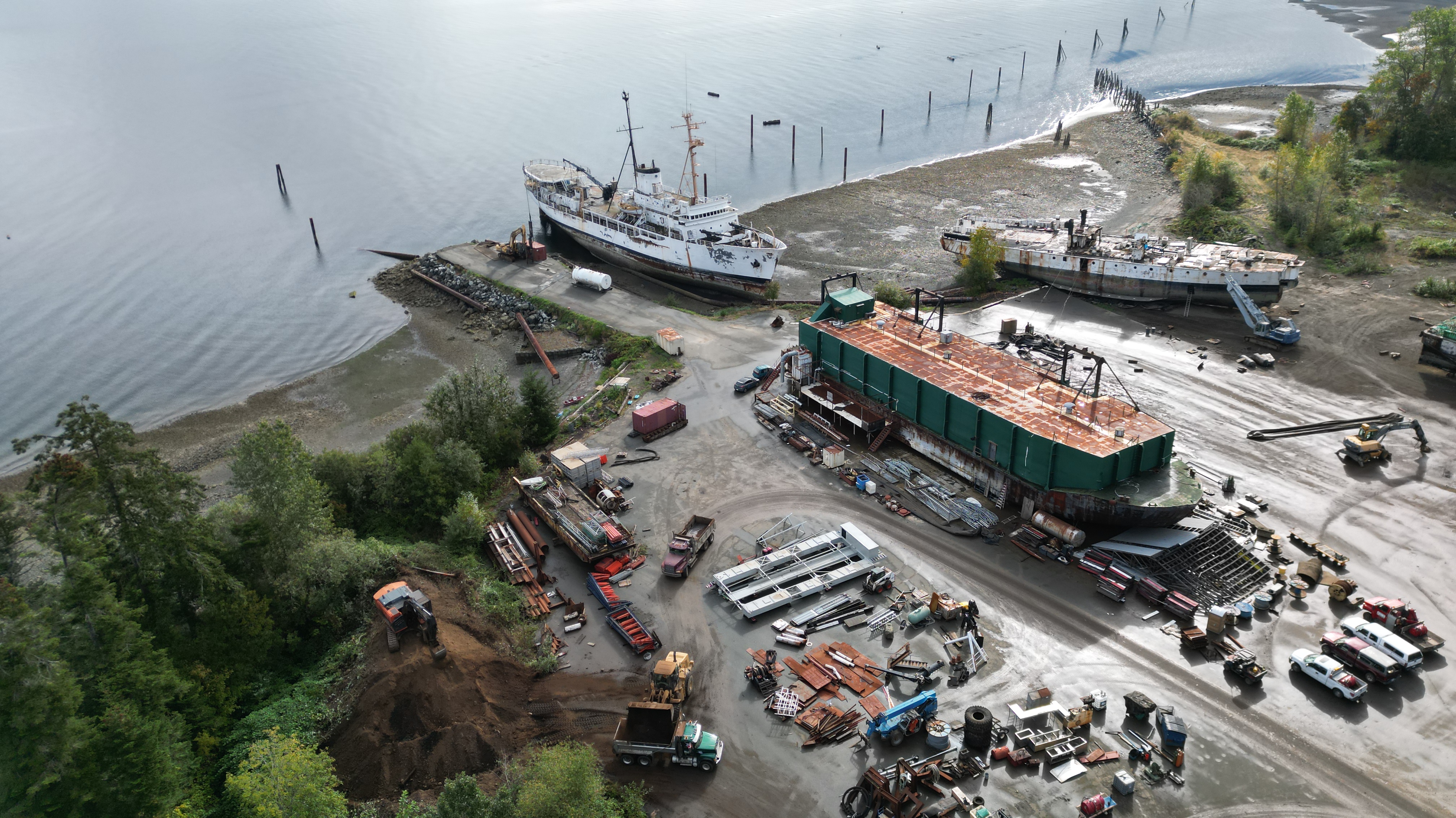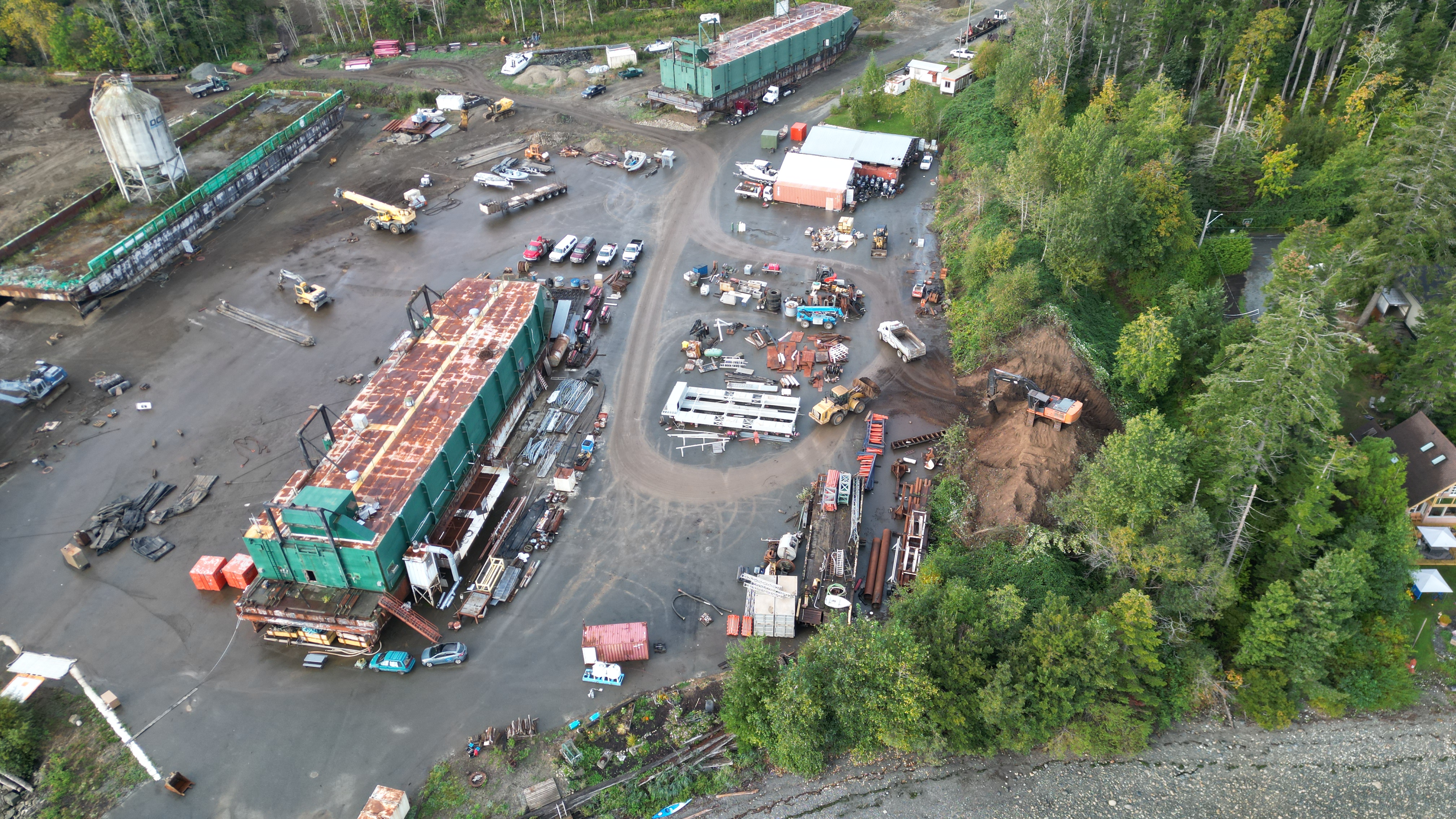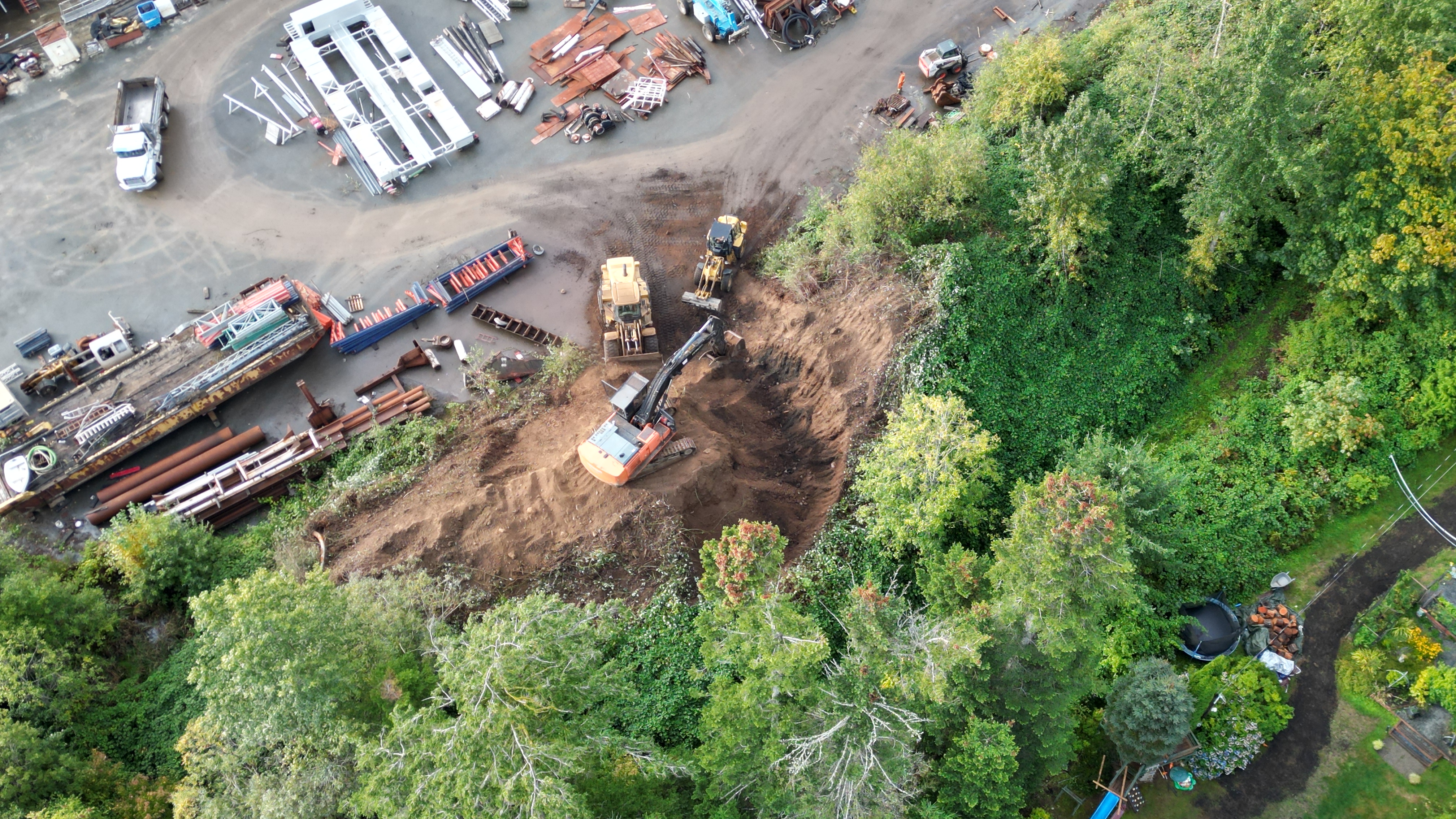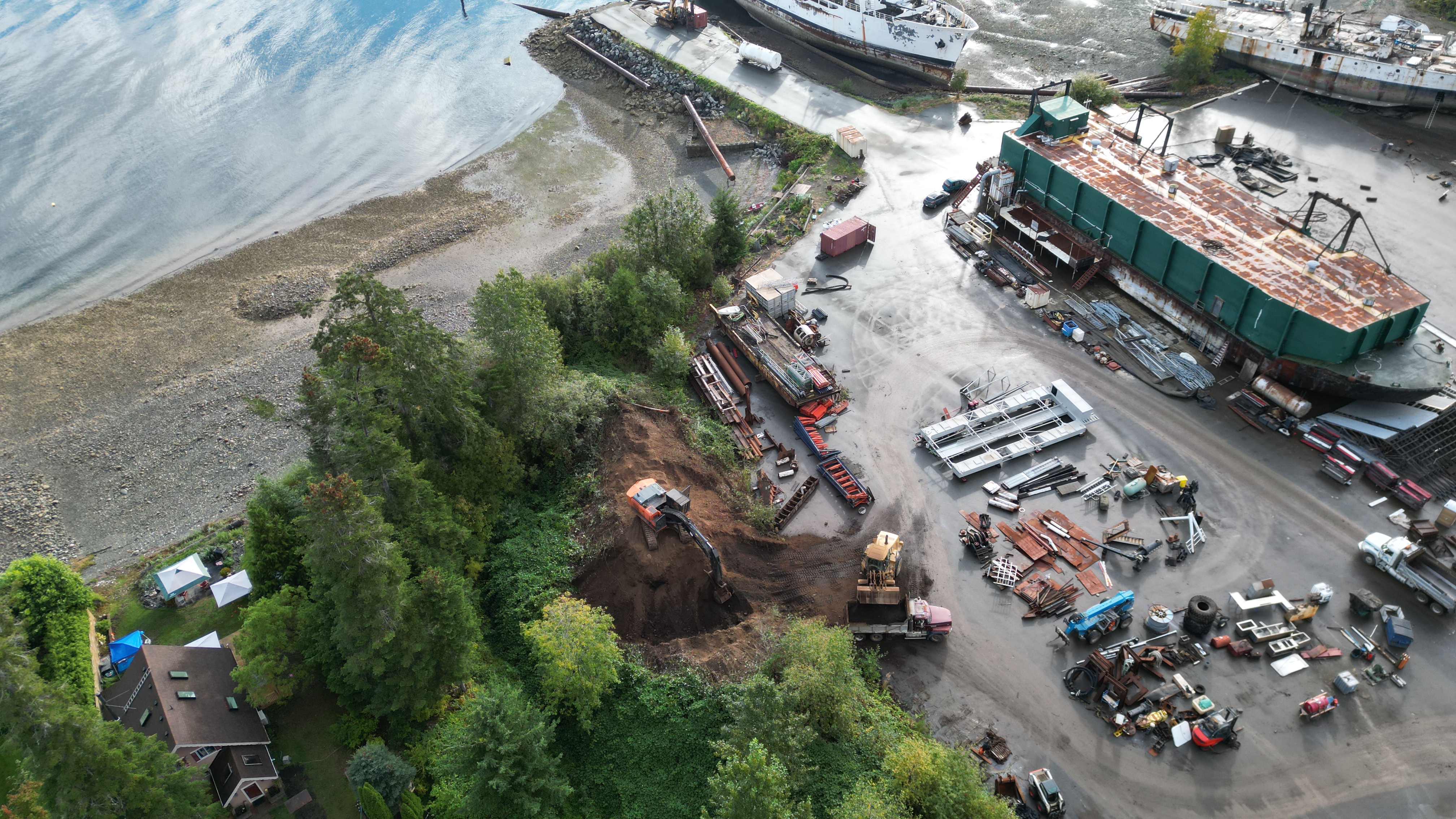 Taking down the berm which provides a buffer to the sound and crap from Deep Water Recovery ship breaking. Such a little man. Notice the watercourse right beside where they are working.