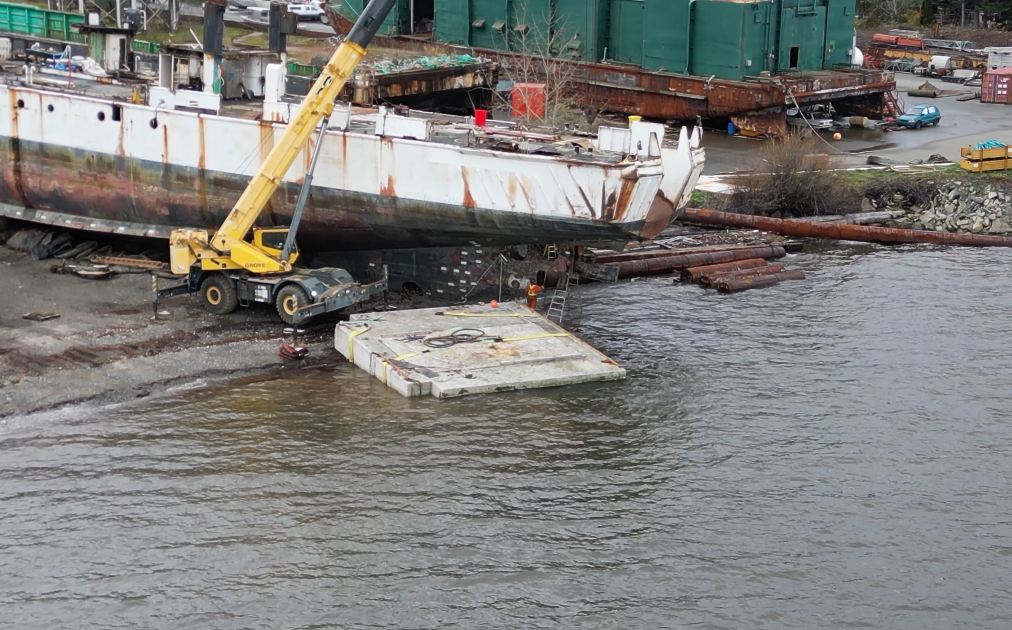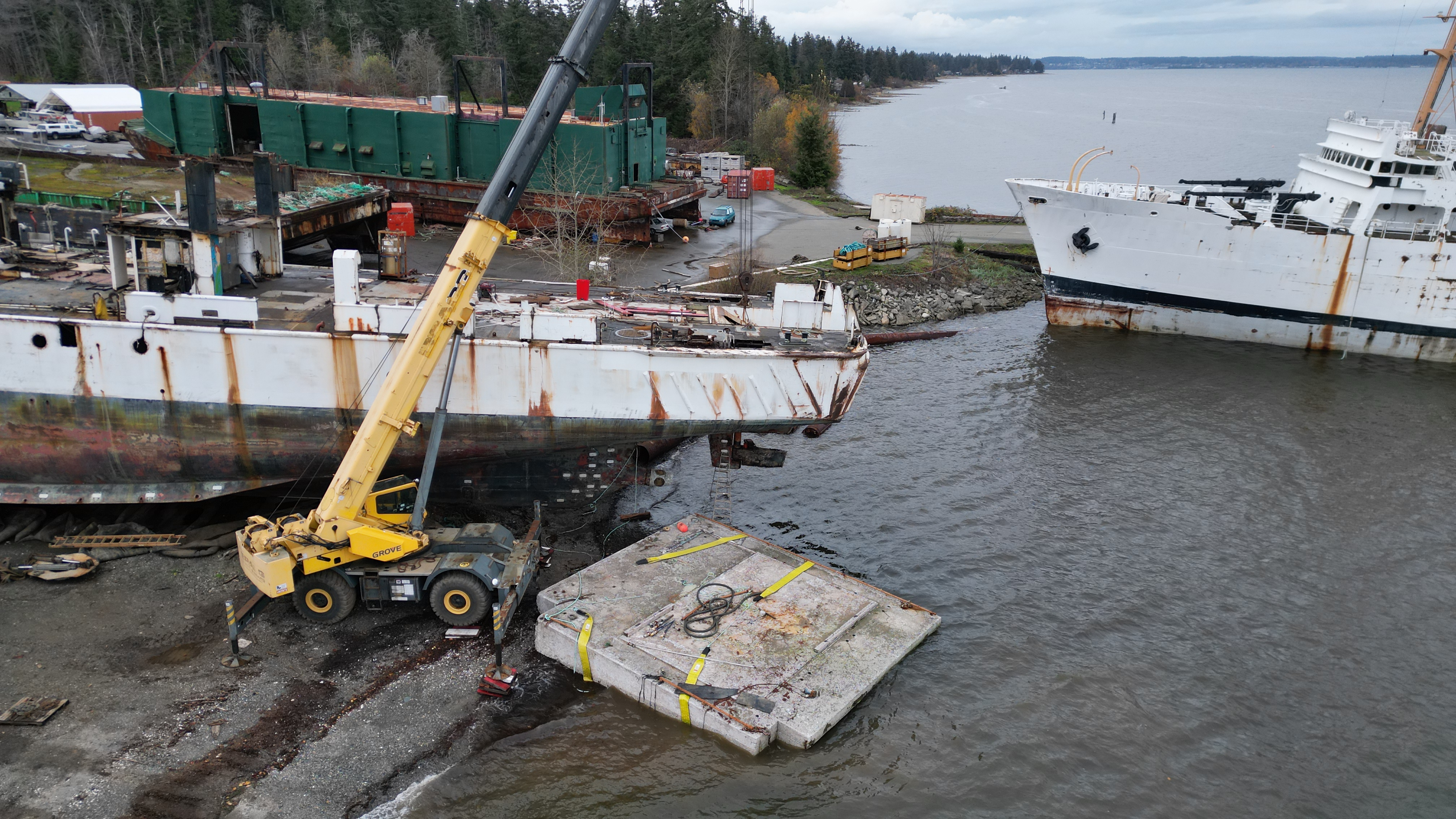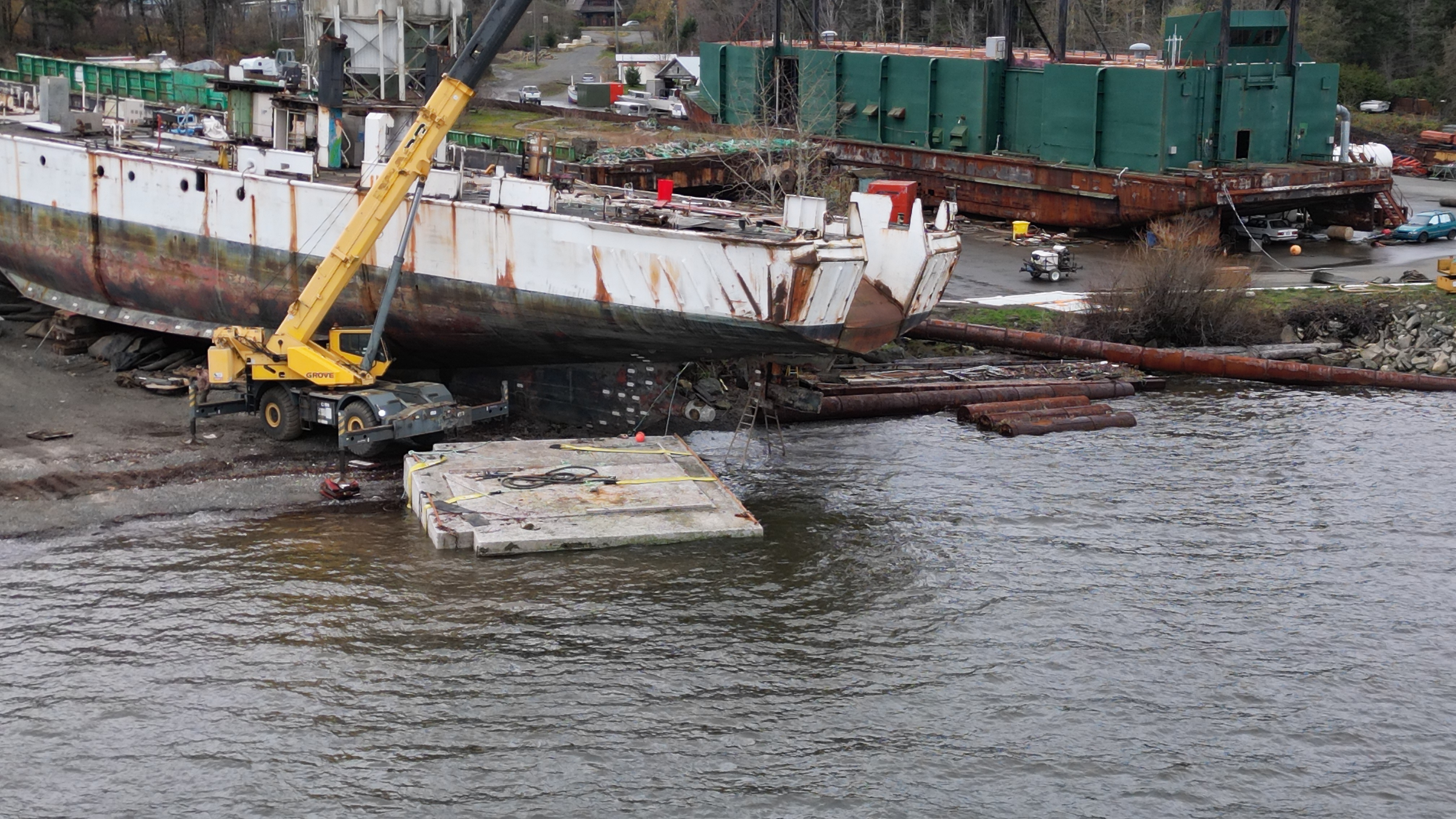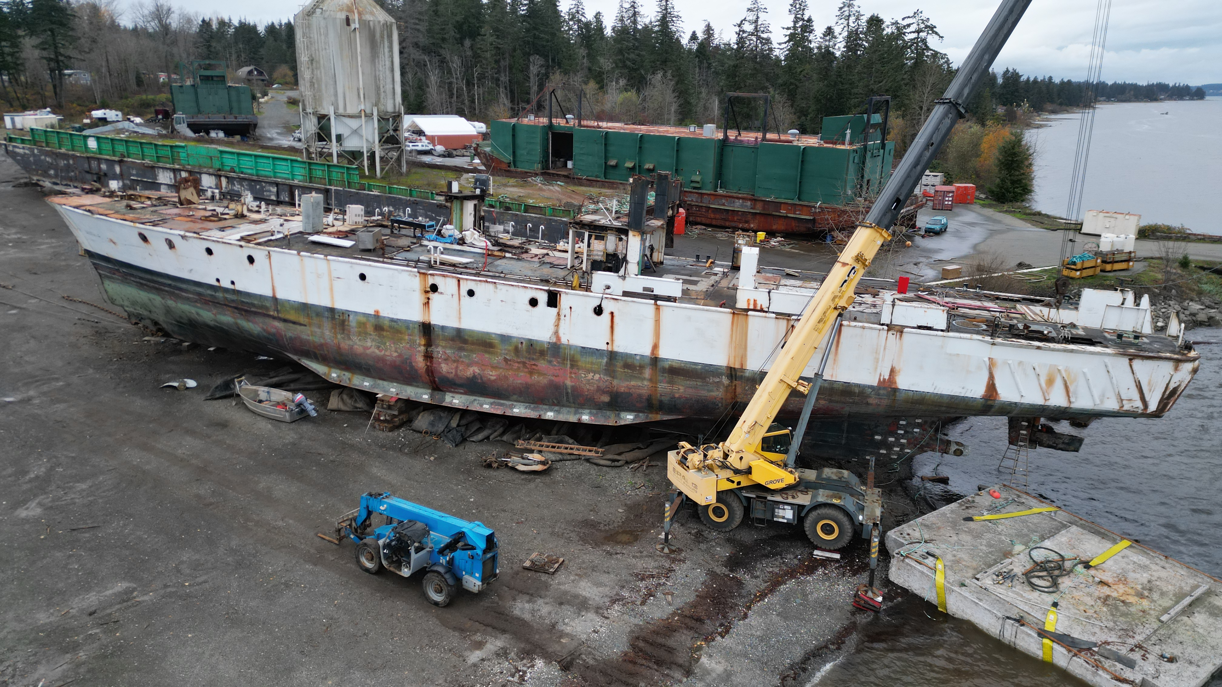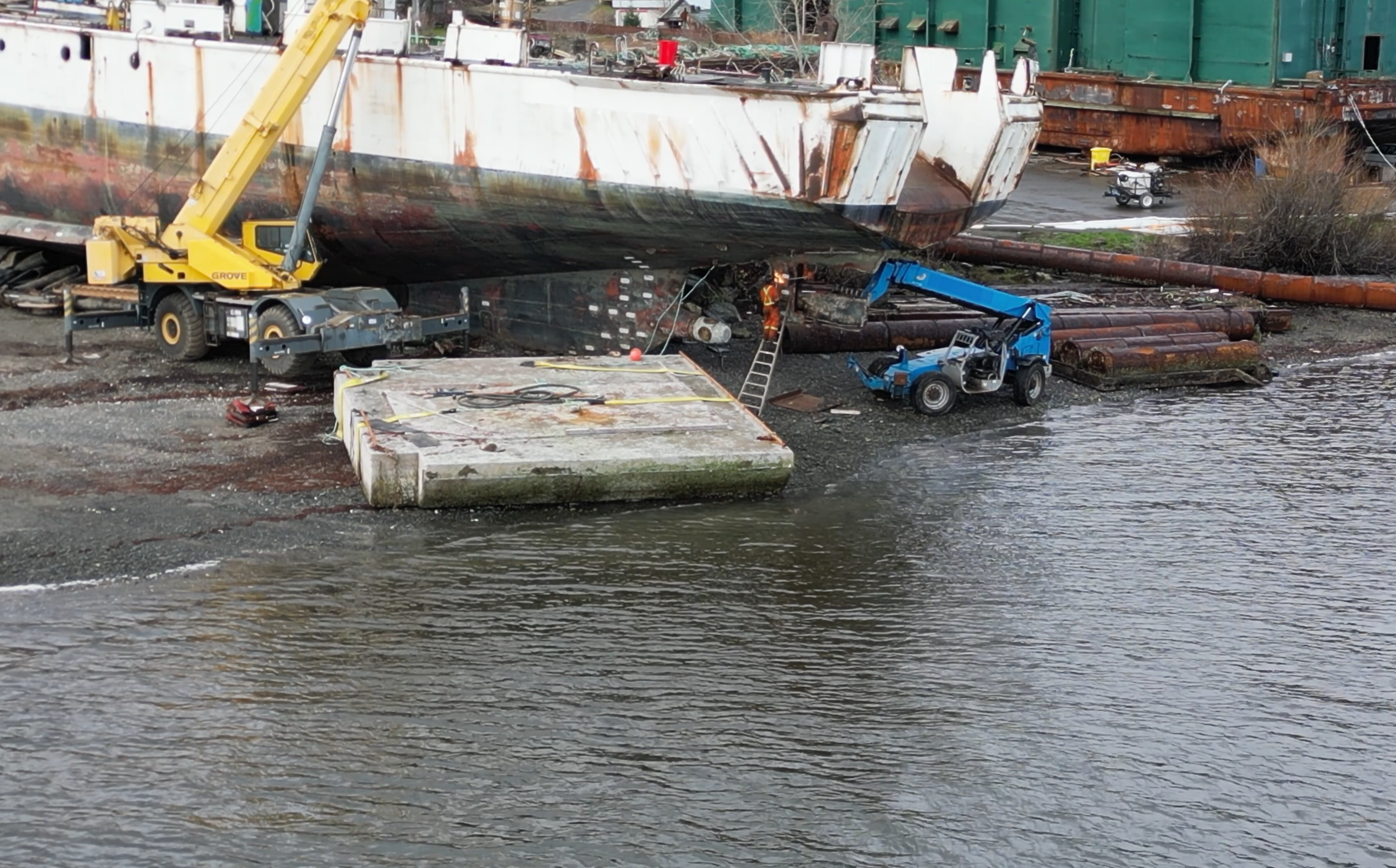 Still torching/ship breaking the asbestos laden Miller Freeman’s rudder below the high tide mark with no precautions as to what is being introduced to the marine environment. See that blue piece of equipment – they would have had to drive that into the ocean, around the cement block to get back above the high tide mark.