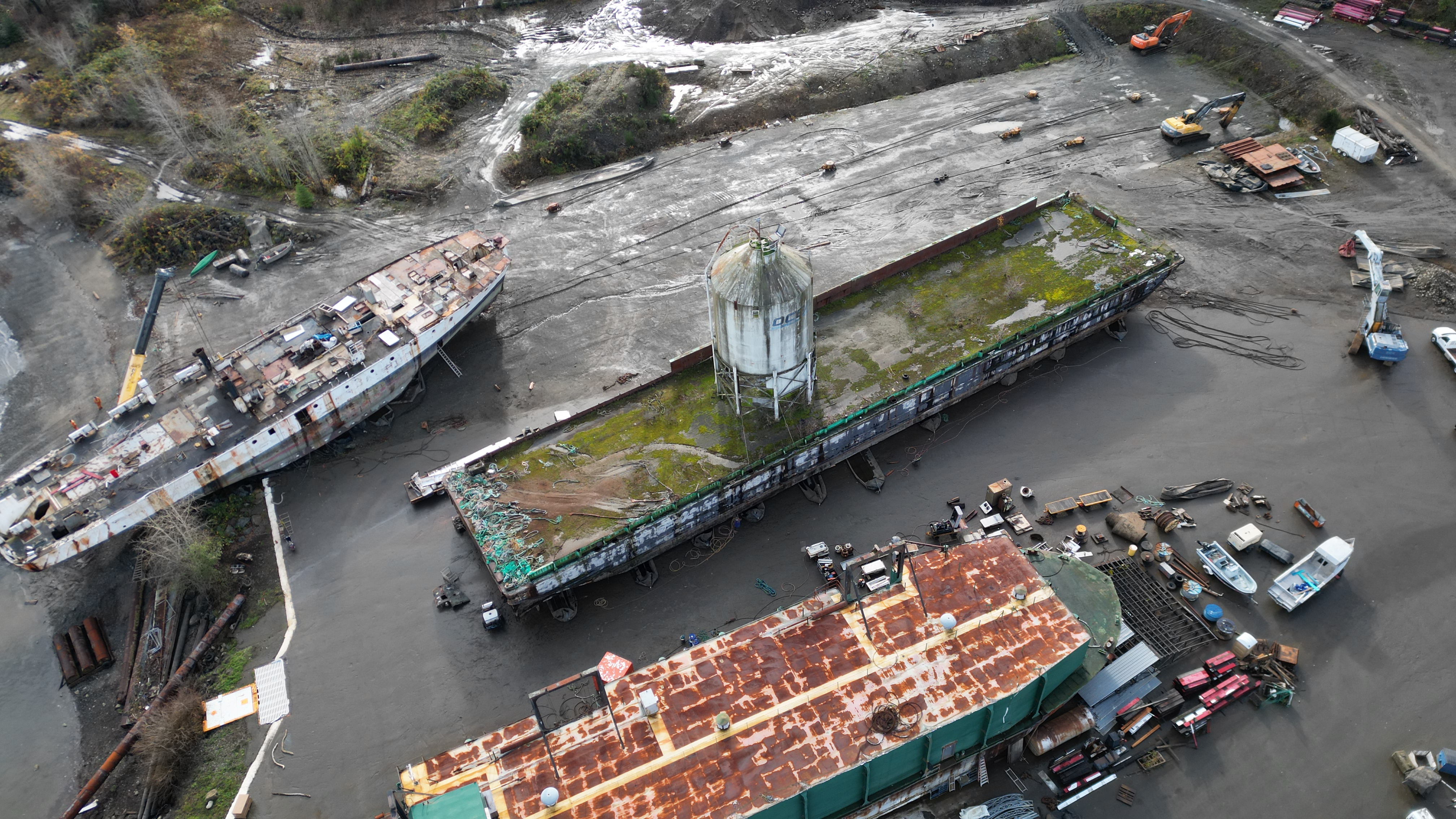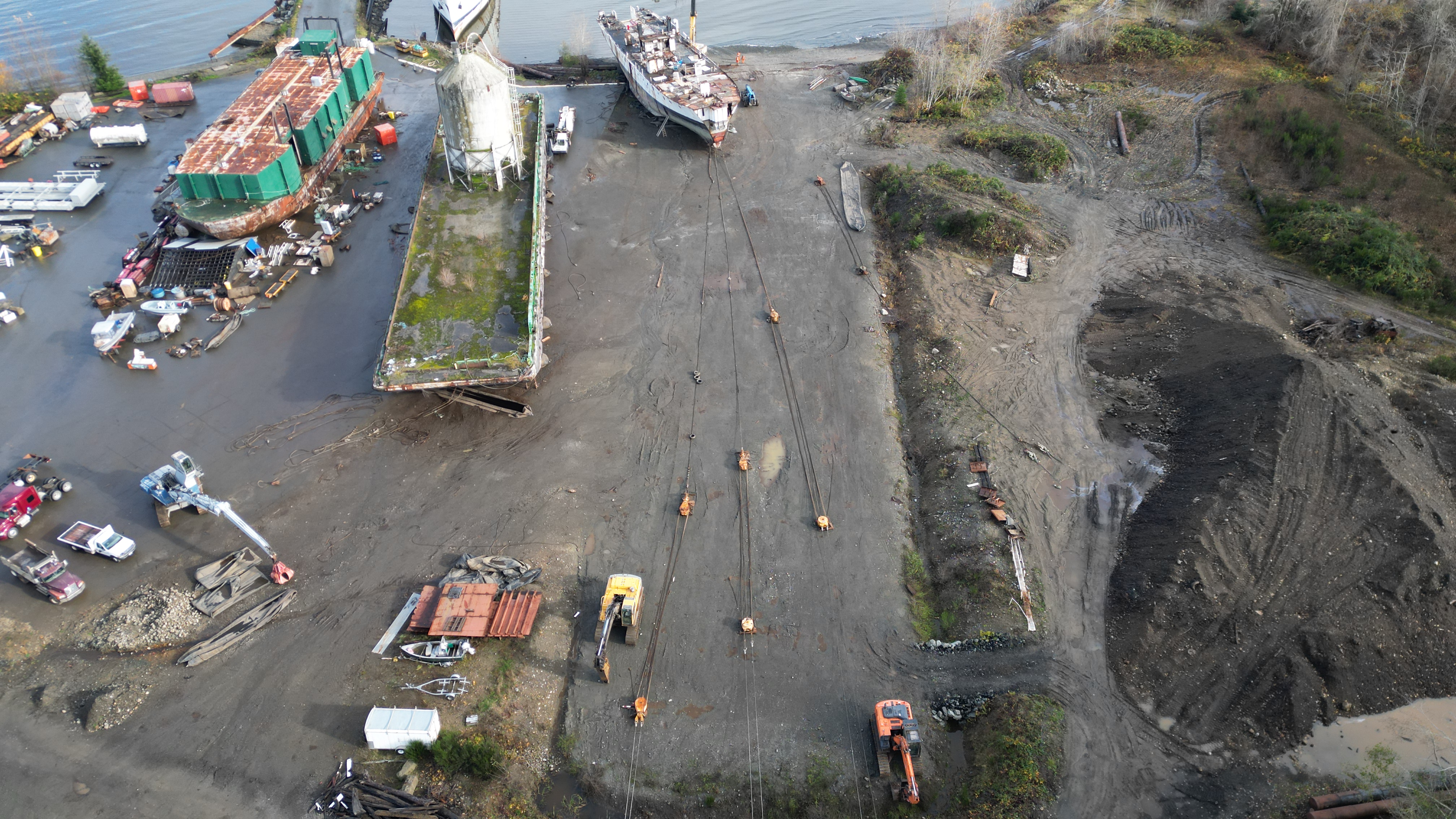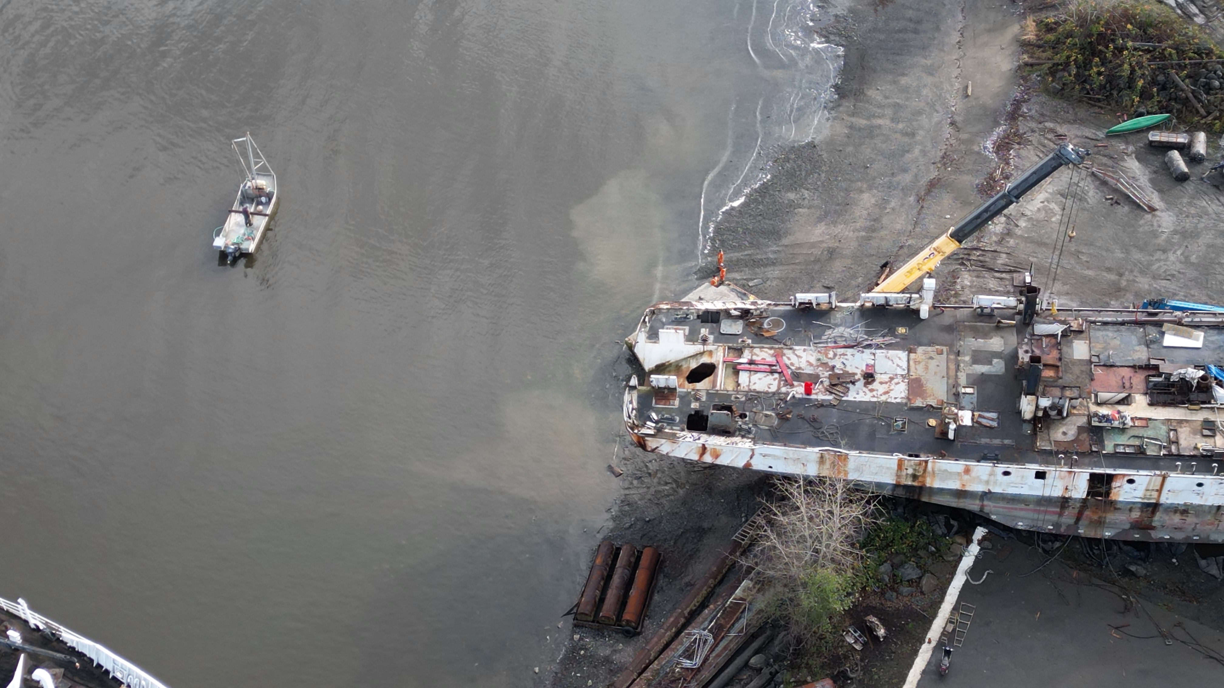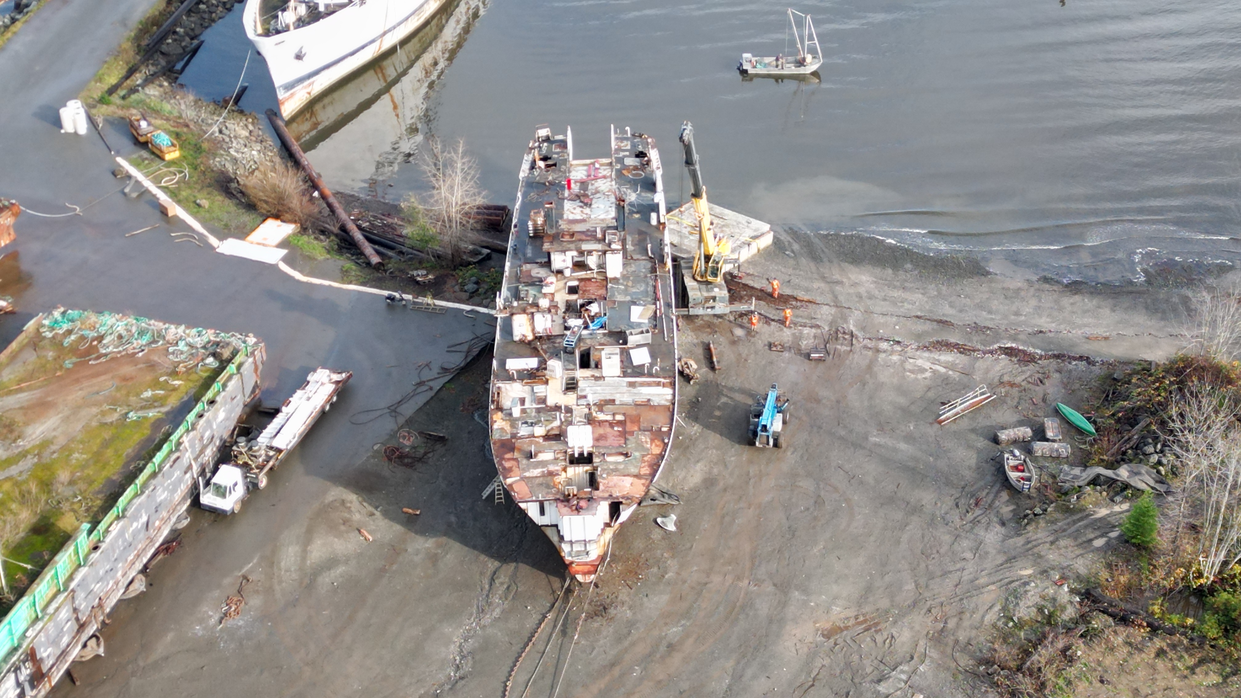 Blue piece of equipment taking away the piece of rudder they torched apart below the high tide mark. Looks like they might have had a spill today – guy in a boat just off shore. Grinding/churning up the shoreline while ship breaking right on the beach. This foreign owned company doesn’t give a shit about Baynes Sound, Union Bay, the Province or our country – here to take advantage of our non existent ship breaking regulations and our useless MLA Josie Osborne is fine with this. She has the power to pull their lease and is too chicken shit to take action.