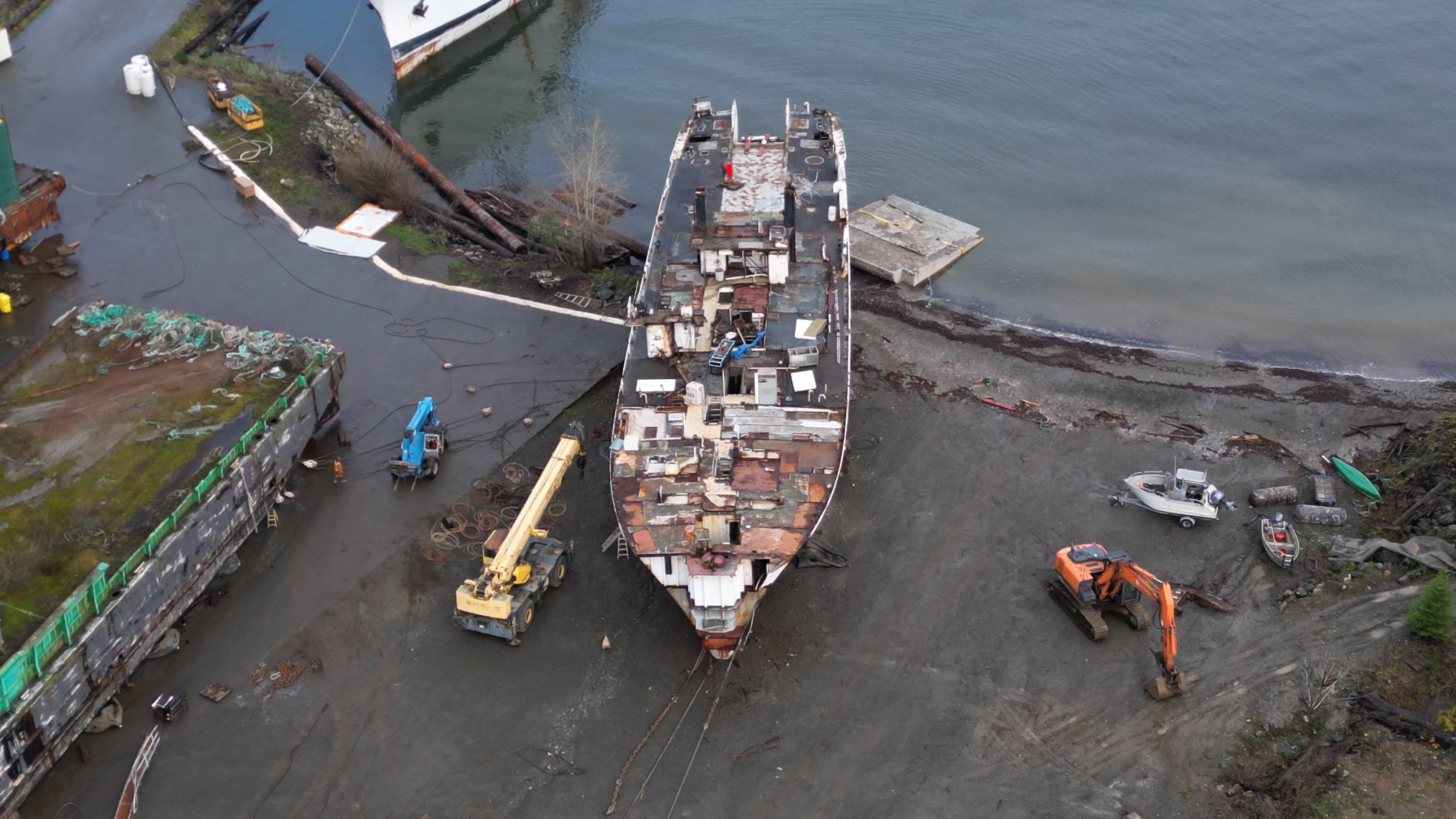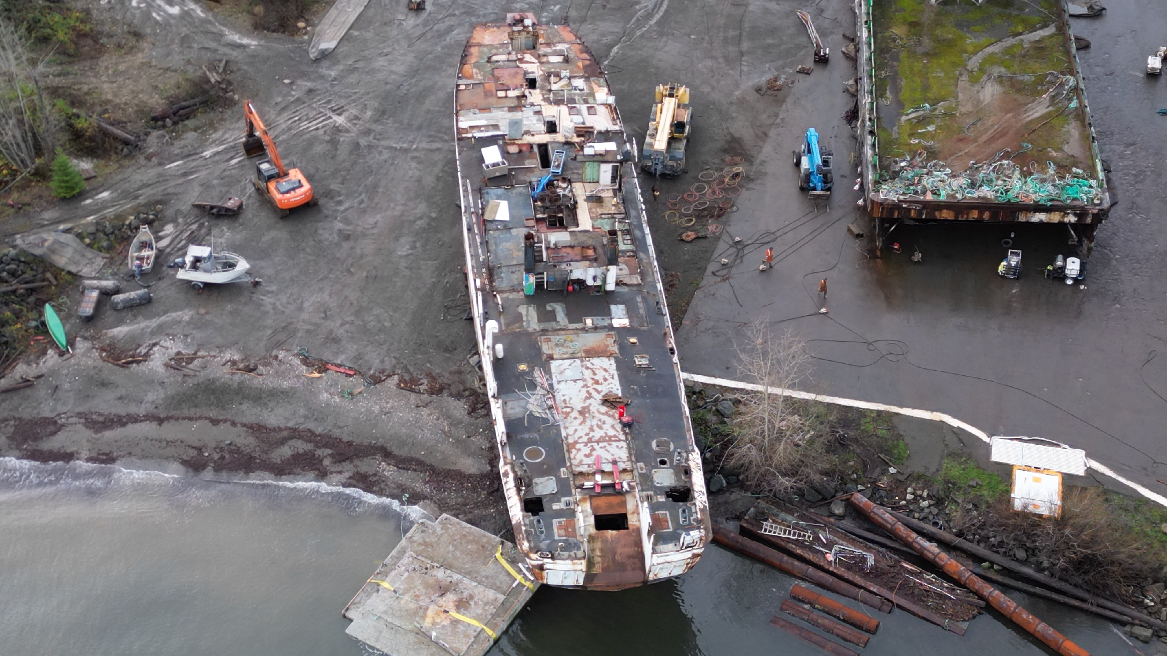 Hooking up rigging again to the asbestos laden Miller Freeman, this time to the rust bucket barge. Over 2 years trying to bring the Miller Freeman upland – doesn’t this prove these idiots don’t have the expertise, equipment or facilities? Shut this shitshow down.