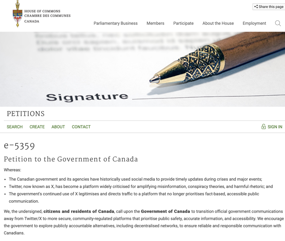 We, the undersigned, citizens and residents of Canada, call upon the Government of Canada to transition official government communications away from Twitter/X to more secure, community-regulated platforms that prioritise public safety, accurate information, and accessibility. We encourage the government to explore publicly accountable alternatives, including decentralised networks, to ensure reliable and responsible communication with Canadians.