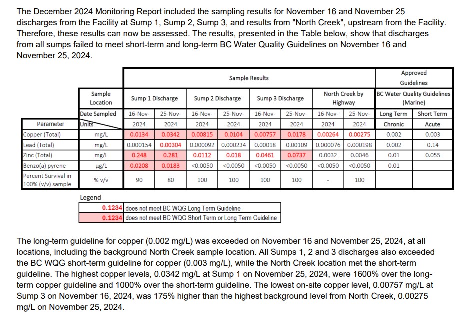 Copper – “Exceeded BC Water Quality Guidelines (BC WQG) by up to 23,950%”