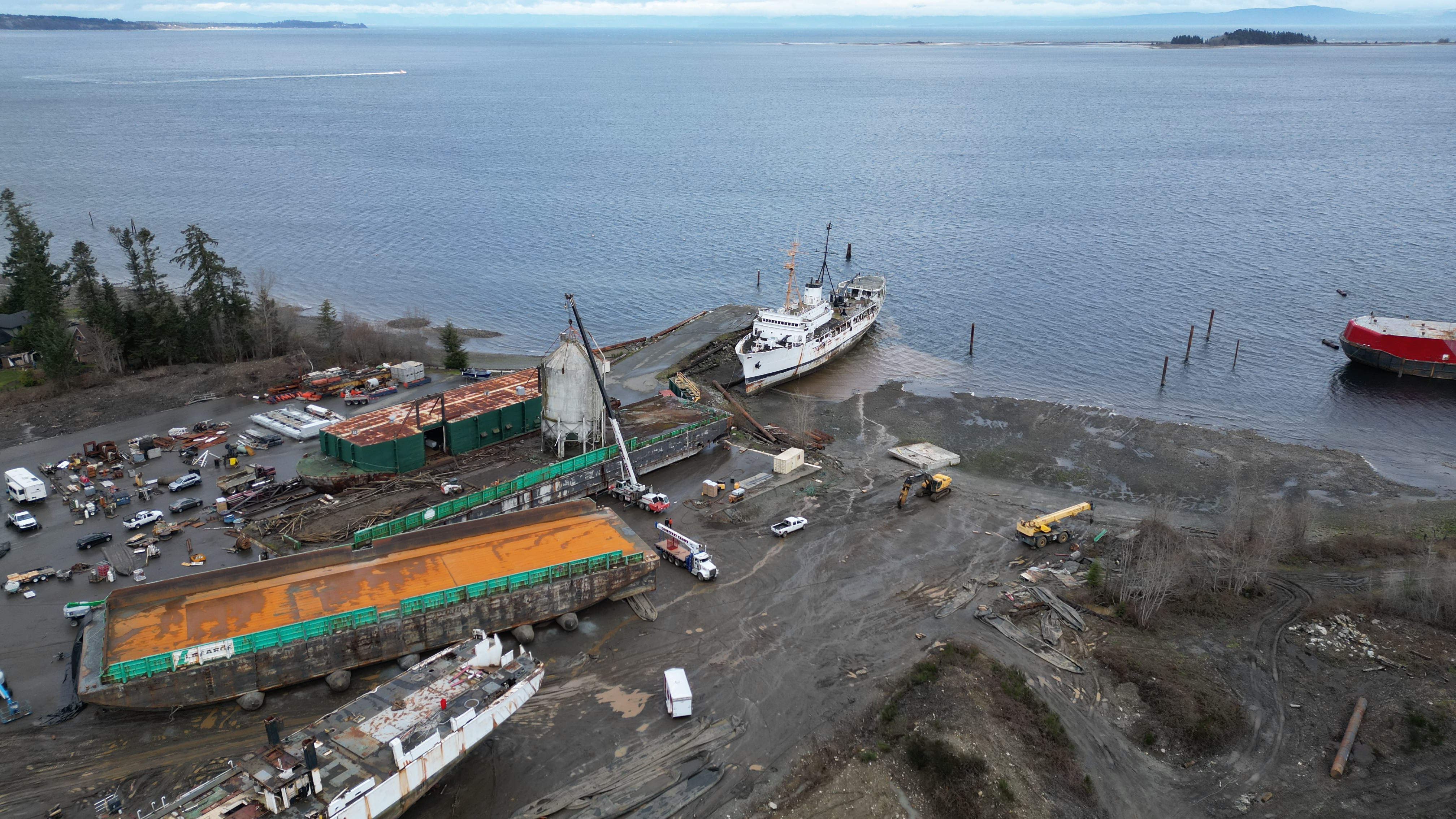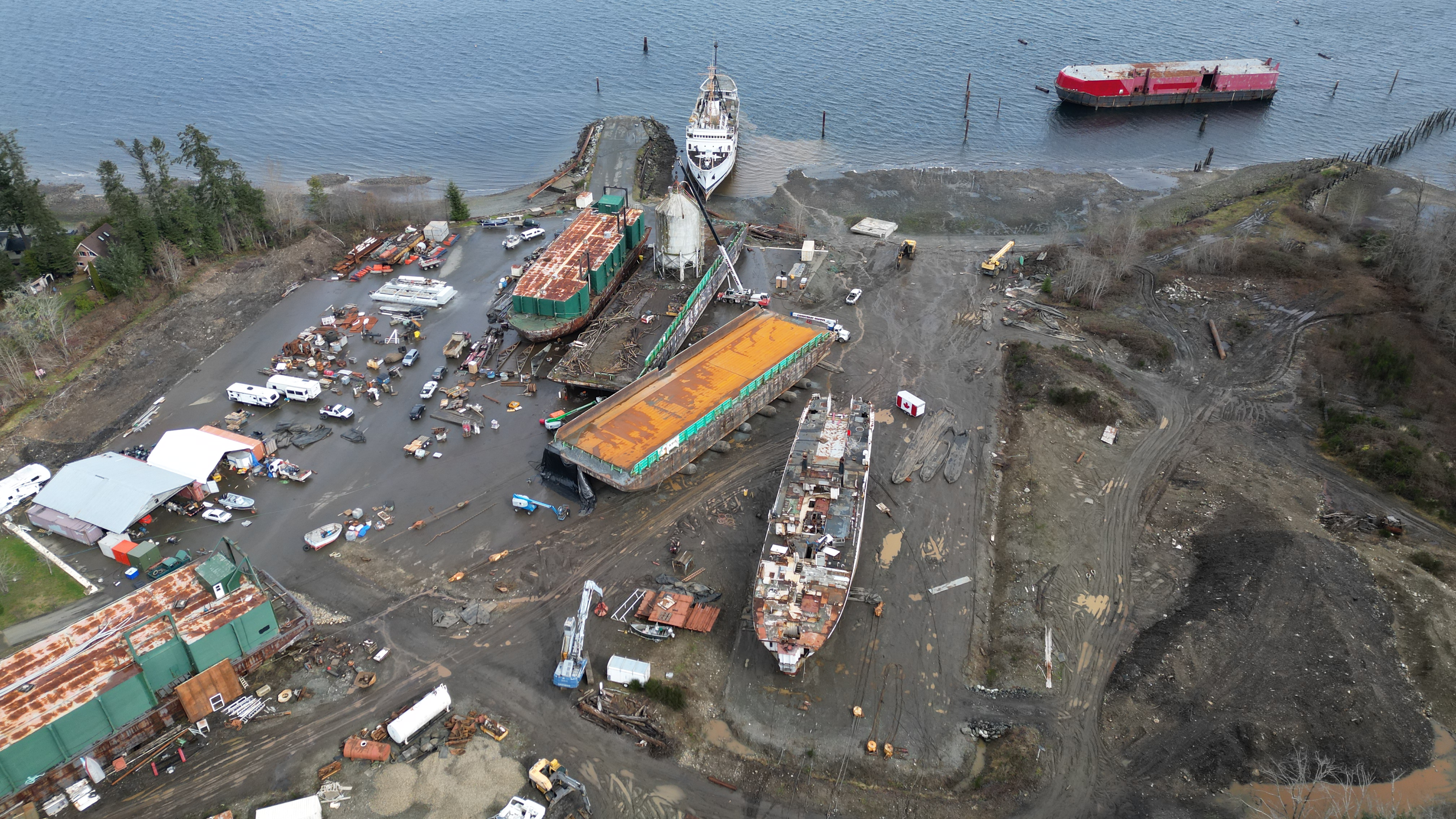 Notice the company truck contributing to the grinding up of the soil. The companies patronizing DWR are working against those of us concerned about Baynes Sound and this polluting ship breaking company. They’re hiding behind DWR’s defiance of the Ministry of Environment and they know it.
