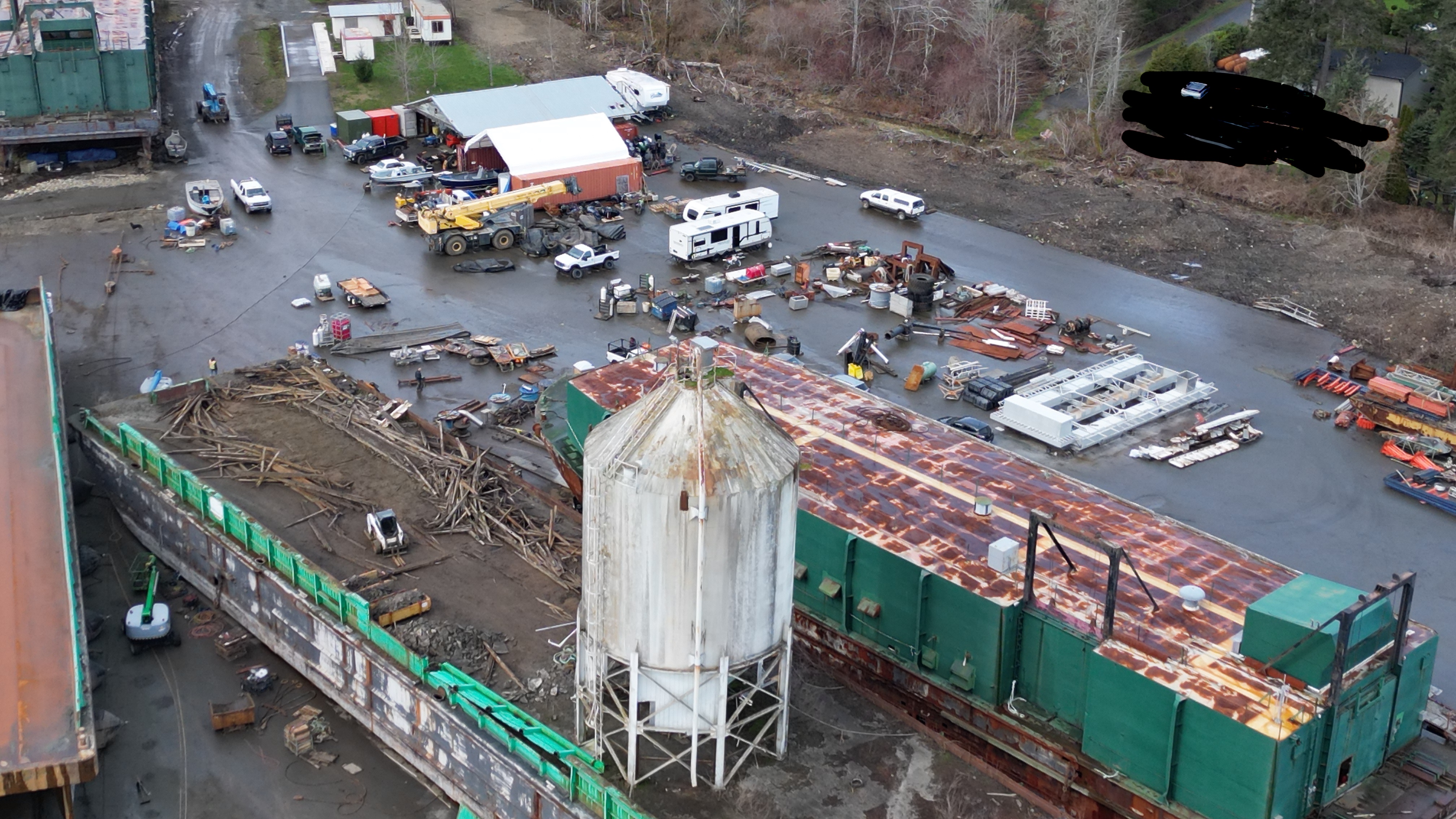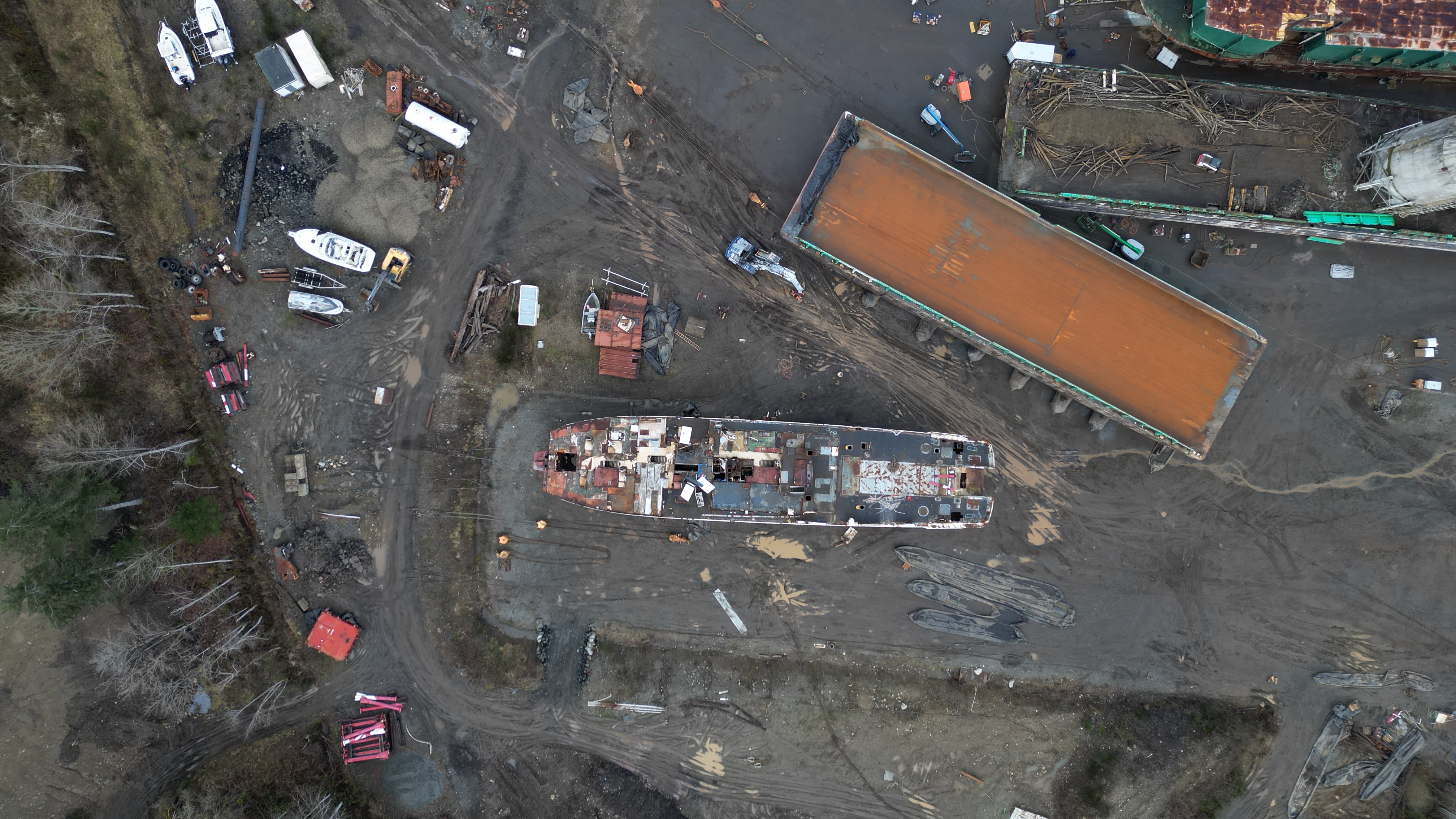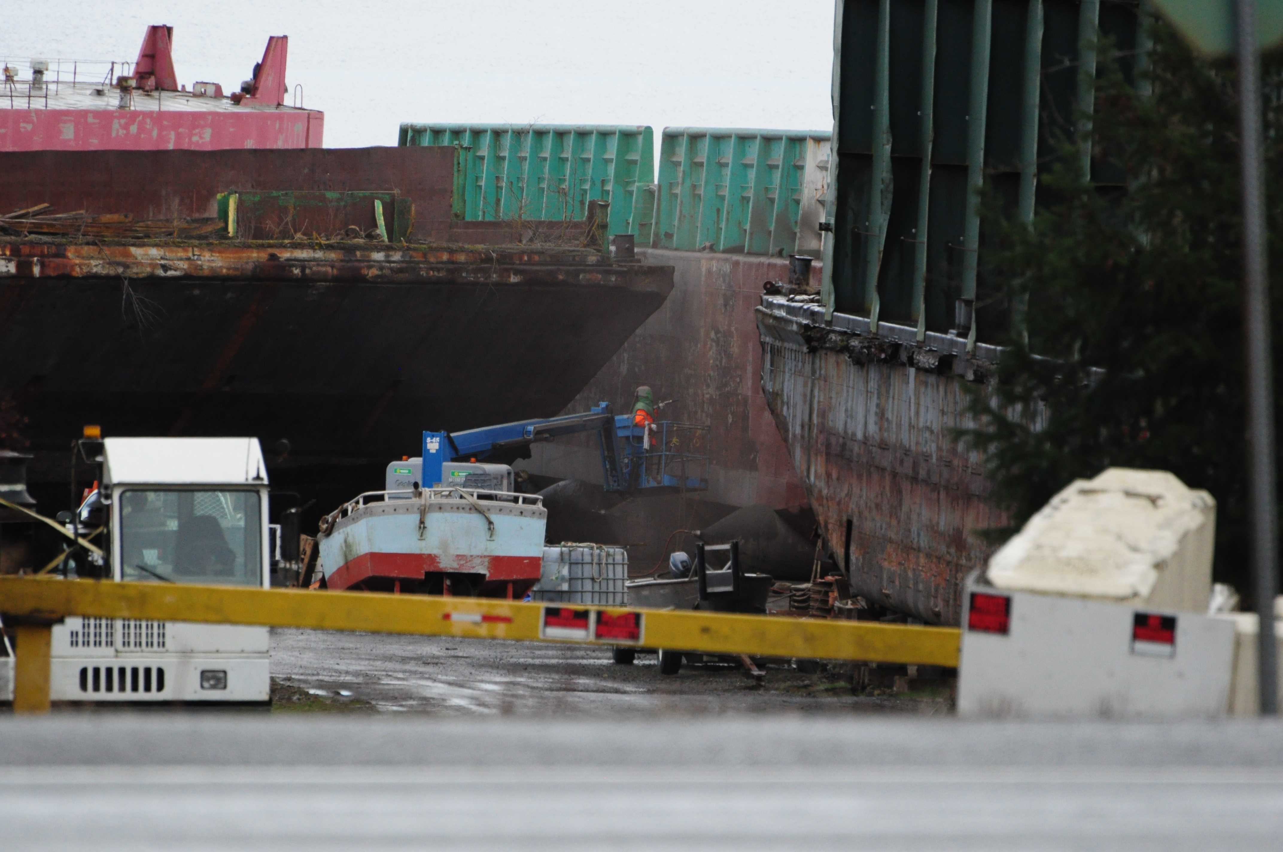 They’ve started priming the barge Dynamic Steel Repair is working on. Gee, do you think they’ll put anything in place to prevent paint, etc. from reaching the soil when they start priming the side of the barge straddling the asphalt and soil?