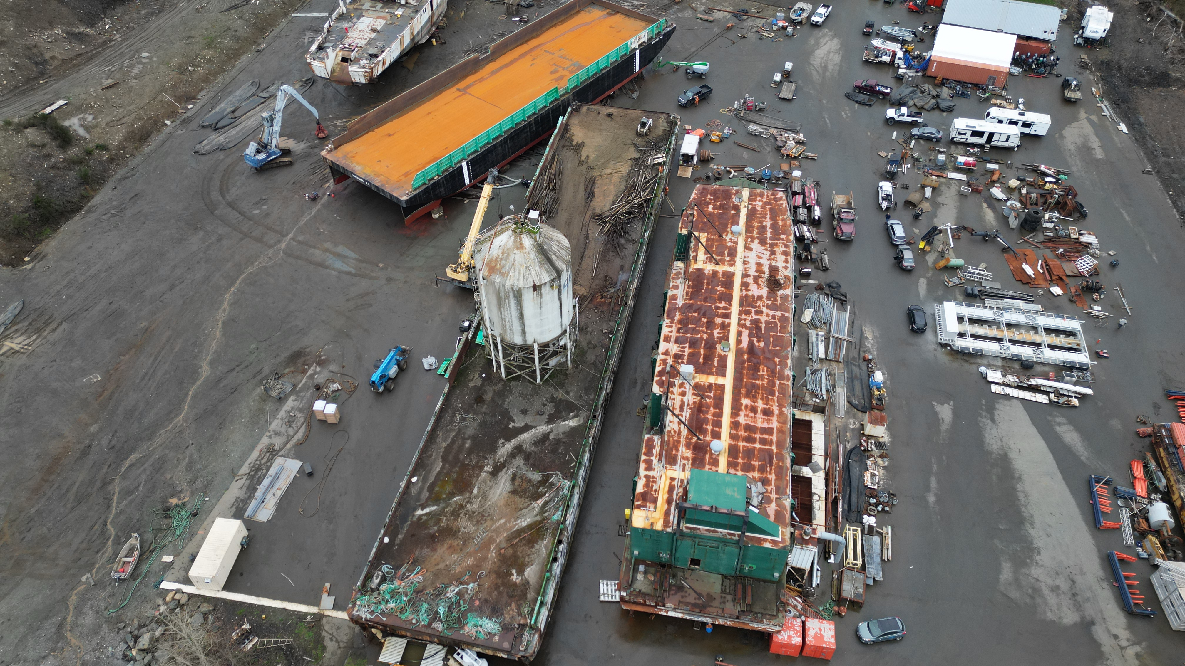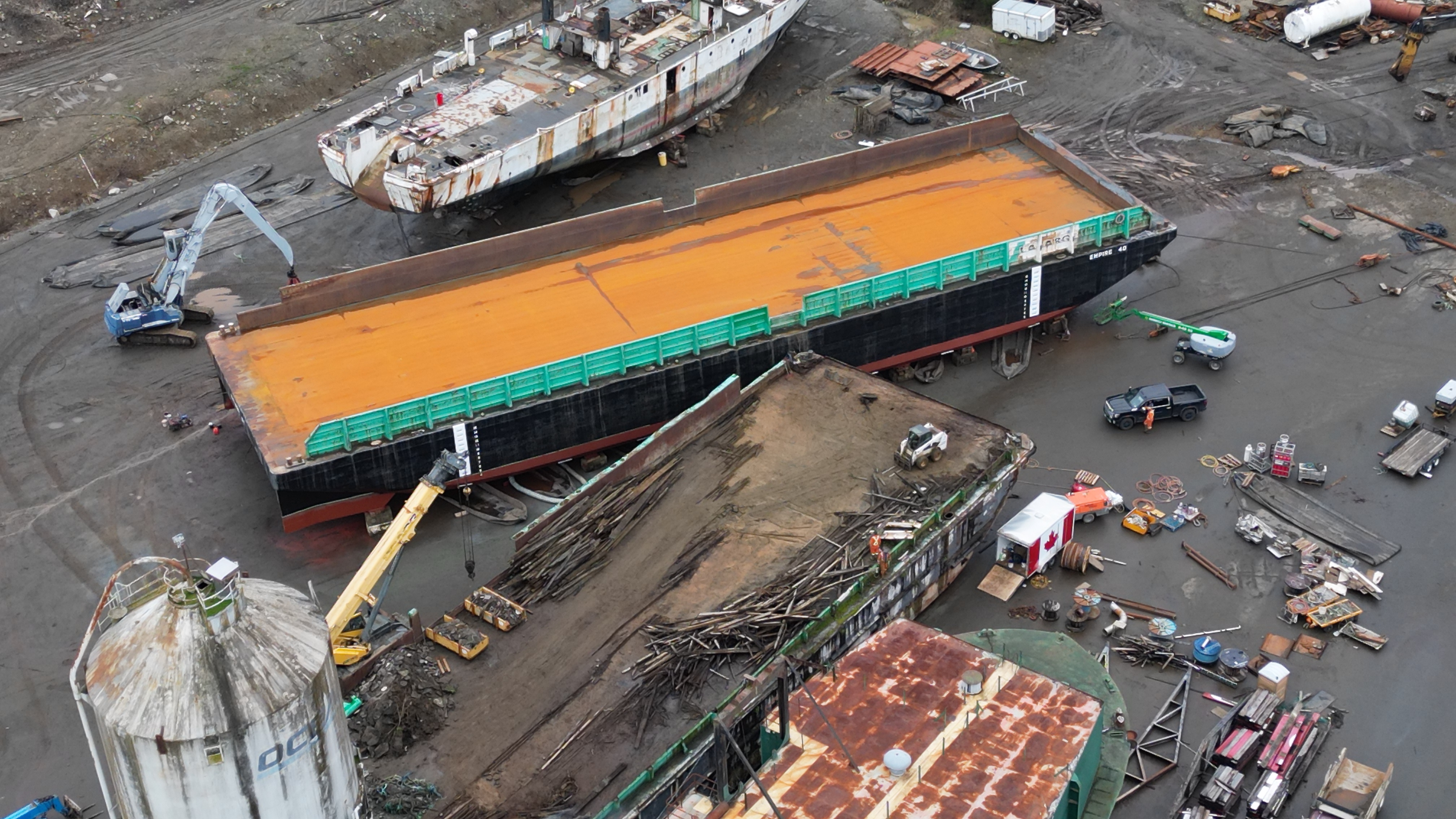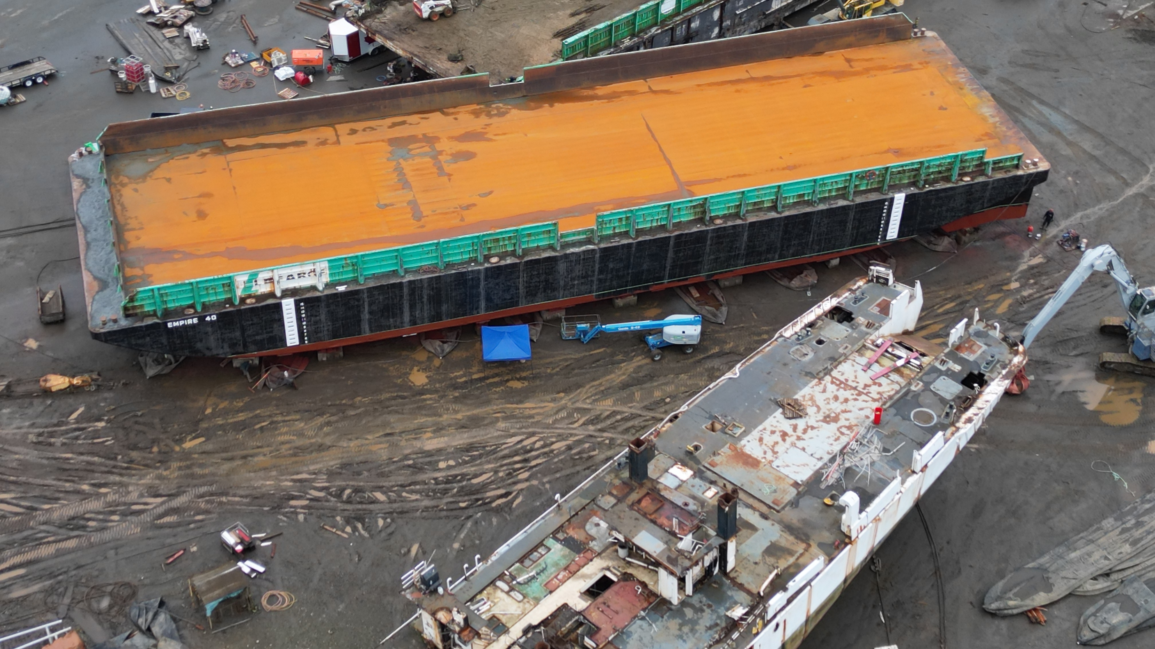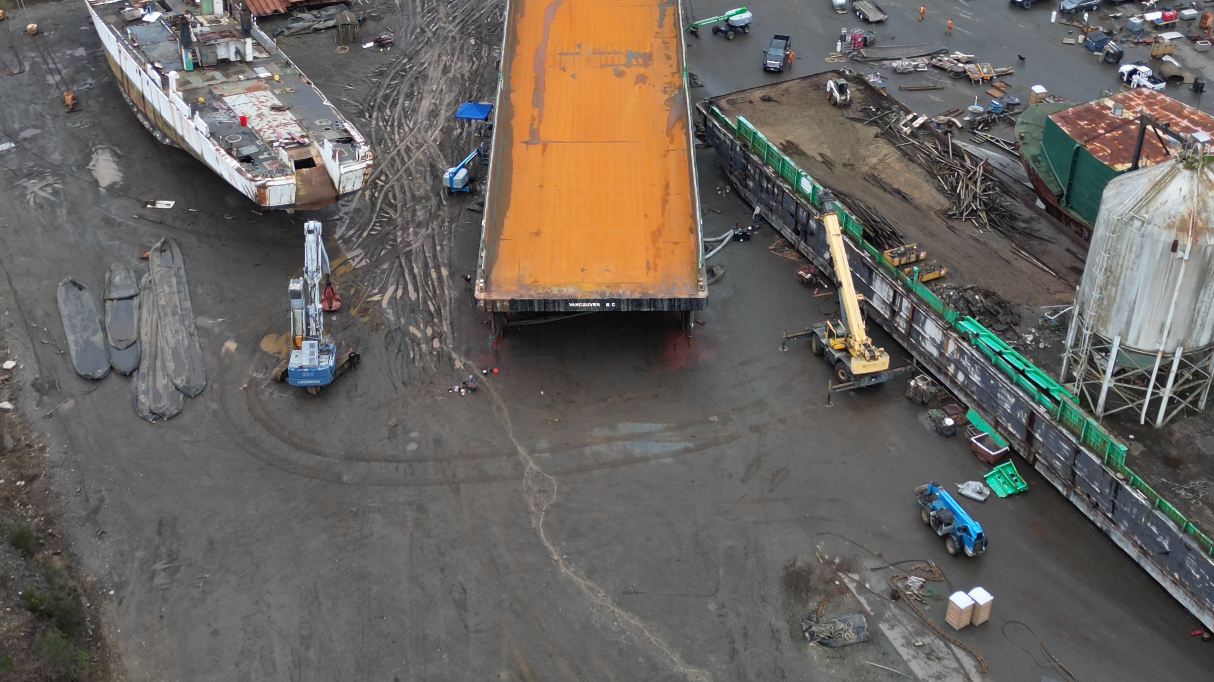 Keep an eye on the guy with the broom (?) around the newly painted barge. Watch as he uses it to wash the paint (?) away and into the flow draining into the ocean. You can see him in the beginning of the video working his way down. Out of sight, out of mind, right?