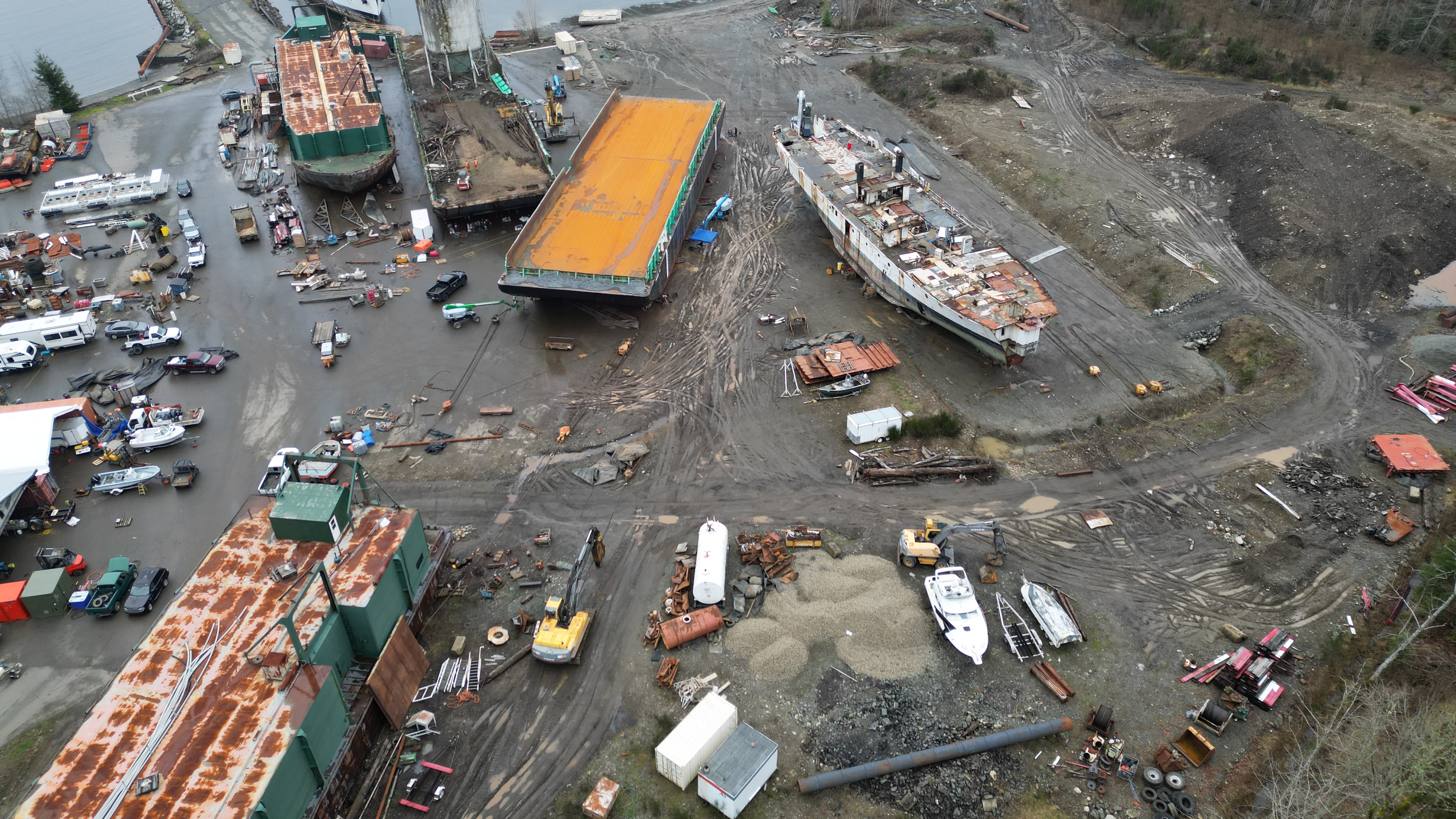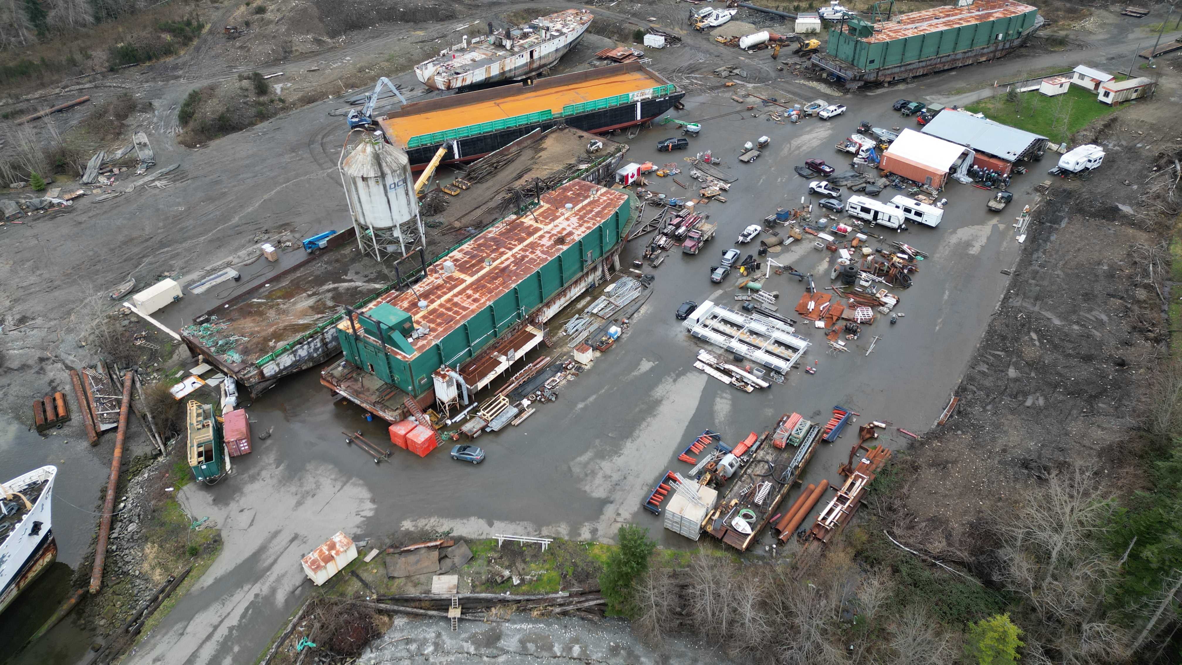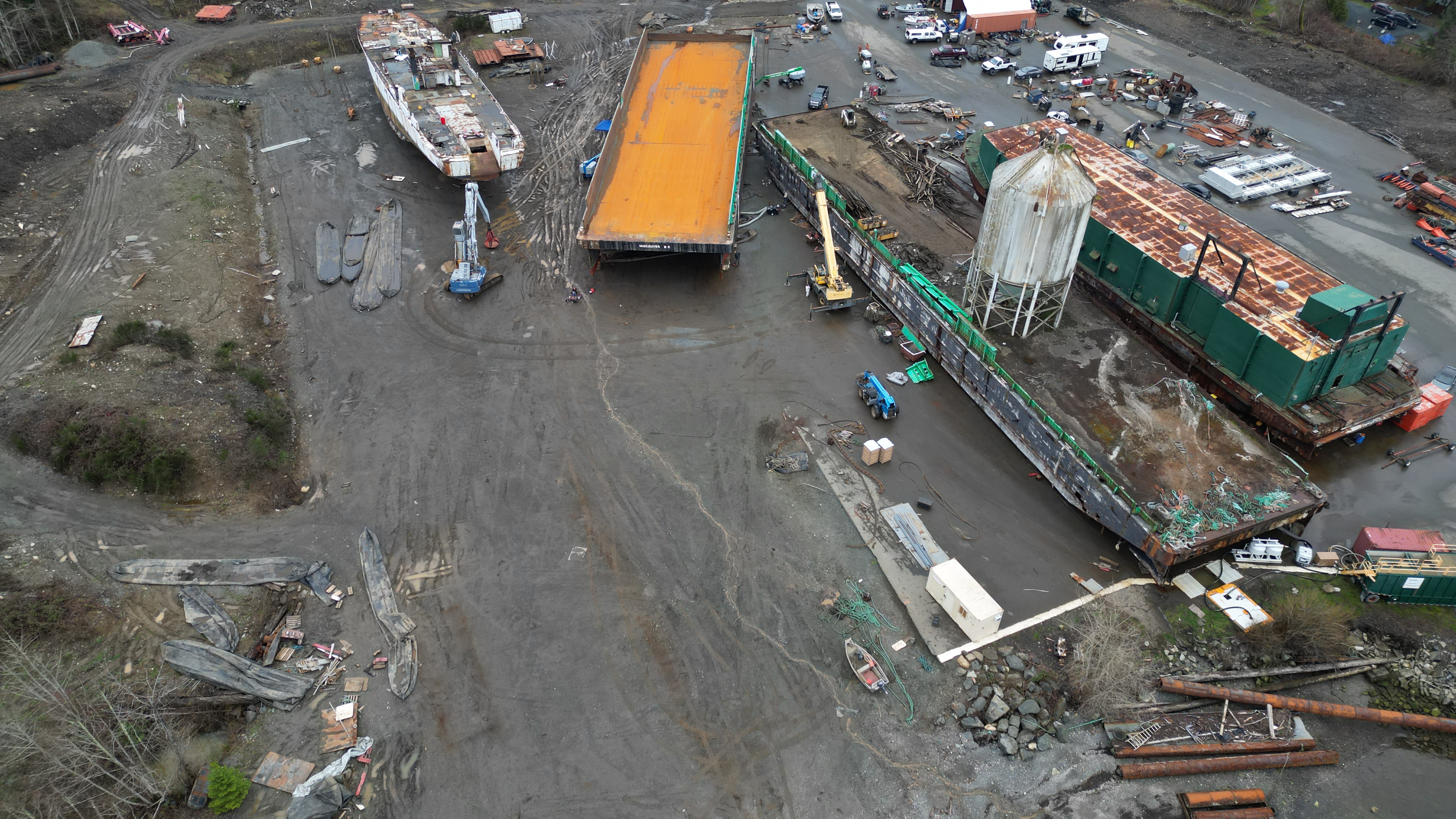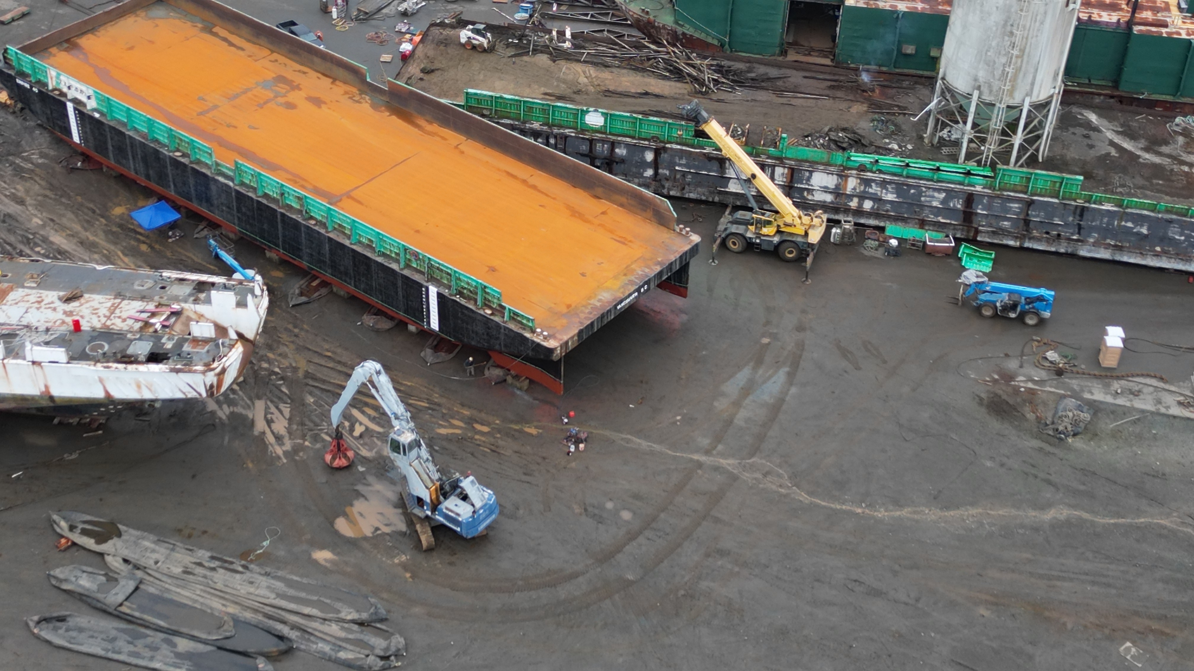 Keep an eye on the guy with the broom (?) around the newly painted barge. Watch as he uses it to wash the paint (?) away and into the flow draining into the ocean. You can see him in the beginning of the video working his way down. Out of sight, out of mind, right?