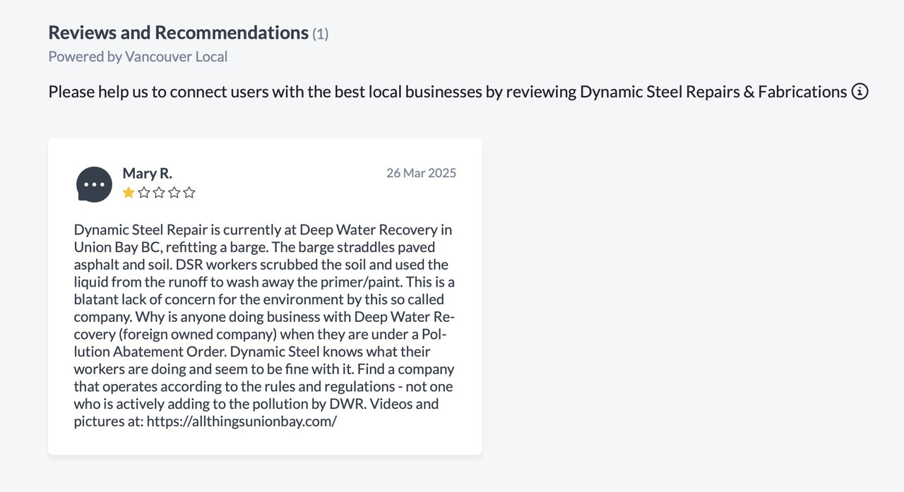 Area A Director, Convicted felon Robert Bohn Sr., CVRD, Deep Water Recovery LLC Union Bay, Deep Water Recovery Ship Breaking in Union Bay, Government, Prov. NDP government, Thugs, Union Bay Industries, Union Bay Ship Breaking