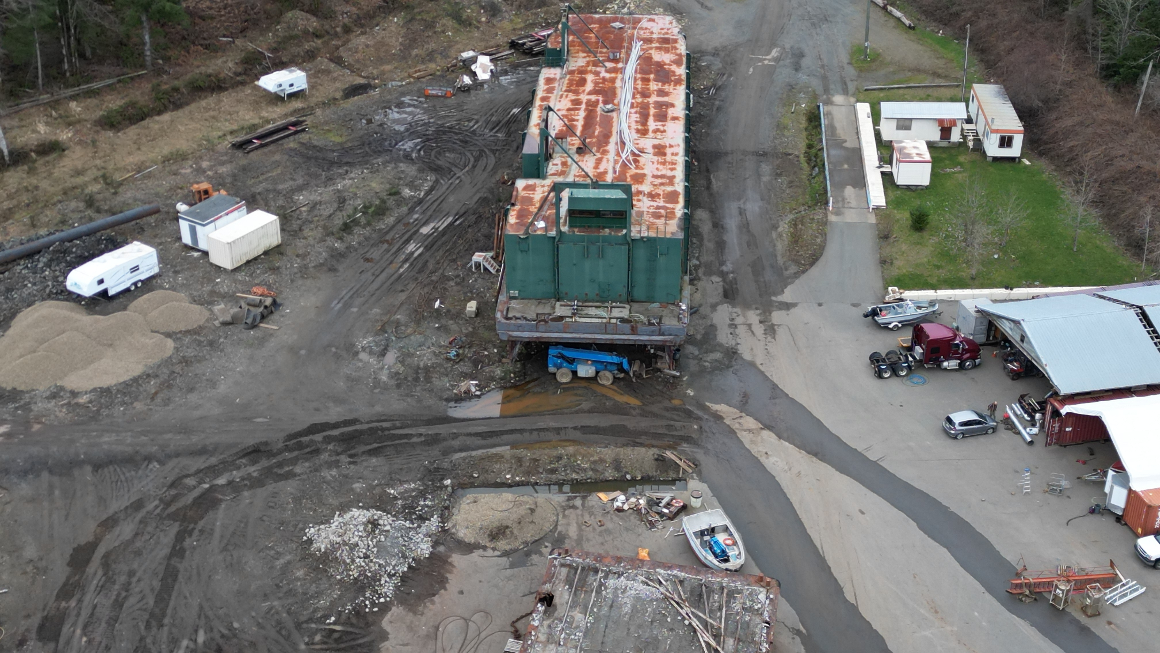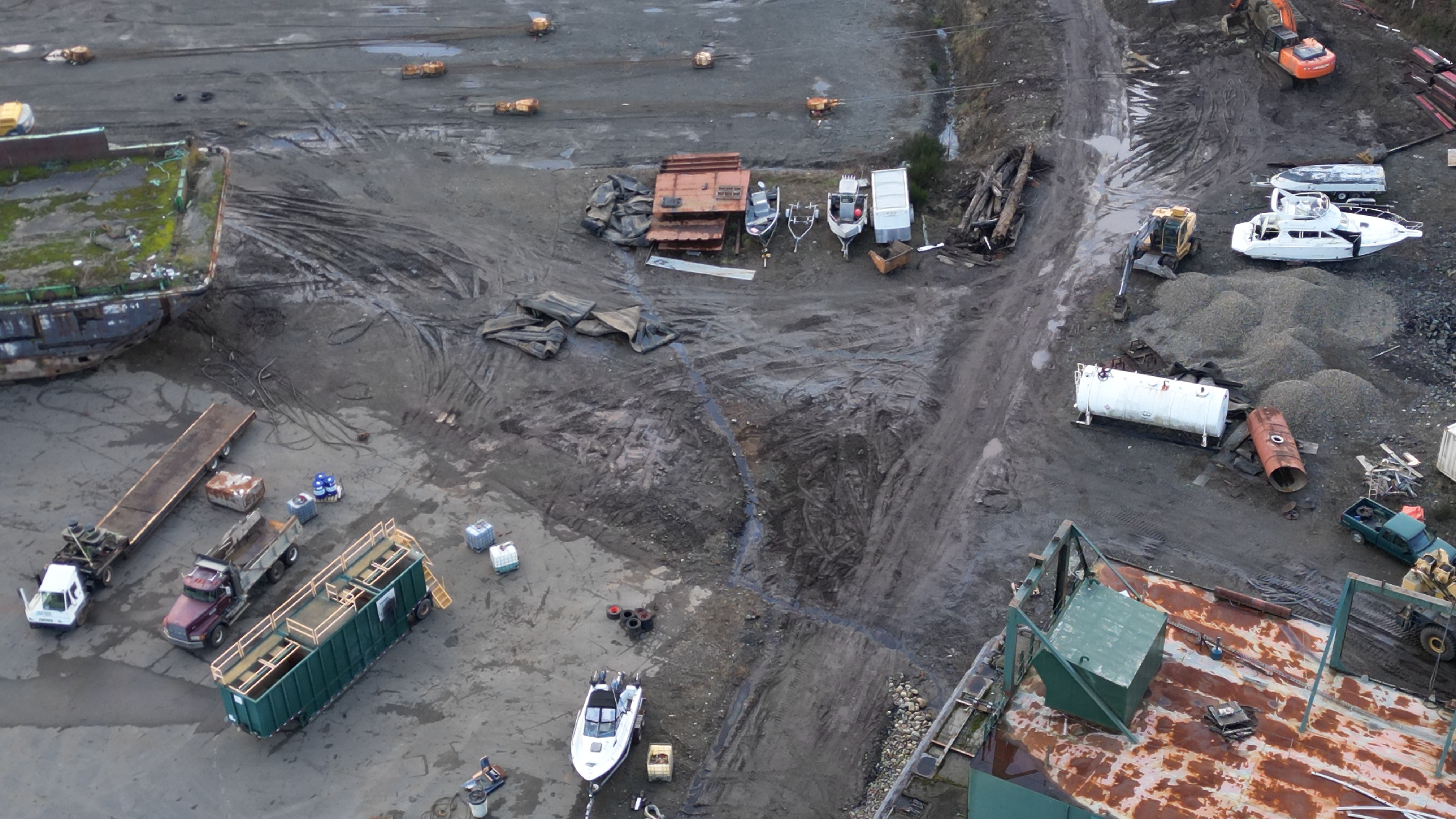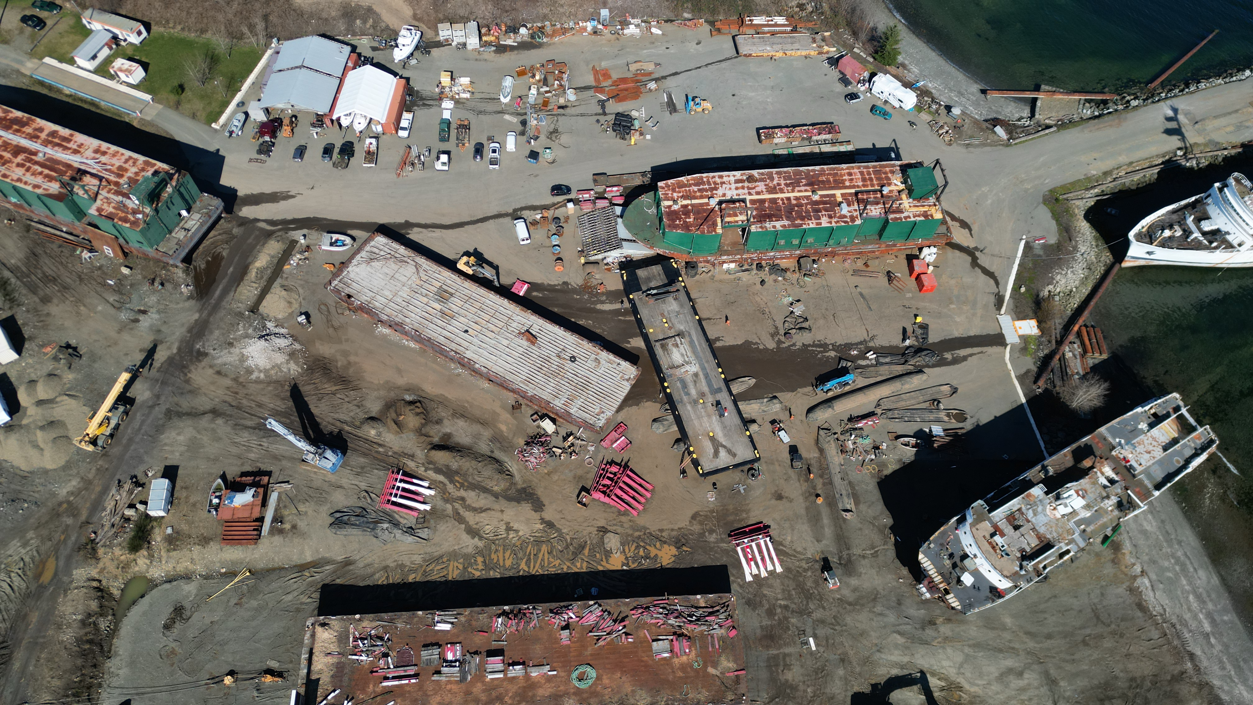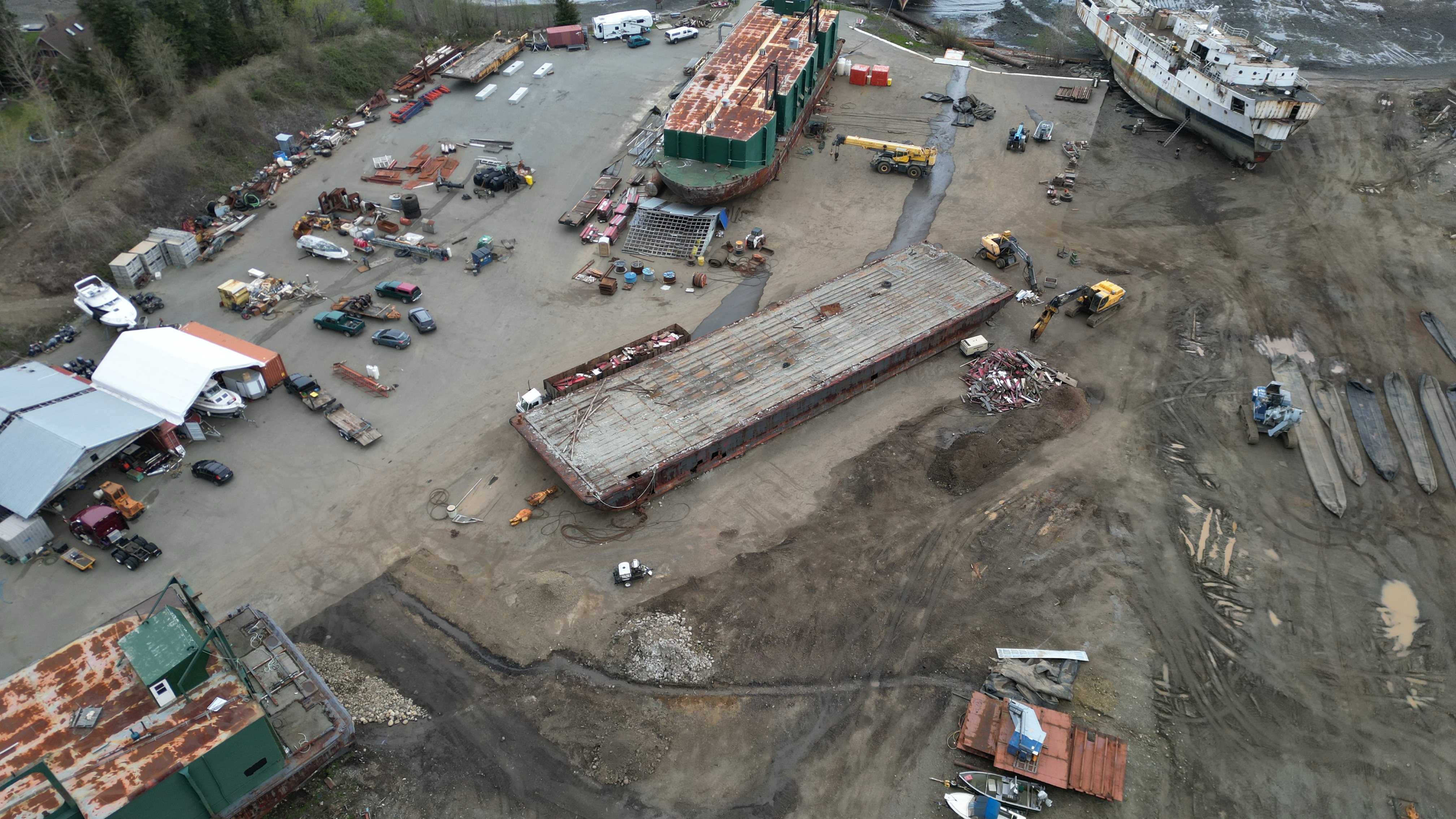 Late 2023. Liquid always flows from under upper green barge. Note concrete blocks and flow of liquid.