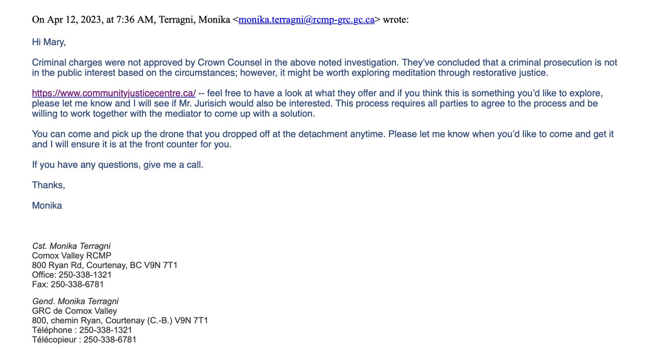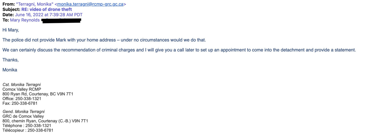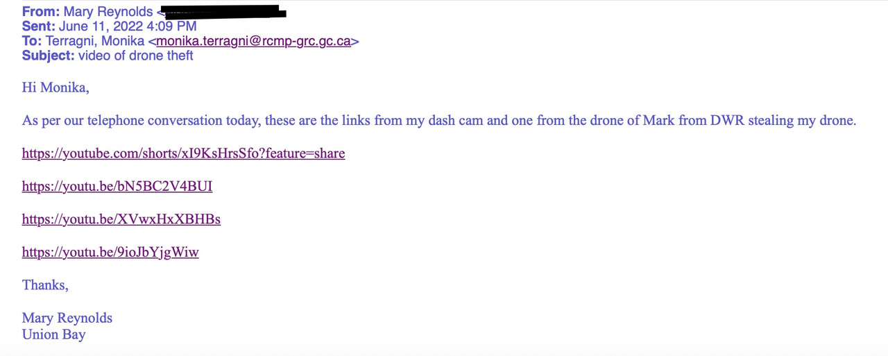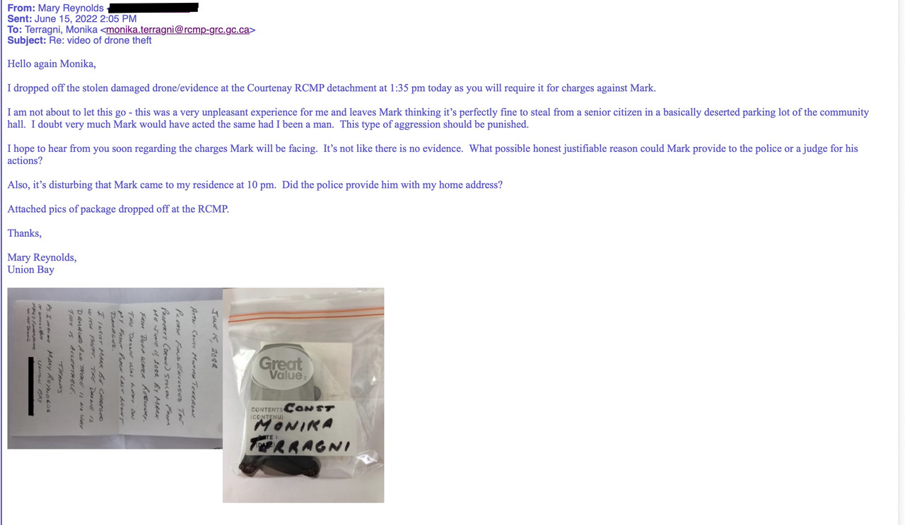 I contacted the RCMP after thug Jurisich robbed me around 1 pm on June 11/22 of my property (drone) and was told by the dispatcher an officer would respond. Const. Terragni called me and I explained what happened. She said she’d get back to me after speaking to Jurisich.