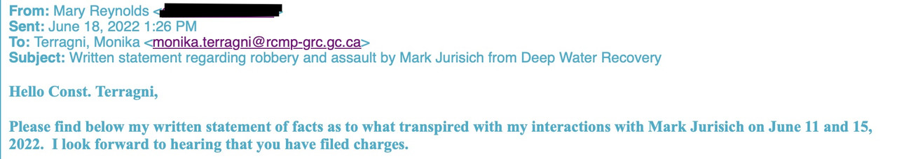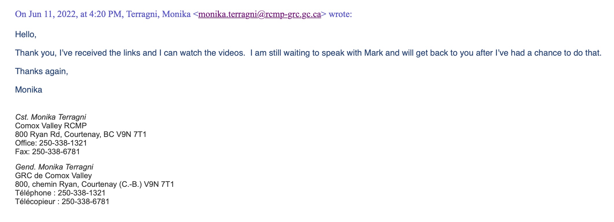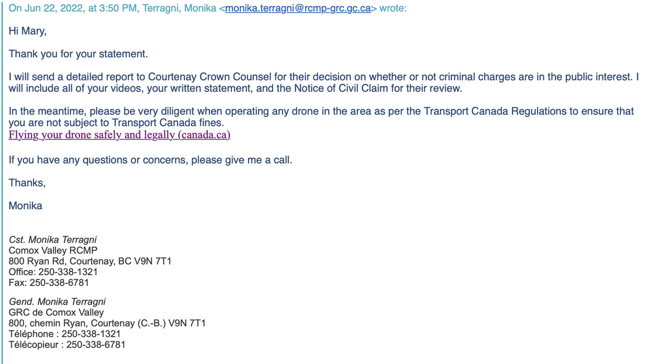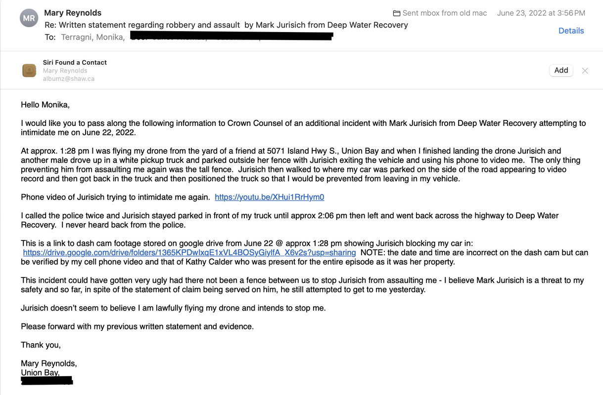 I contacted the RCMP after thug Jurisich robbed me around 1 pm on June 11/22 of my property (drone) and was told by the dispatcher an officer would respond. Const. Terragni called me and I explained what happened. She said she’d get back to me after speaking to Jurisich.