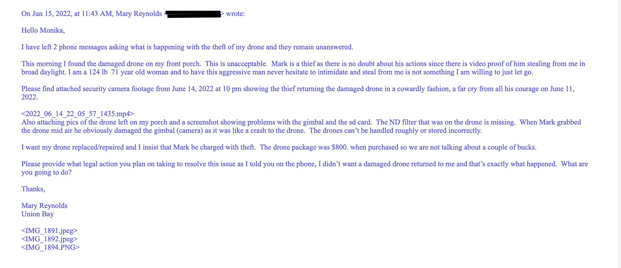 Here Terrani states “The police did not provide Mark with your home address – under no circumstances would we do that.” Ya, but you fucking told him to return the drone – where was he going to return it to if not my home? That was the instructions from Terragni to thug/thief Jurisich.