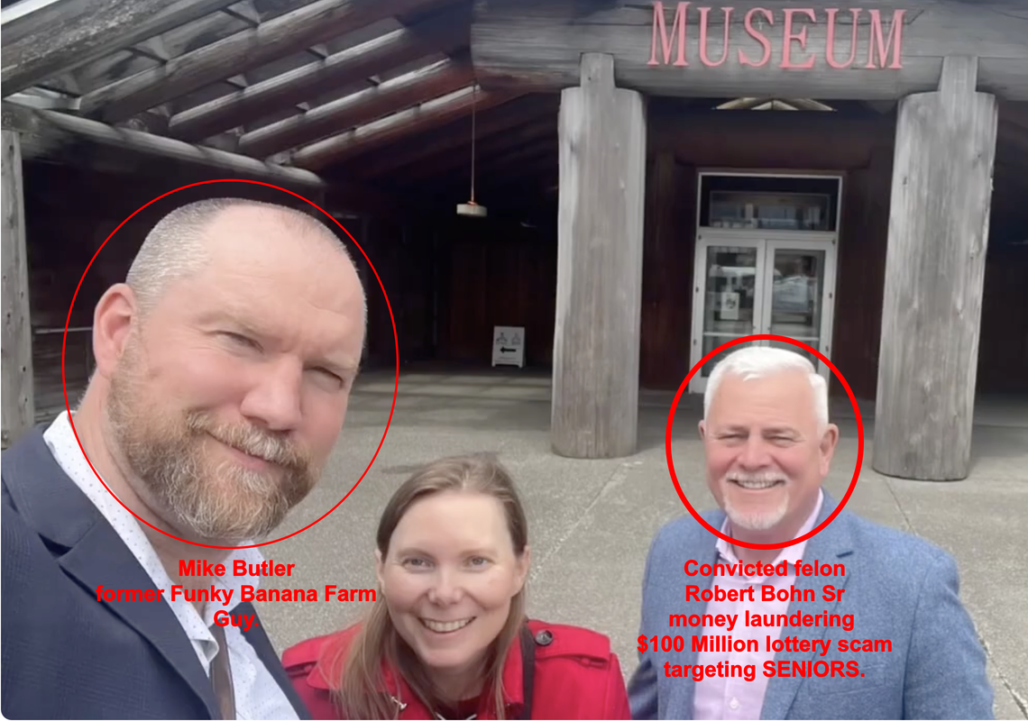 We need people to spread the word that these so called businesses set up by the funky banana guy Mike Butler and convicted money launderer, racketeering, $100 million lottery scam targeting seniors – Robert Bohn Sr. These guys are not your friends and are targeting Union Bay for this scam.