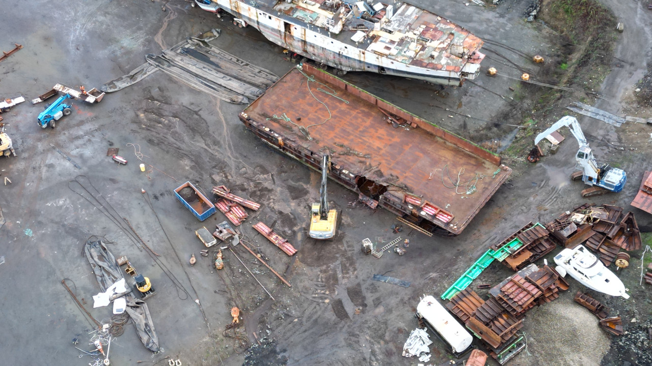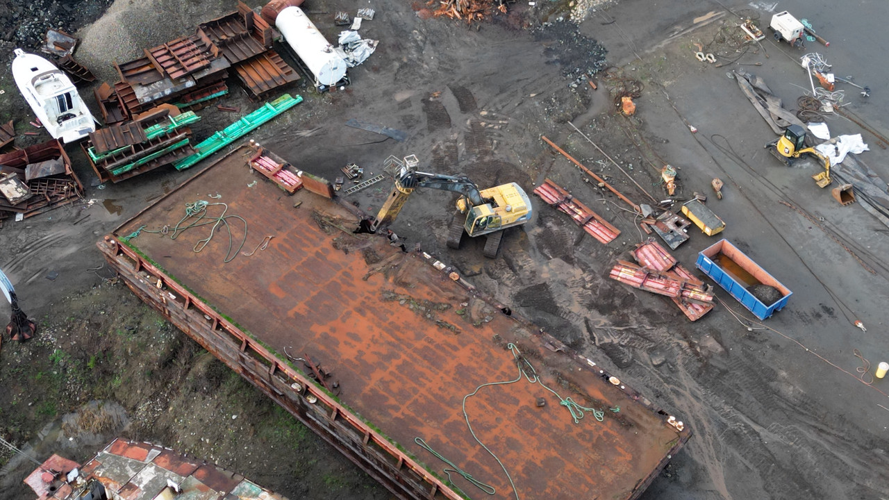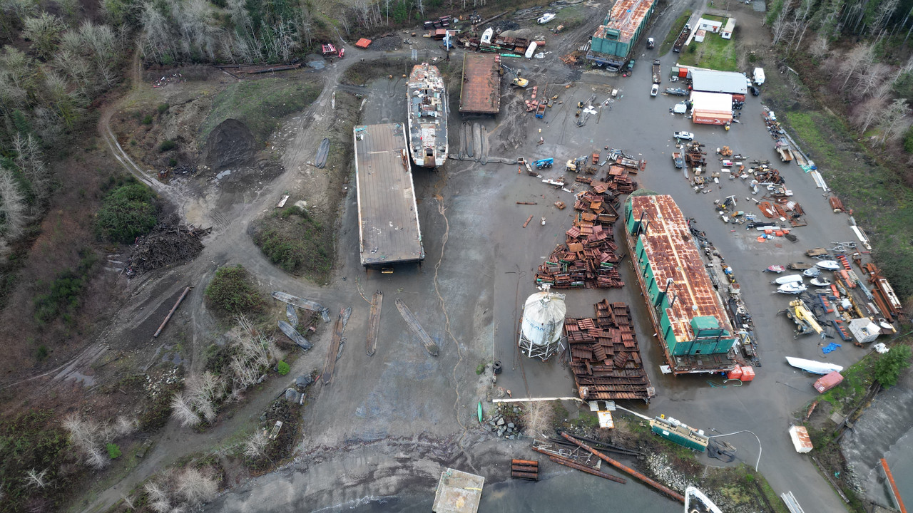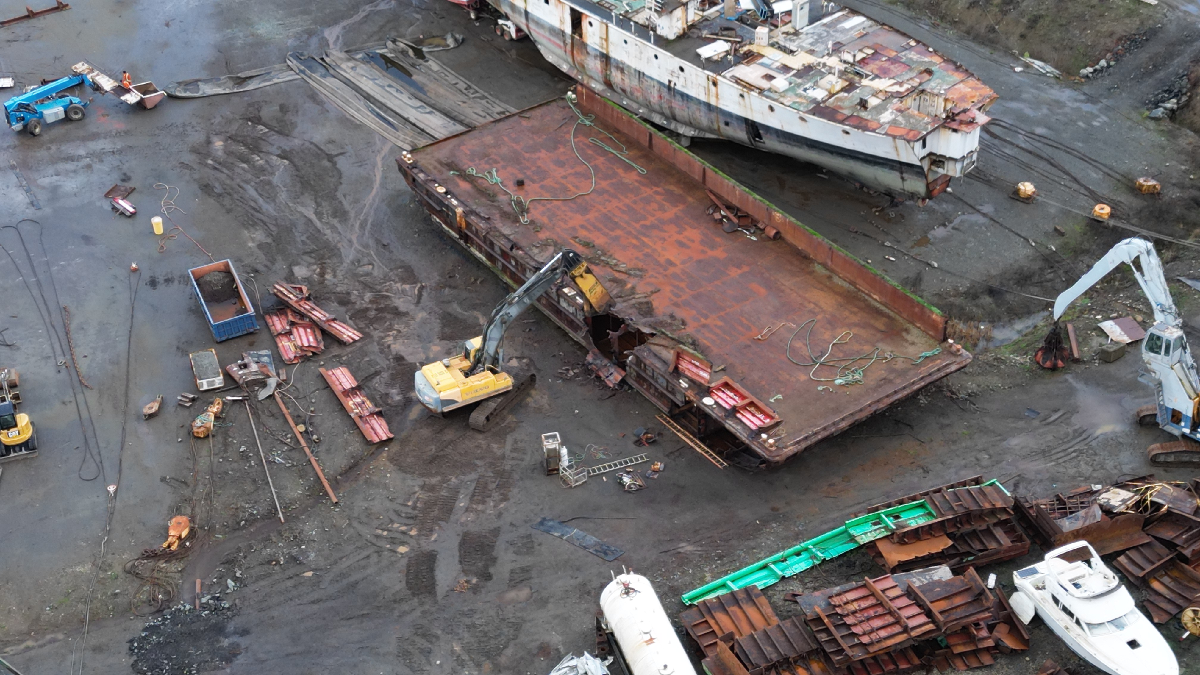 This is a good example of whether the laws we abide by as Canadians are optional because there seems to be no penalty for ignoring/breaking laws by this foreign owned, filthy, polluting ship breaking business. Zero penalties or consequences. They brought this rusty barge up after their foreshore lease was cancelled, so the trespassed. Now they’re ripping apart the rusty barge and grinding all the debris into the soil. Hello – is anyone out there?