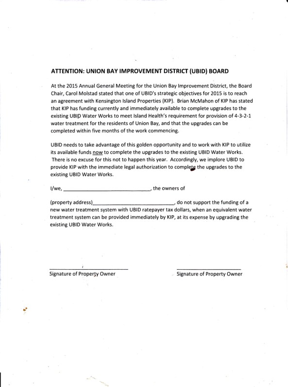 Landowners David Godfrey (former trustee), Peter Jacques, Glenn Loxam started campaigning on behalf of McMahon/KIP and circulate a petition demanding UBID give KIP an extension. Finally, former Trustee David Godfrey admitted the $1.9 Million gift in the agreement was actually an interest free loan. Only took him from 2011 to 2015 to come clean.