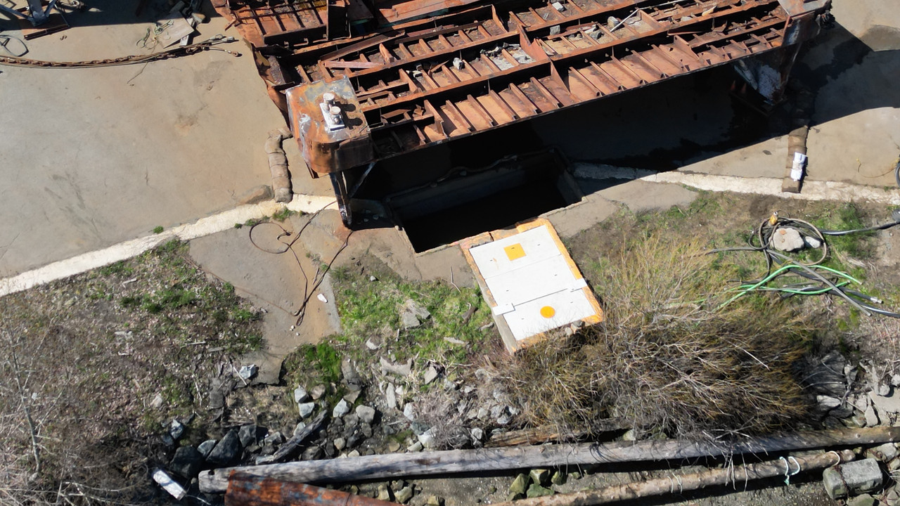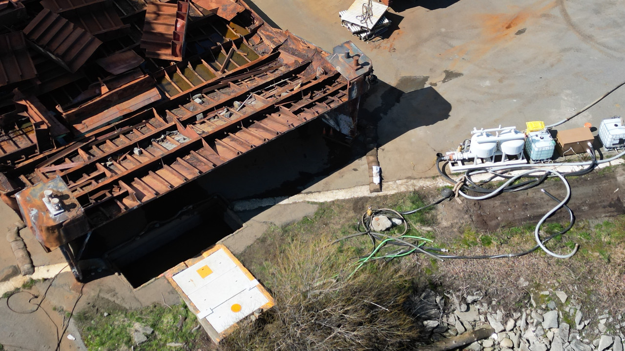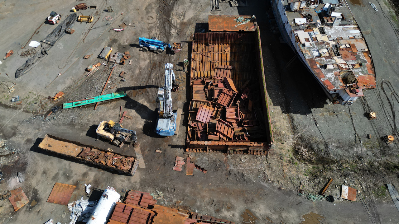 Note the square section removed from the lower green rusty barge used for storage. 🙂
