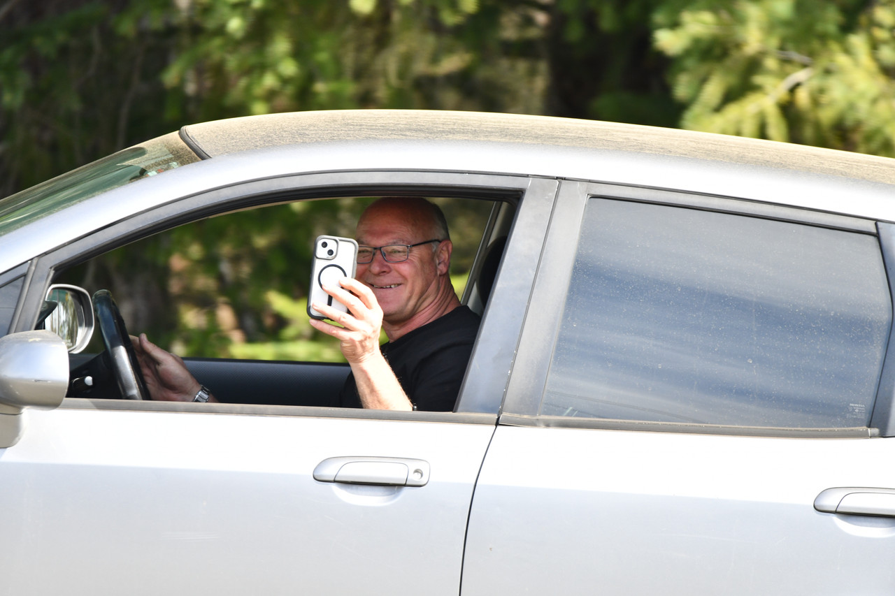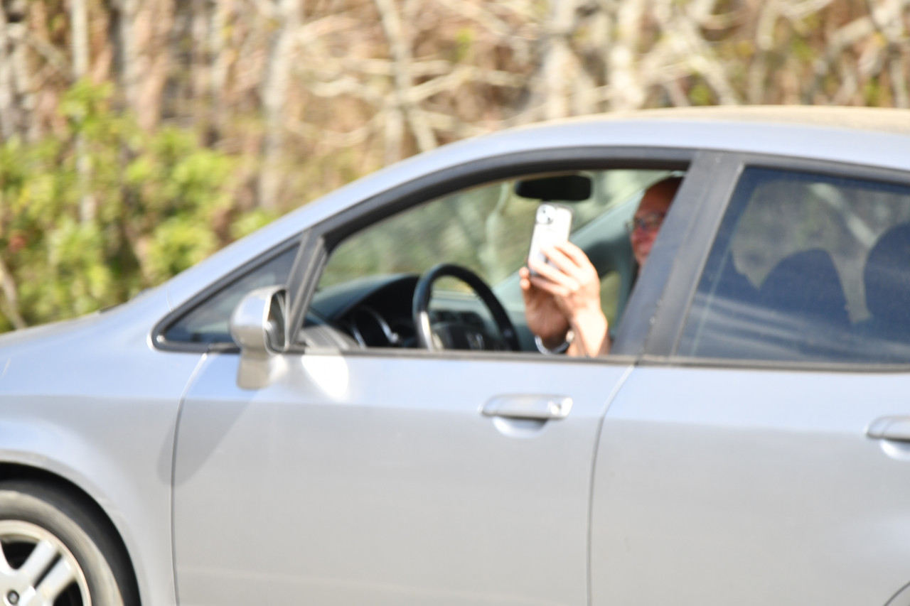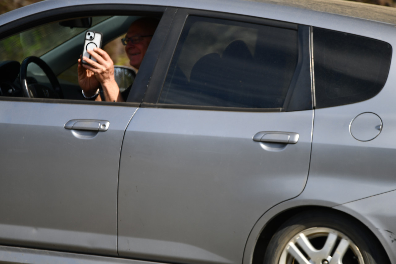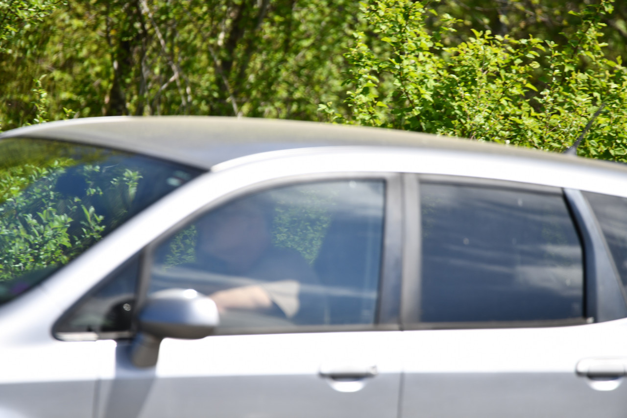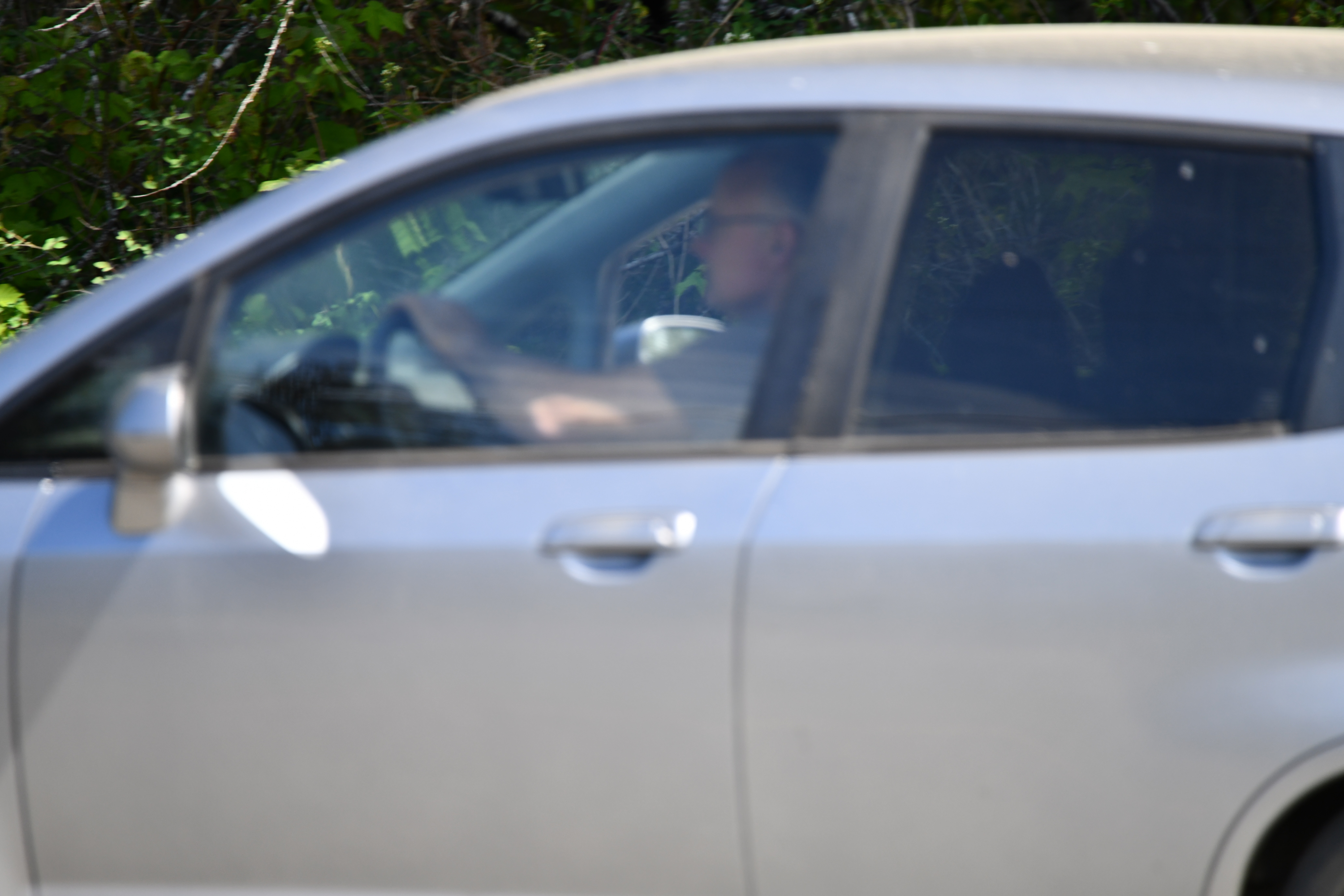 Today. Both hands on the wheel and the window rolled up, looking ahead in the direction he’s travelling. No more shit eating grin. Sad.